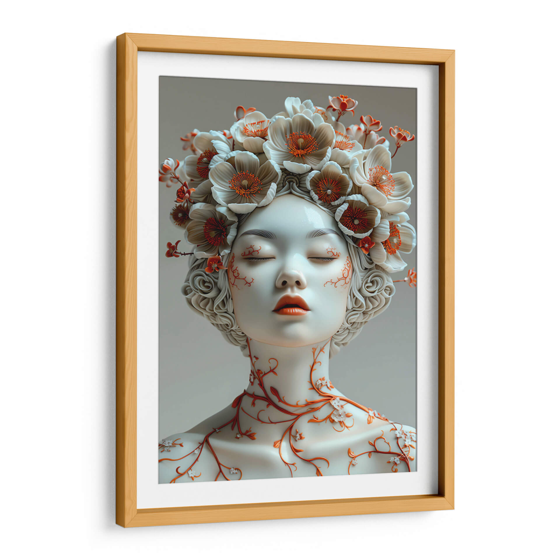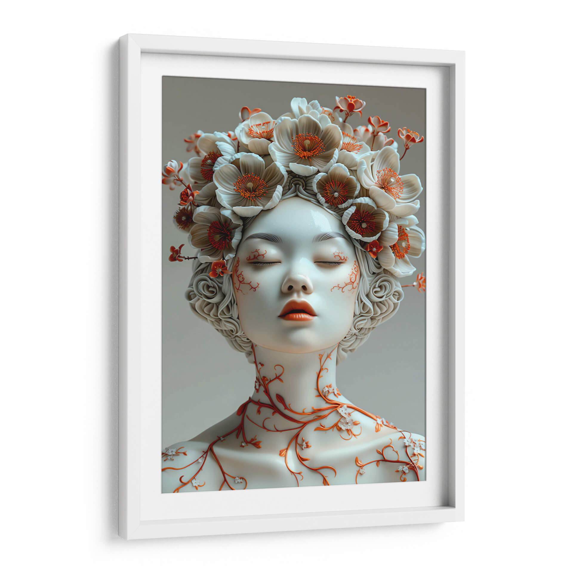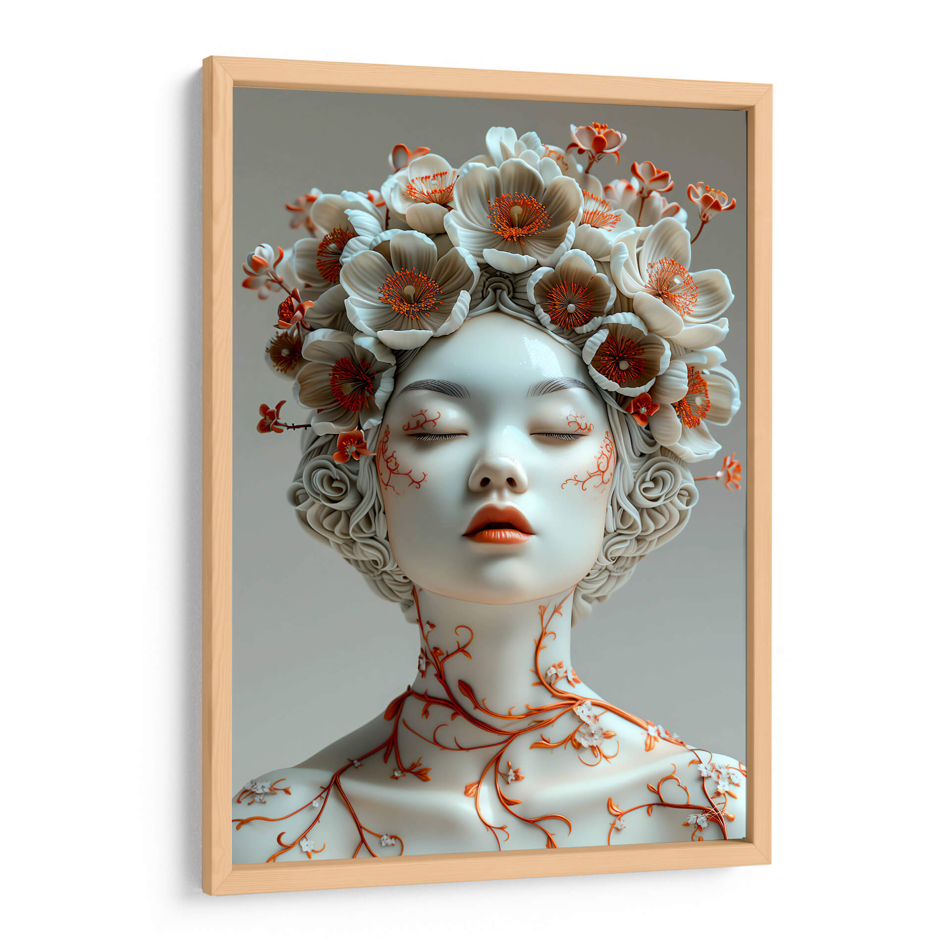 Sumérgete en la delicadeza y el misterio de "Sentimiento de Porcelana - 6", una obra de arte contemporáneo que evoca la fragilidad y la belleza efímera. Este cuadro decorativo presenta un retrato etéreo de una figura femenina con los ojos cerrados, adornada con una exuberante corona de flores en tonos blanco roto y acentos de naranja vibrante. Las delicadas enredaderas naranjas que serpentean por su cuello y mejillas añaden un toque orgánico y fascinante, contrastando sutilmente con la suavidad de la porcelana. La paleta de colores, dominada por blancos puros, grises suaves y toques cálidos de naranja, crea una atmósfera de serenidad y contemplación. El estilo artístico, que fusiona elementos realistas con un toque surrealista y etéreo, lo convierte en una pieza única para cualquier espacio que busque inspiración y un punto focal elegante. Ideal para dormitorios que buscan calma, salas de estar modernas que aprecian la sutileza o estudios que inspiran creatividad. "Sentimiento de Porcelana - 6" no es solo una decoración, es una invitación a la introspección y a la apreciación de la belleza en su forma más pura y delicada, aportando un aire de sofisticación atemporal a tu hogar u oficina.