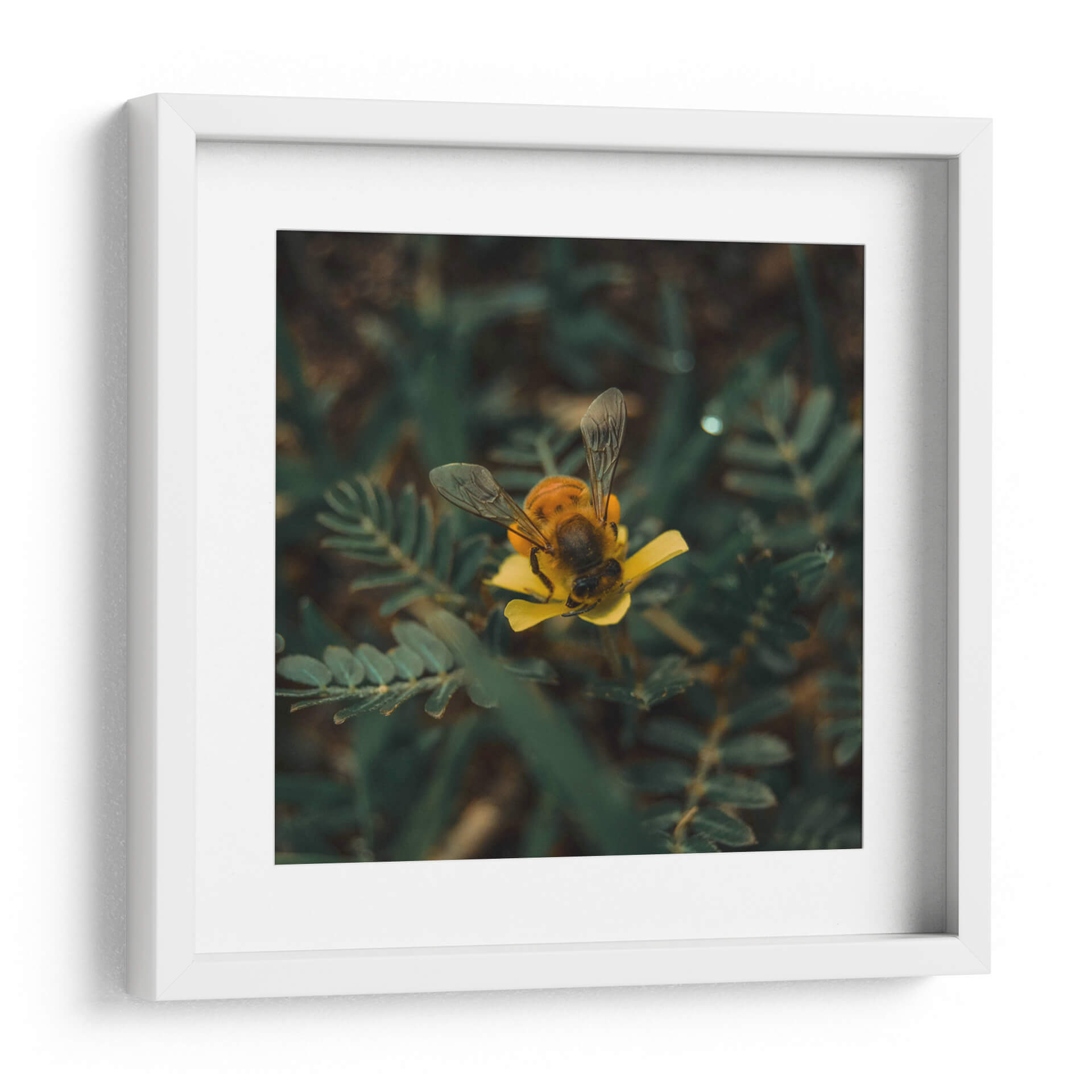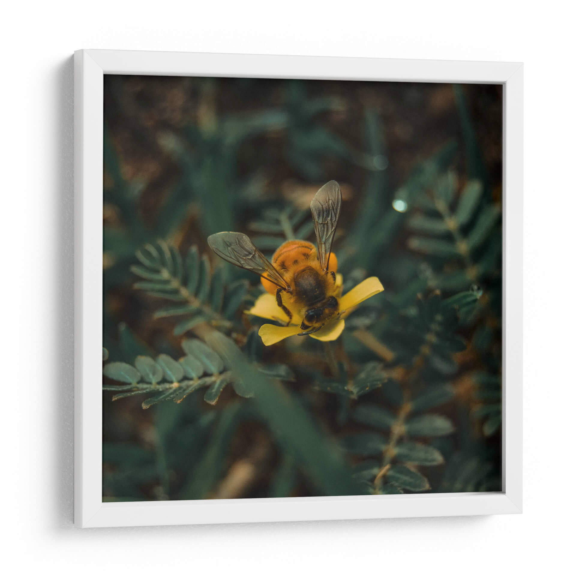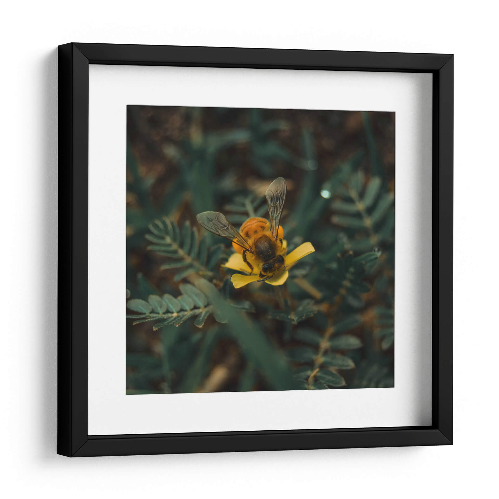 Sumérgete en la delicadeza de la naturaleza con este cautivador cuadro decorativo 'Abeja sobre flor v1'. La obra captura un momento íntimo y efímero donde una abeja, con sus alas translúcidas desplegadas, se posa con gracia sobre un vibrante pétalo amarillo. La fotografía macro resalta la textura detallada del insecto y la suavidad de la flor, creando una composición visualmente impactante. Los tonos profundos de verde del follaje circundante contrastan maravillosamente con el amarillo brillante de la flor y los matices dorados y oscuros del cuerpo de la abeja, aportando una sensación de vitalidad y realismo. Este cuadro es ideal para añadir un toque de vida y color a cualquier espacio, desde una sala de estar moderna hasta un rincón tranquilo en tu estudio u oficina. Su estilo fotográfico realista y la temática natural lo convierten en una pieza versátil que evoca calma, conexión con la naturaleza y la belleza de los pequeños detalles. Perfecto para amantes de la entomología, la botánica o simplemente para aquellos que aprecian la armonía cromática y la serenidad que transmite la vida silvestre en su máxima expresión. Un acierto seguro para infundir serenidad y un toque de color a tu decoración.