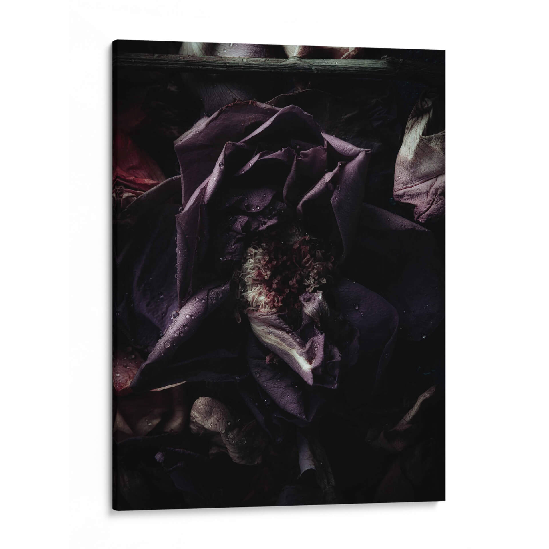 Sumérgete en la melancólica belleza de "Flor Marchita", una obra de arte que captura la delicadeza efímera de la naturaleza. Esta pieza, del artista Nacifilm, presenta una flor en su etapa final de vida, cuyas pétalos morados, arrugados y cubiertos de finas gotas de agua, evocan una profunda sensación de introspección y contemplación. La paleta de colores se centra en tonos oscuros y profundos, con sutiles toques de burdeos y los tonos pálidos del centro de la flor, creando un contraste dramático que atrae la mirada. La iluminación juega un papel crucial, resaltando las texturas y la fragilidad de los pétalos, mientras que el fondo oscuro envuelve la composición en un aura de misterio y serenidad. "Flor Marchita" es más que una simple imagen; es una meditación sobre la belleza en la decadencia, sobre la transformación y la aceptación. Este cuadro decorativo es ideal para espacios que buscan un toque de elegancia introspectiva, como un estudio, una biblioteca o un dormitorio tranquilo, añadiendo profundidad emocional y un punto focal sofisticado. Su estilo fotográfico y detallado, con una composición cercana y enfocada, permite apreciar cada sutileza y textura, invitando a la reflexión sobre el ciclo de la vida. Añade una dimensión poética a tu decoración con esta impactante obra de arte contemporáneo.