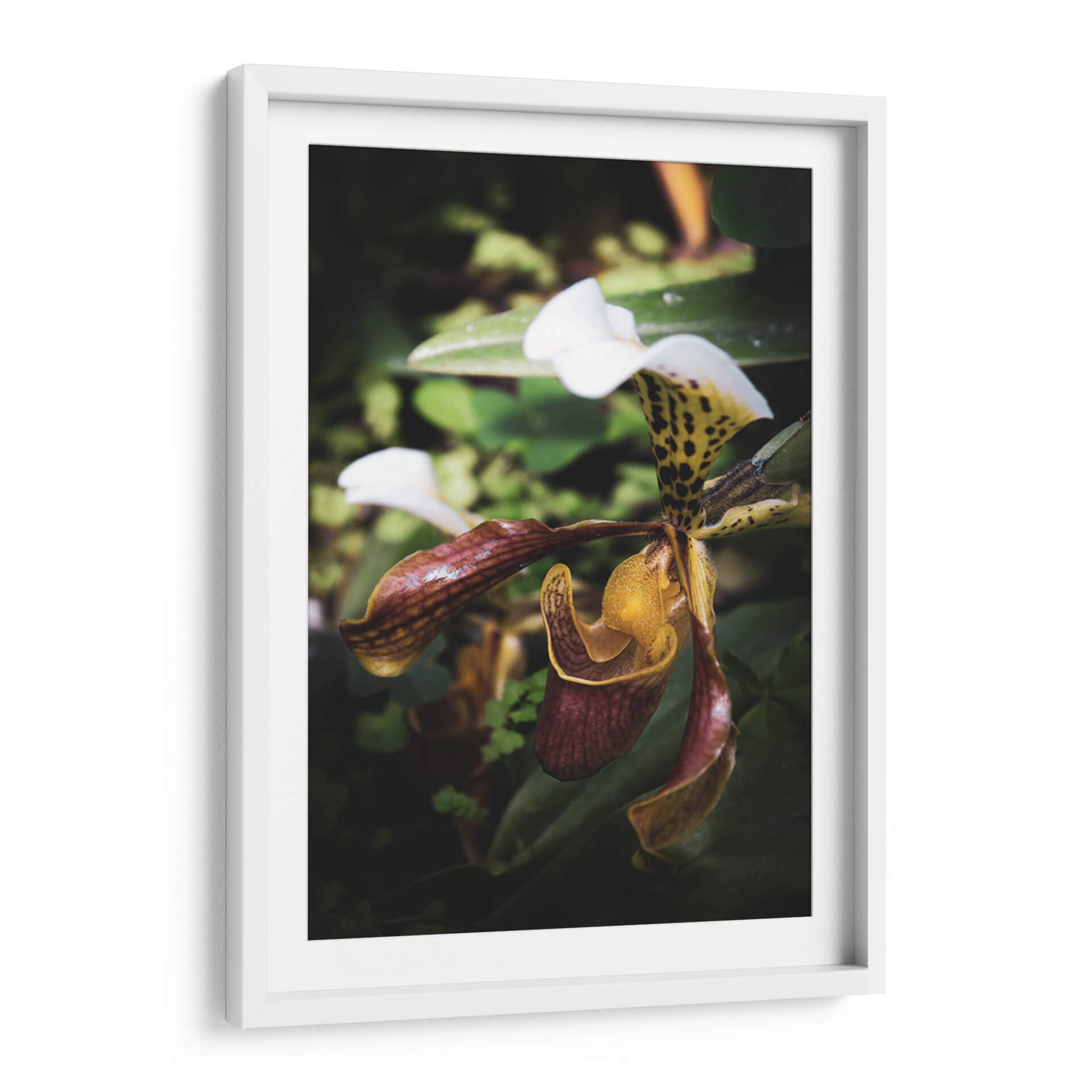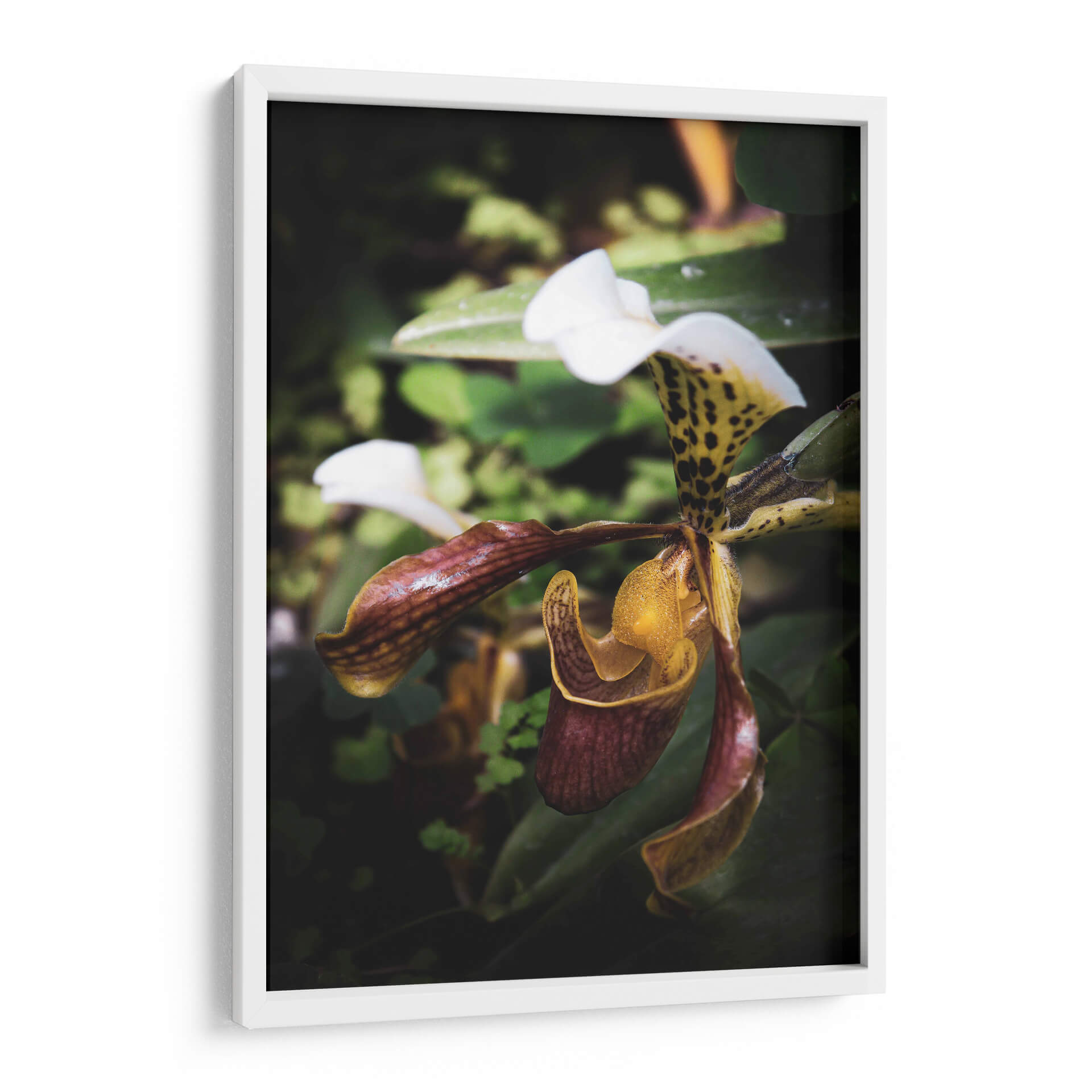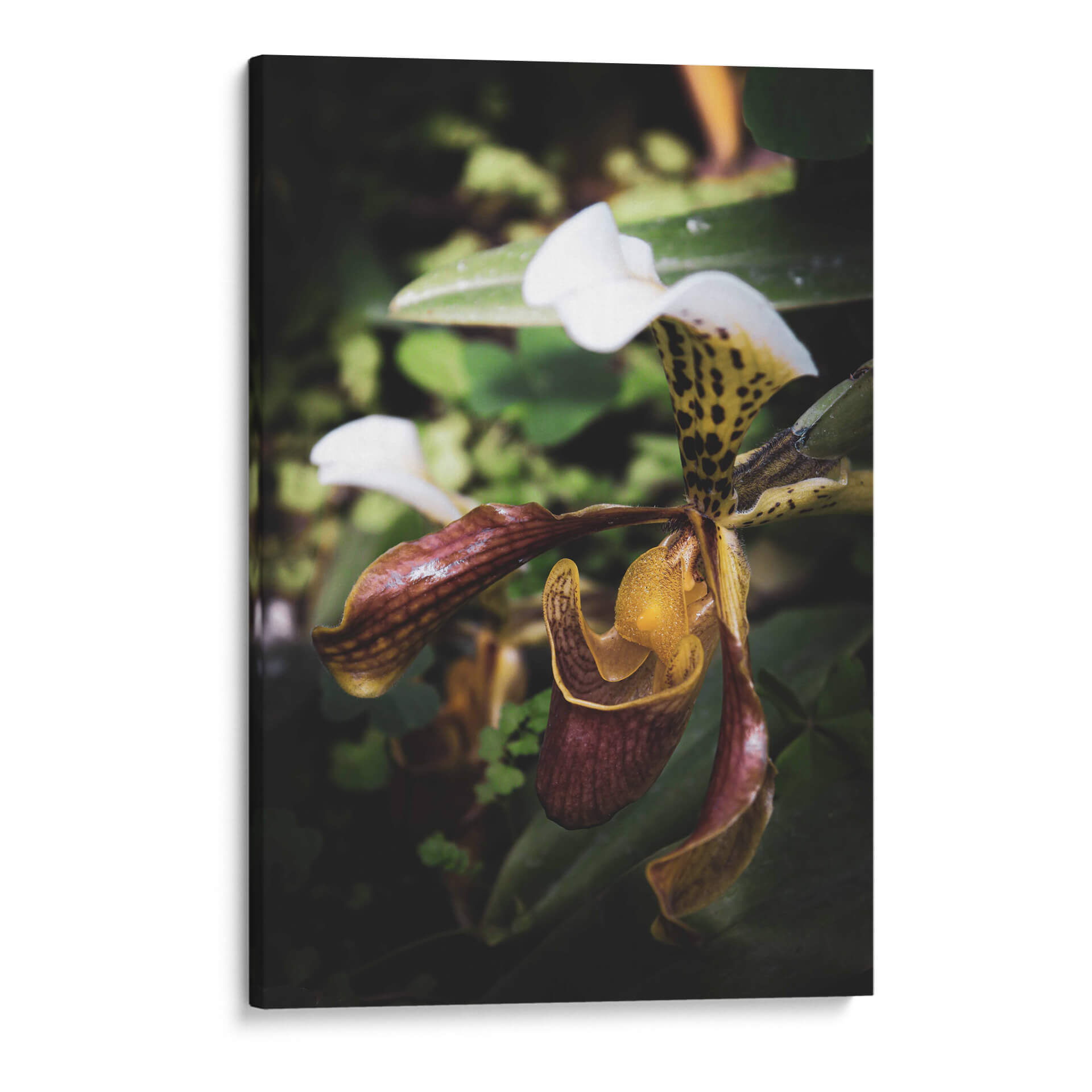 Embellece tu espacio con este cautivador cuadro decorativo de fotografía macro de orquídeas, una obra de arte que captura la delicada complejidad de la naturaleza. La pieza presenta un primer plano íntimo de una orquídea Paphiopedilum, destacando sus pétalos aterciopelados en tonos de borgoña, amarillo vibrante y crema, adornados con sutiles manchas oscuras. El fondo oscuro y frondoso, con hojas verdes profundas, crea un contraste dramático que resalta la singularidad de la flor, invitando a la contemplación y al asombro. La fotografía, ejecutada con maestría por Ani Coloca, trasciende la mera representación para evocar una sensación de misterio y elegancia exótica. Su estilo detallado y la iluminación suave resaltan las texturas y las formas orgánicas, haciendo de este cuadro una pieza central ideal para salas de estar, dormitorios o estudios que buscan un toque de sofisticación botánica. Añade un aire de refinamiento natural a tu decoración con esta impresionante imagen, perfecta para amantes de la botánica y el arte contemporáneo.