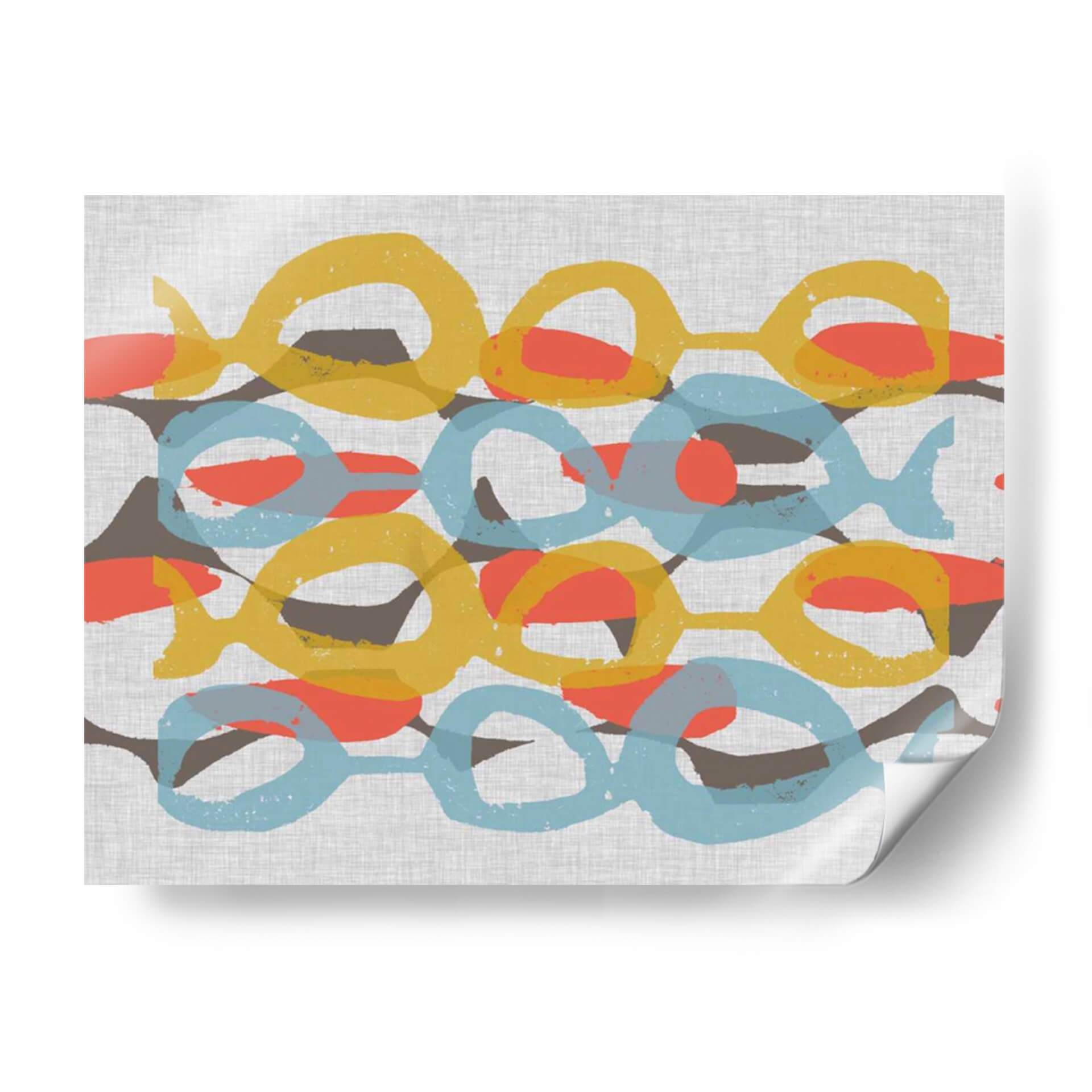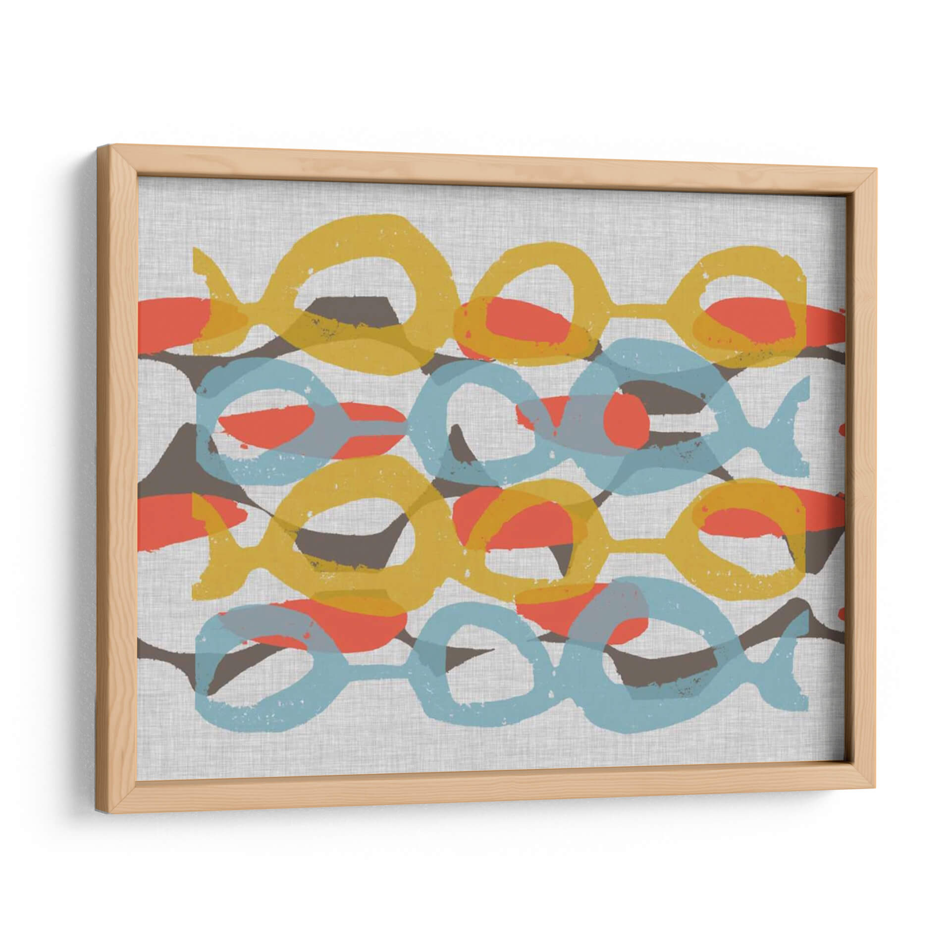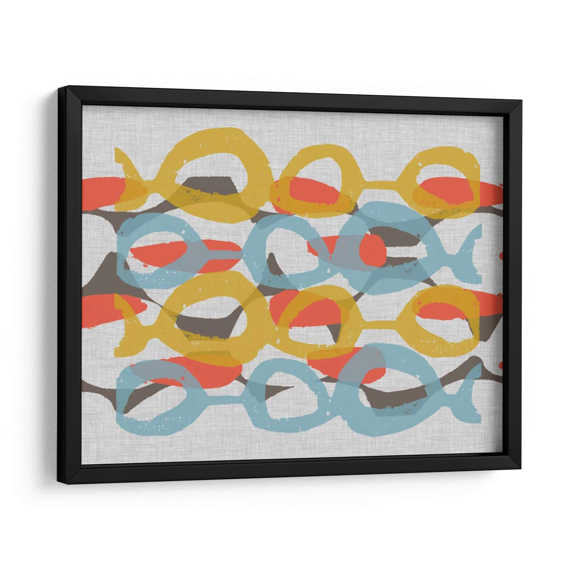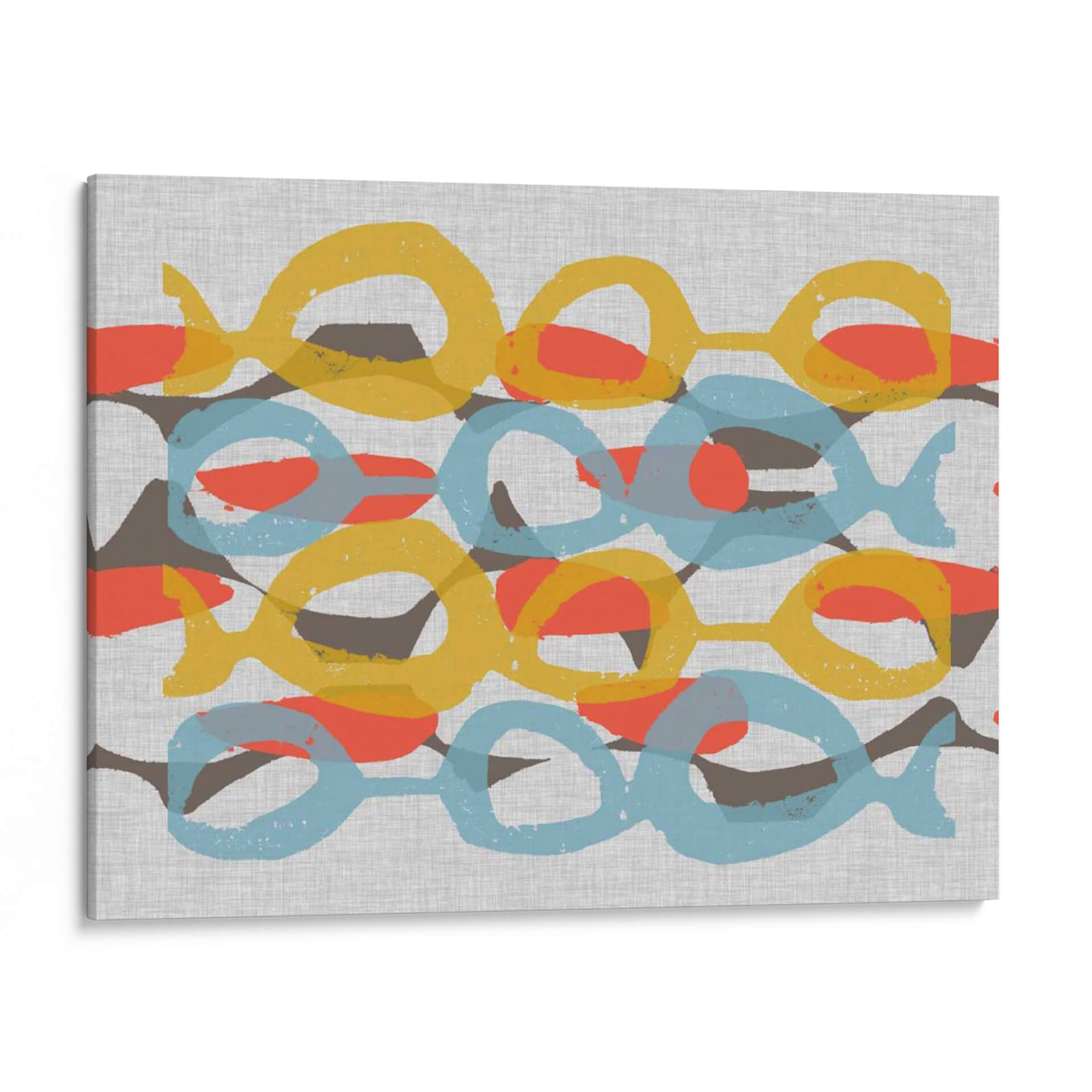 Aporta un toque de diseño retro y sofisticación a tu hogar con este cautivador cuadro decorativo abstracto, "Patrón De Mediados Del Siglo I" de Jennifer Goldberger. La obra se caracteriza por una composición dinámica de formas circulares y líneas entrelazadas, evocando la estética vibrante y optimista de mediados del siglo XX. La paleta de colores, cuidadosamente seleccionada, combina tonos cálidos de amarillo mostaza y coral vibrante con el frescor del azul cielo y la neutralidad del gris piedra, creando un equilibrio visual armonioso. El fondo texturizado similar a la tela añade profundidad y una sensación táctil a la pieza. Este cuadro abstracto es perfecto para inyectar personalidad en cualquier espacio, desde una sala de estar moderna hasta un estudio o una oficina. Su diseño geométrico y su aire juguetón invitan a la conversación y añaden un punto focal de interés que complementa una amplia gama de estilos decorativos, desde el escandinavo hasta el ecléctico.
