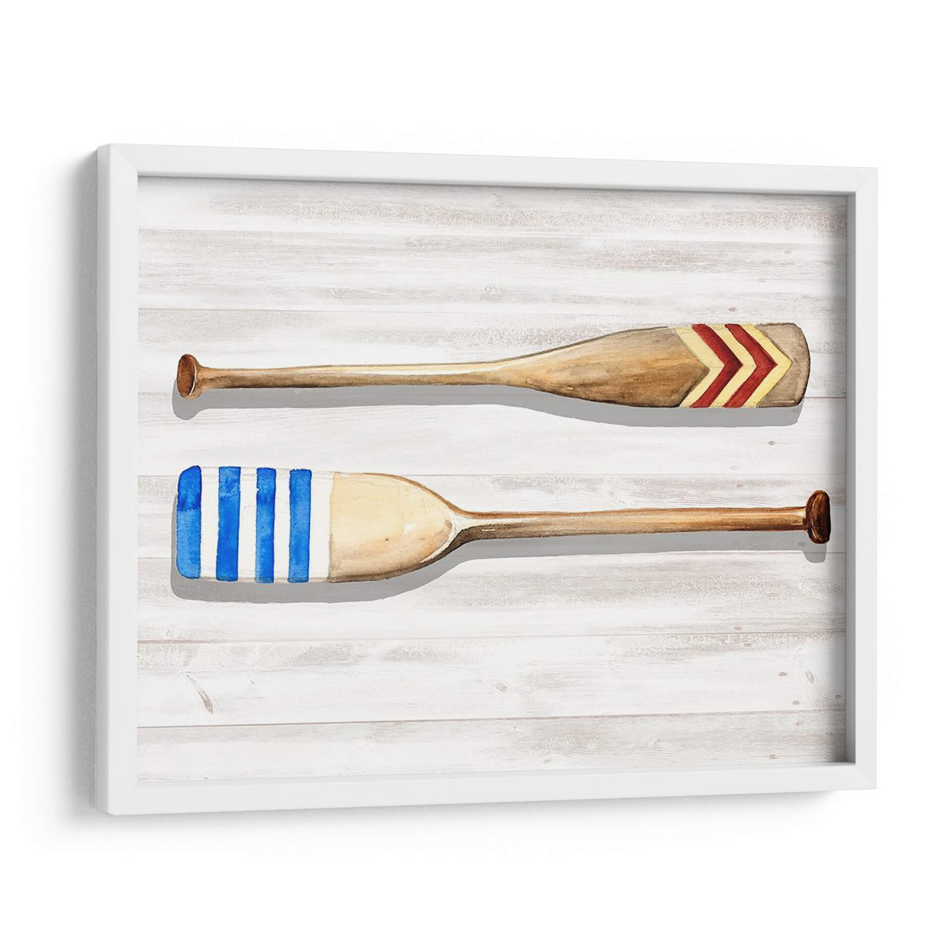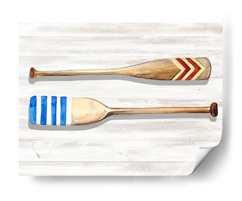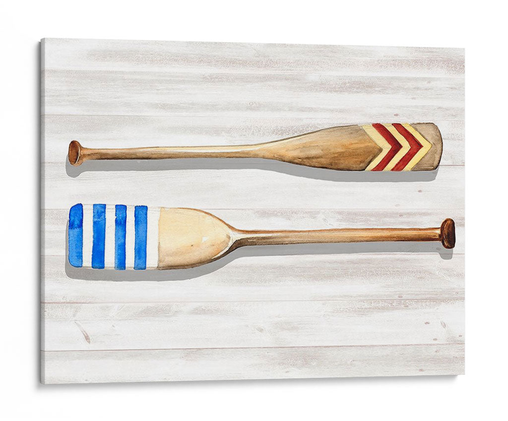 Sumérgete en la serenidad costera con 'Personal Legacy II', una cautivadora obra de arte que evoca la tranquilidad del mar y la nostalgia de días pasados. Este cuadro decorativo presenta dos remos de madera apoyados sobre un fondo de tablones de madera blanqueados, simulando el ambiente de un muelle o una cabaña junto al lago. El remo superior está adornado con un diseño chevron en tonos rojos y dorados, mientras que el inferior luce vibrantes rayas azules y blancas, un guiño al estilo náutico clásico. La técnica de acuarela utilizada por Jennifer Paxton Parker imparte una delicadeza etérea y un toque artístico a la pieza, creando una atmósfera relajante y acogedora. Los colores suaves y la composición equilibrada hacen de este cuadro una adición perfecta para cualquier espacio que busque un toque de encanto rústico y elegancia costera. Ideal para salones, dormitorios o incluso un estudio, este cuadro decorativo inspira calma y evoca recuerdos de aventuras acuáticas y veranos despreocupados. Transforma tu hogar en un refugio de paz con esta pieza única que celebra la simplicidad y la belleza de la vida junto al agua, aportando un aire de sofisticación relajada a tu decoración.