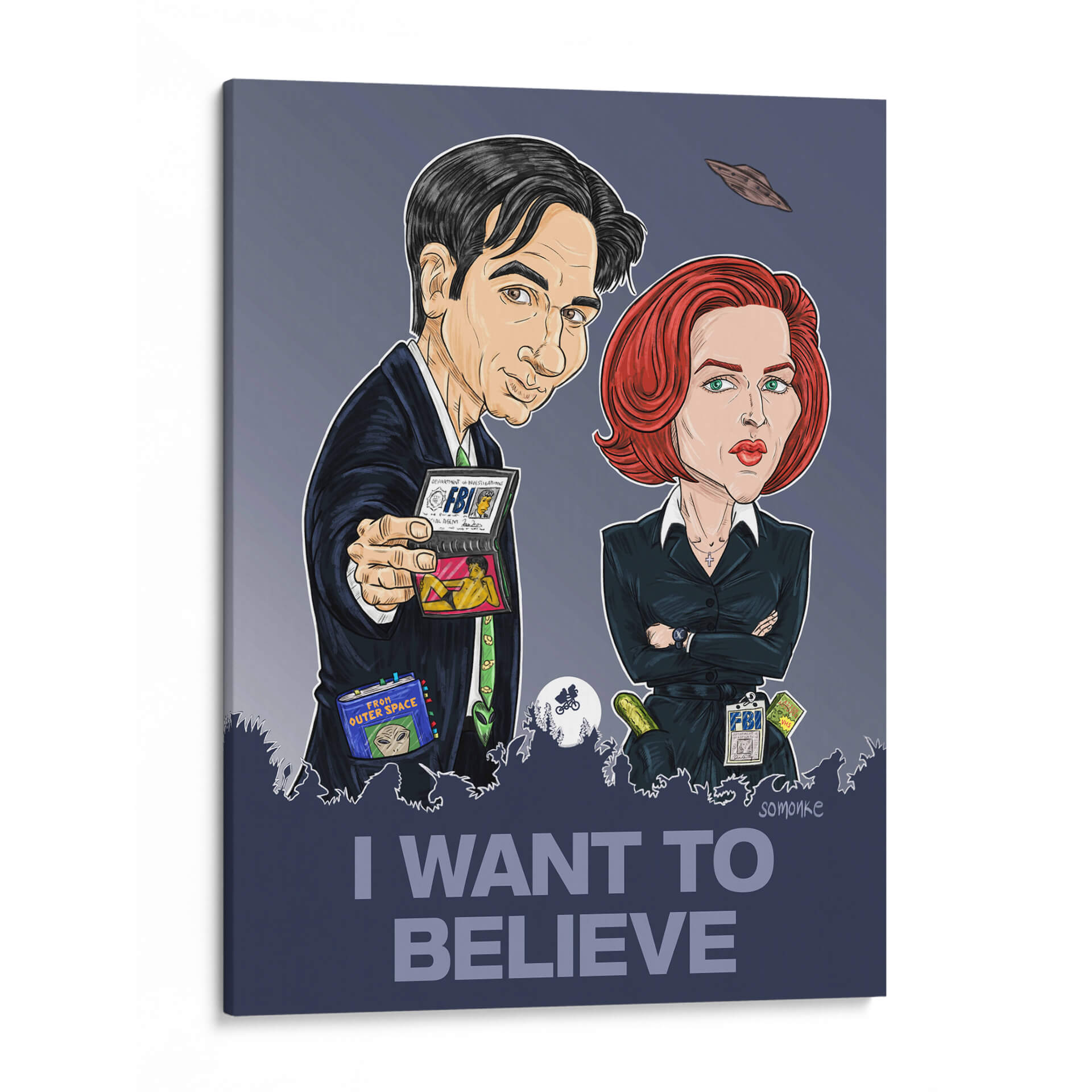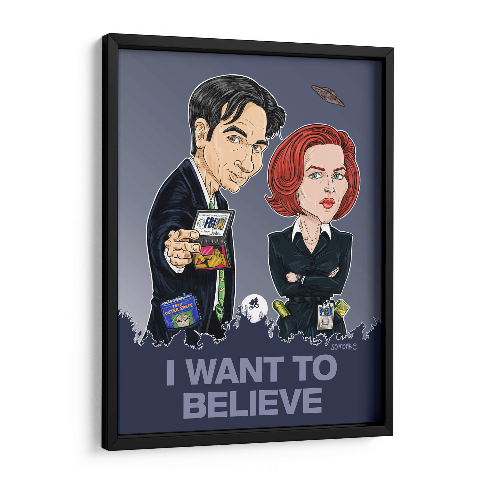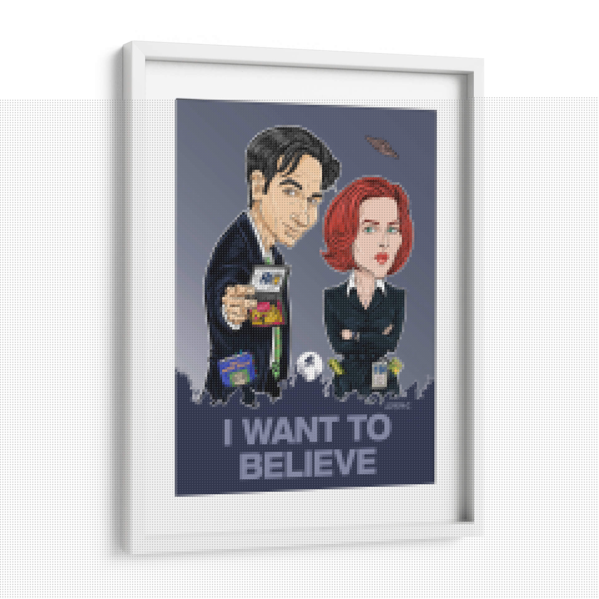 Captura la esencia del misterio y lo inexplicable con este cautivador cuadro decorativo "Quiero Creer". La obra presenta una representación estilizada y llena de carácter de dos icónicos agentes, evocando el espíritu de la investigación de fenómenos paranormales. Con una paleta de colores predominantemente oscura y contrastes marcados, esta pieza de arte contemporáneo añade un toque de intriga a cualquier espacio. Las sutiles referencias a ovnis y la icónica frase "I WANT TO BELIEVE" en la parte inferior invitan a la reflexión y a la imaginación, convirtiéndolo en un punto focal ideal para salas de estar, oficinas o estudios. Su estilo gráfico y caricaturesco, combinado con un trasfondo sombrío, lo hace perfecto para aquellos que aprecian lo peculiar y lo extraordinario. Este cuadro decorativo no solo embellece tu pared, sino que también sirve como un recordatorio lúdico de las maravillas ocultas en el universo. Ideal para fans de la ciencia ficción y el misterio, o para cualquiera que busque una pieza de conversación única que despierte la curiosidad y el asombro, esta obra de arte es una adición distintiva a cualquier colección.