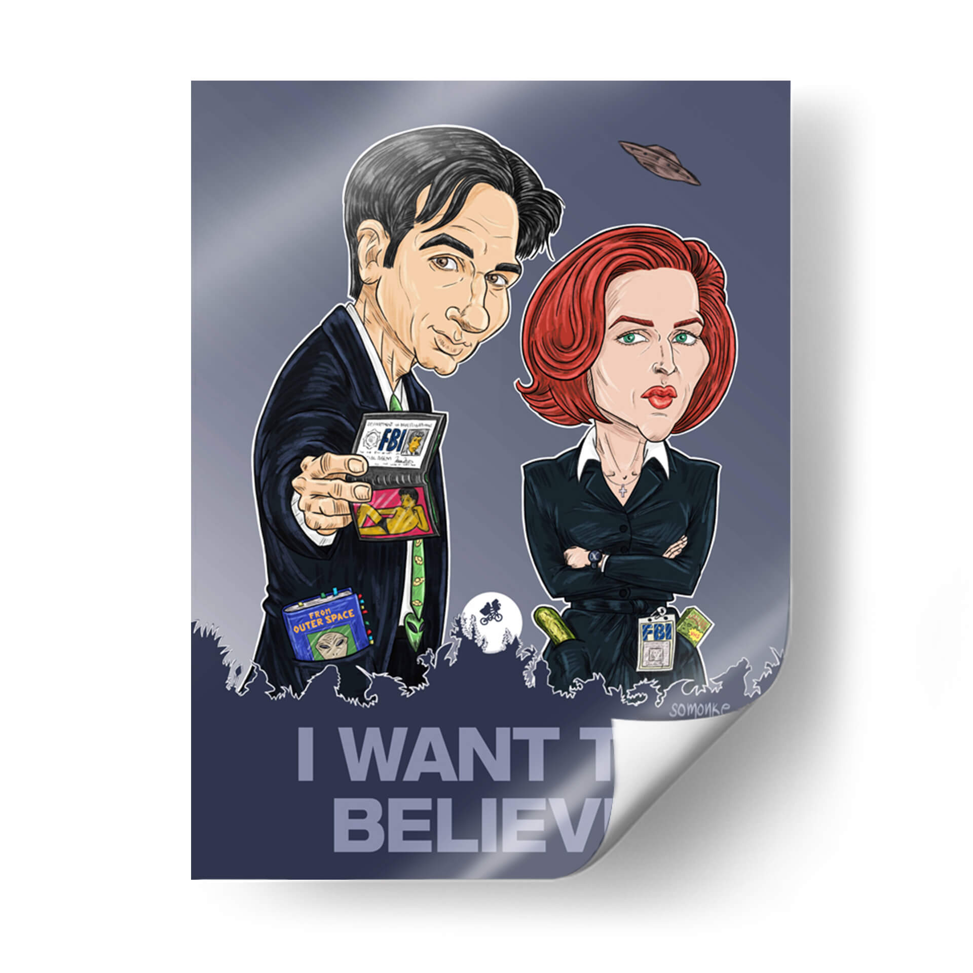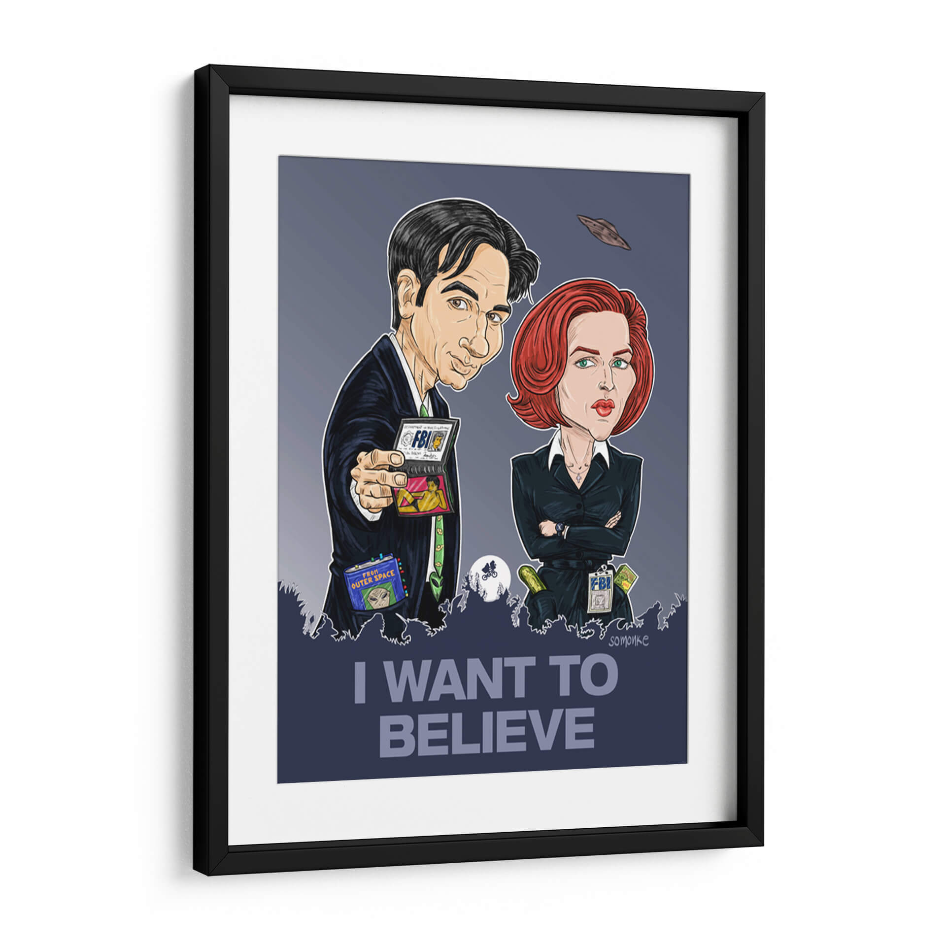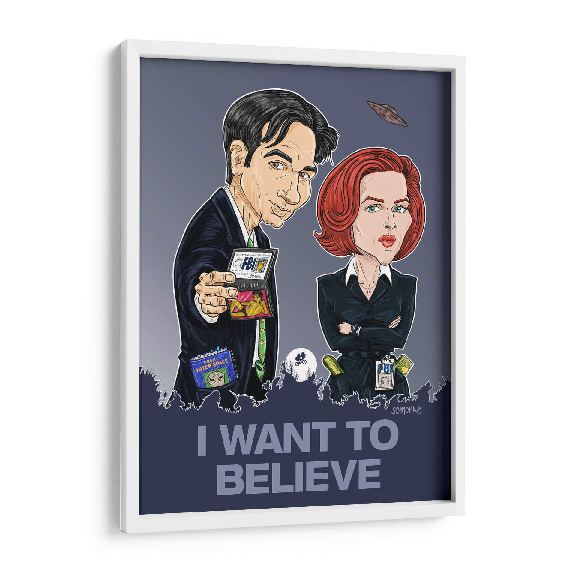 Captura la esencia del misterio y lo inexplicable con este cautivador cuadro decorativo "Quiero Creer". La obra presenta una representación estilizada y llena de carácter de dos icónicos agentes, evocando el espíritu de la investigación de fenómenos paranormales. Con una paleta de colores predominantemente oscura y contrastes marcados, esta pieza de arte contemporáneo añade un toque de intriga a cualquier espacio. Las sutiles referencias a ovnis y la icónica frase "I WANT TO BELIEVE" en la parte inferior invitan a la reflexión y a la imaginación, convirtiéndolo en un punto focal ideal para salas de estar, oficinas o estudios. Su estilo gráfico y caricaturesco, combinado con un trasfondo sombrío, lo hace perfecto para aquellos que aprecian lo peculiar y lo extraordinario. Este cuadro decorativo no solo embellece tu pared, sino que también sirve como un recordatorio lúdico de las maravillas ocultas en el universo. Ideal para fans de la ciencia ficción y el misterio, o para cualquiera que busque una pieza de conversación única que despierte la curiosidad y el asombro, esta obra de arte es una adición distintiva a cualquier colección.
