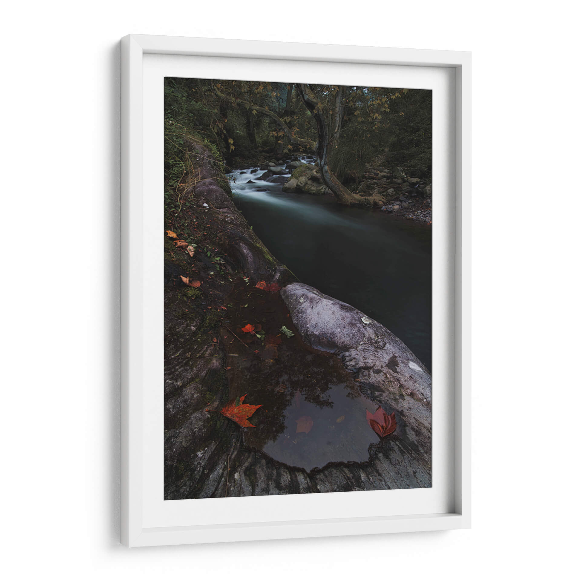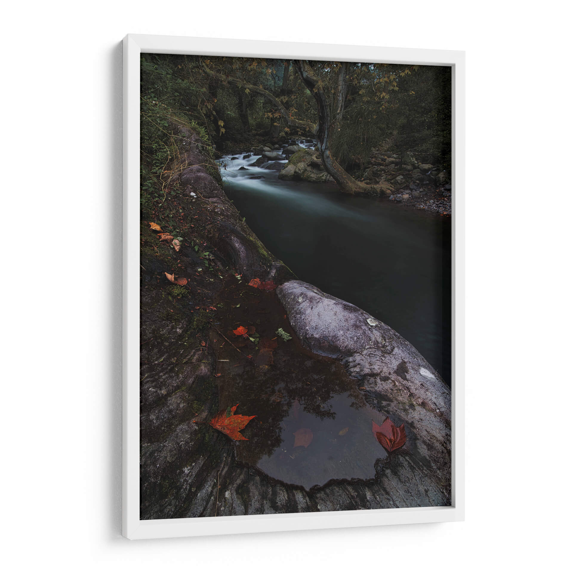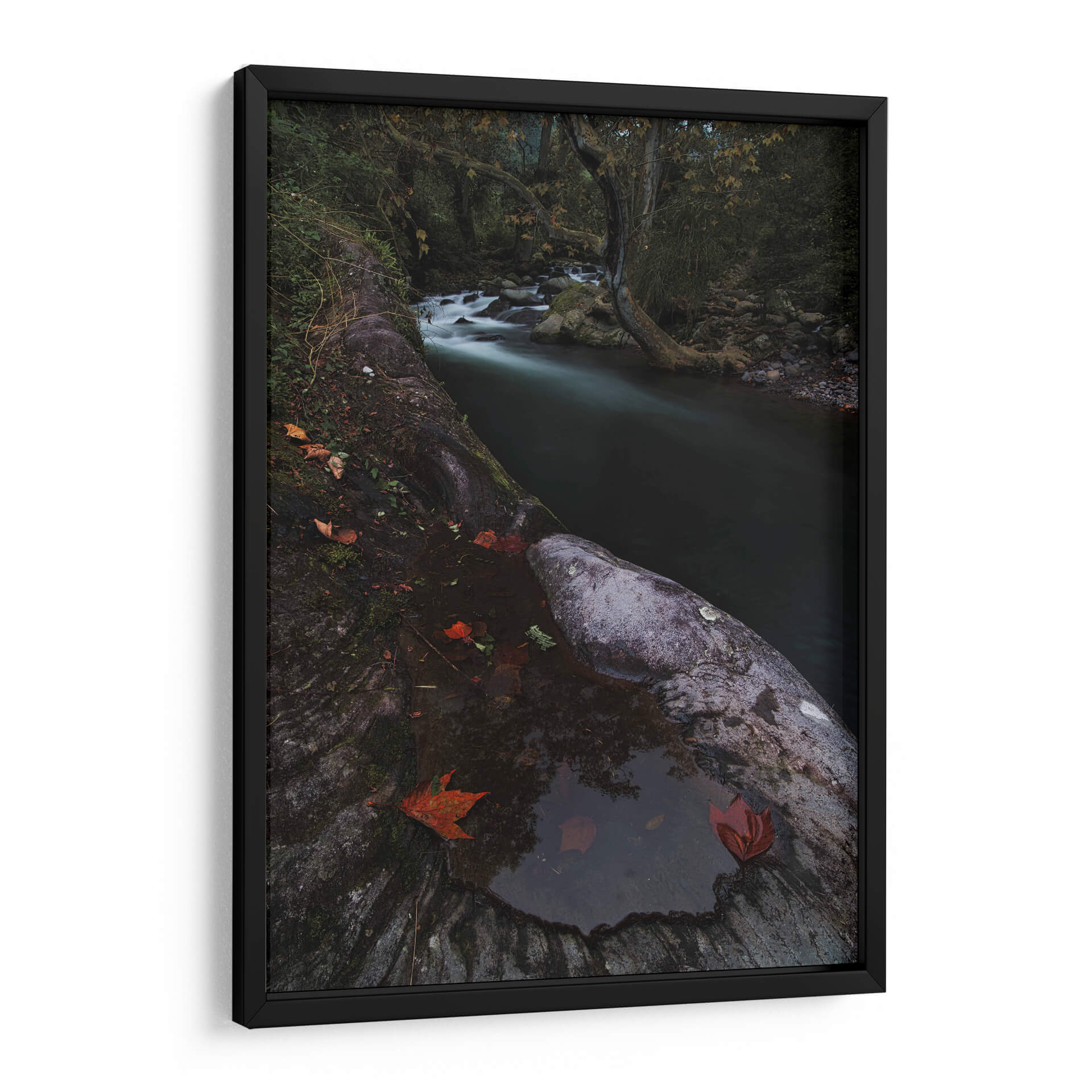 Sumérgete en la serena belleza de "Rio Místico" de Jorge Vargas, una obra de arte que captura la esencia etérea de un paisaje natural. Esta pieza presenta un río serpenteante que fluye a través de un bosque sombrío, sus aguas capturadas en un movimiento suave y soñador gracias a una larga exposición. La paleta de colores se centra en tonos oscuros y terrosos, con toques de verde musgo y los vibrantes rojos de las hojas caídas que contrastan delicadamente contra la piedra húmeda y la oscuridad circundante. La composición, con el primer plano dominado por texturas rocosas y la profundidad que ofrece el río y el follaje del bosque, invita a la contemplación. "Rio Místico" evoca una atmósfera de tranquilidad, misterio y la quietud de la naturaleza en su estado más puro. Es un cuadro decorativo ideal para añadir un toque de calma contemplativa a cualquier sala de estar, estudio u oficina, transformando el espacio en un santuario de paz y conexión con el mundo natural. La habilidad del artista para capturar la luz y la atmósfera crea una pieza que es a la vez poderosa y sutil, perfecta para quienes buscan arte que hable al alma y eleve el espíritu.