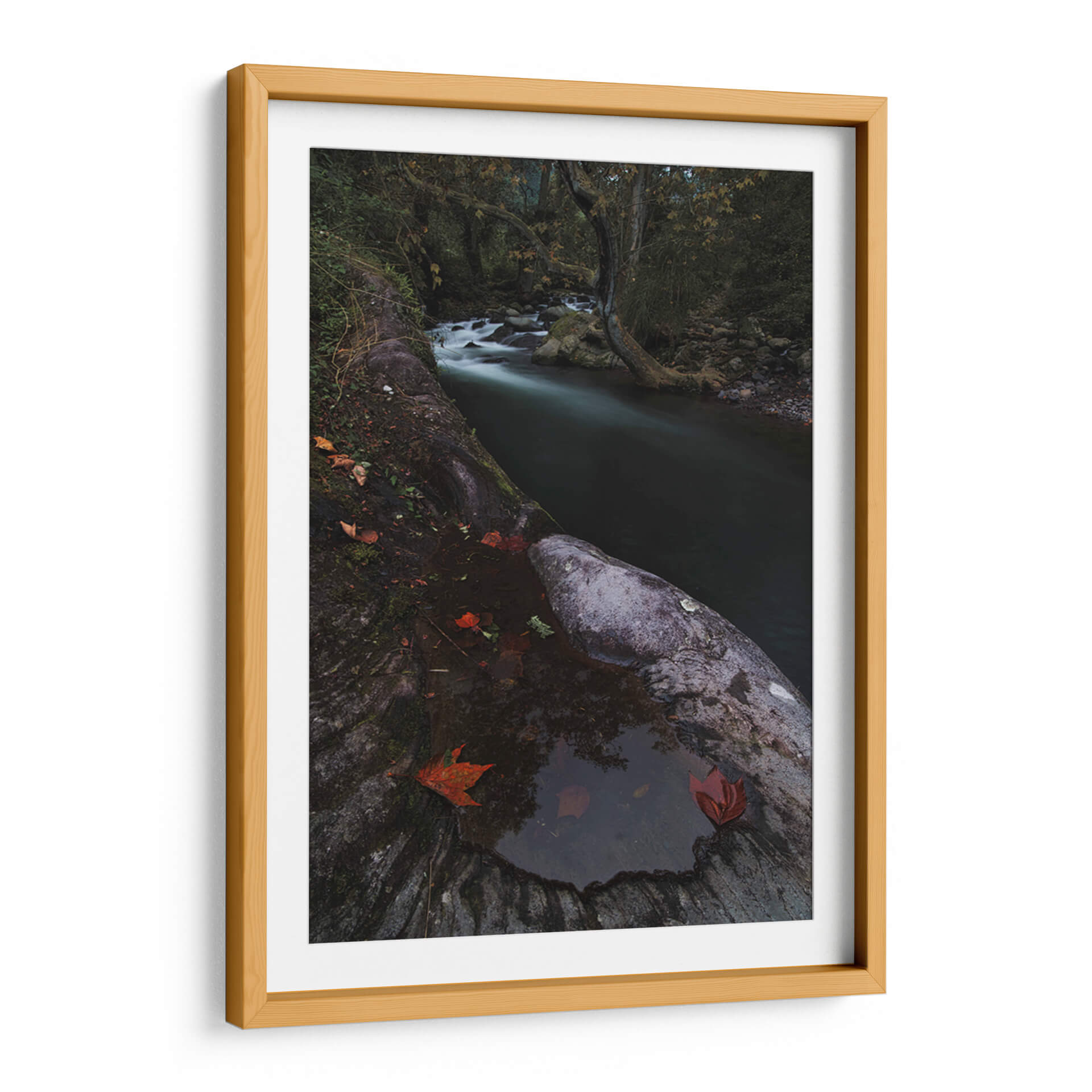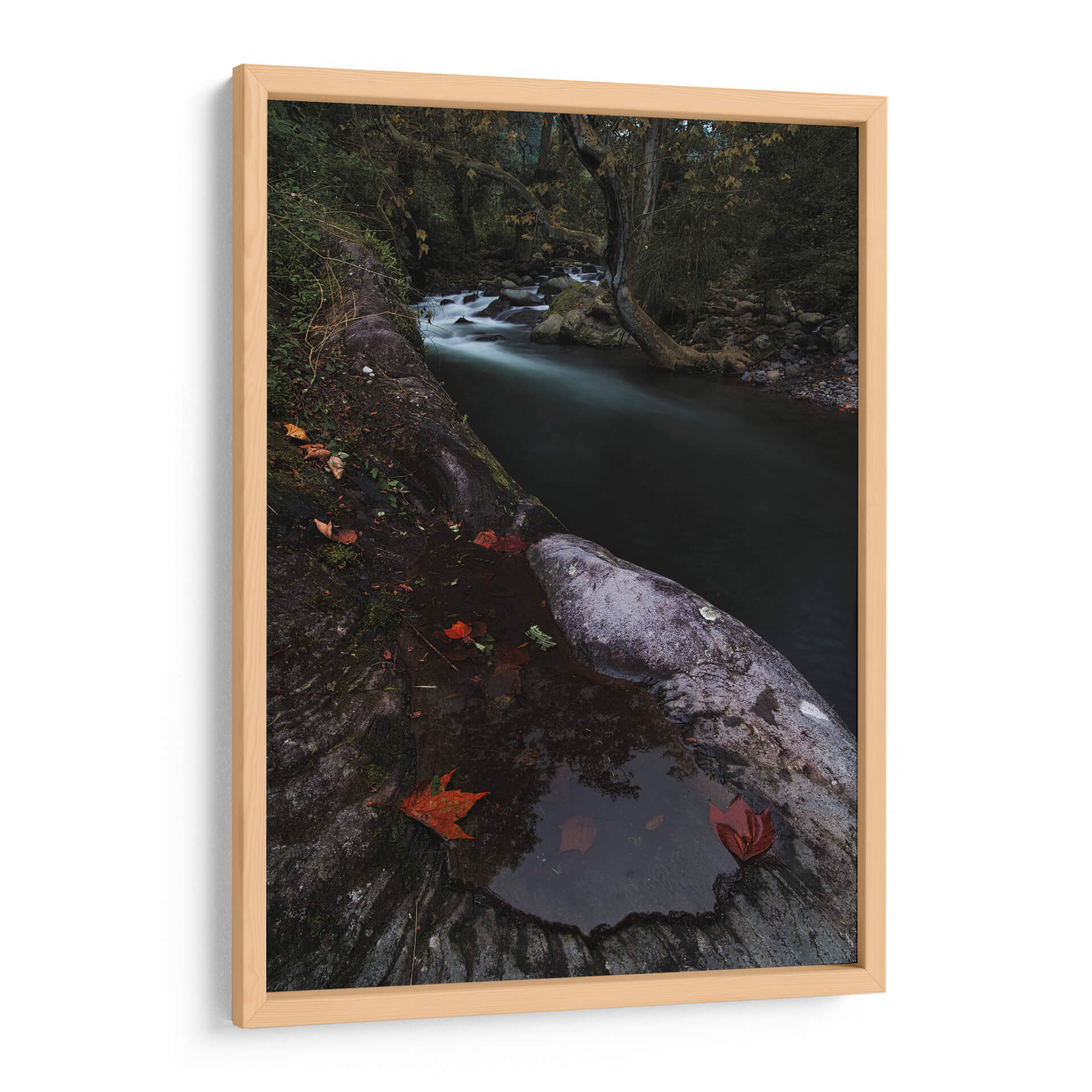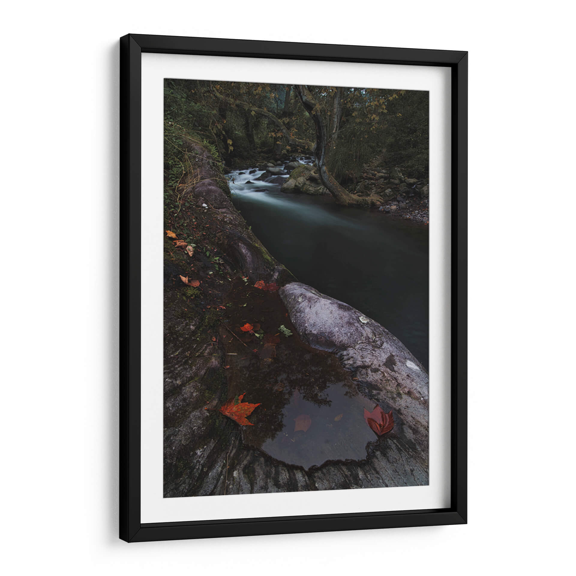 Sumérgete en la serena belleza de "Rio Místico" de Jorge Vargas, una obra de arte que captura la esencia etérea de un paisaje natural. Esta pieza presenta un río serpenteante que fluye a través de un bosque sombrío, sus aguas capturadas en un movimiento suave y soñador gracias a una larga exposición. La paleta de colores se centra en tonos oscuros y terrosos, con toques de verde musgo y los vibrantes rojos de las hojas caídas que contrastan delicadamente contra la piedra húmeda y la oscuridad circundante. La composición, con el primer plano dominado por texturas rocosas y la profundidad que ofrece el río y el follaje del bosque, invita a la contemplación. "Rio Místico" evoca una atmósfera de tranquilidad, misterio y la quietud de la naturaleza en su estado más puro. Es un cuadro decorativo ideal para añadir un toque de calma contemplativa a cualquier sala de estar, estudio u oficina, transformando el espacio en un santuario de paz y conexión con el mundo natural. La habilidad del artista para capturar la luz y la atmósfera crea una pieza que es a la vez poderosa y sutil, perfecta para quienes buscan arte que hable al alma y eleve el espíritu.