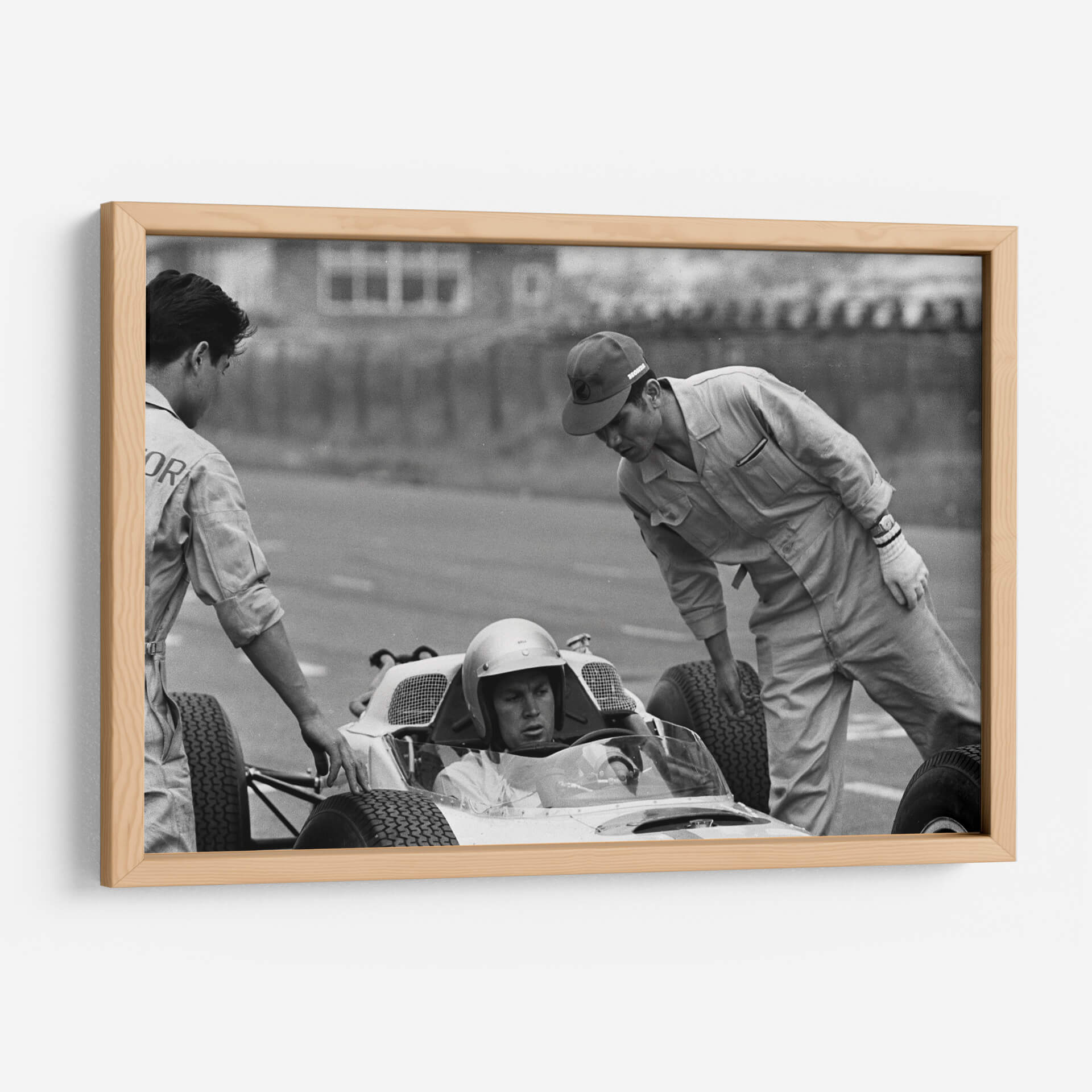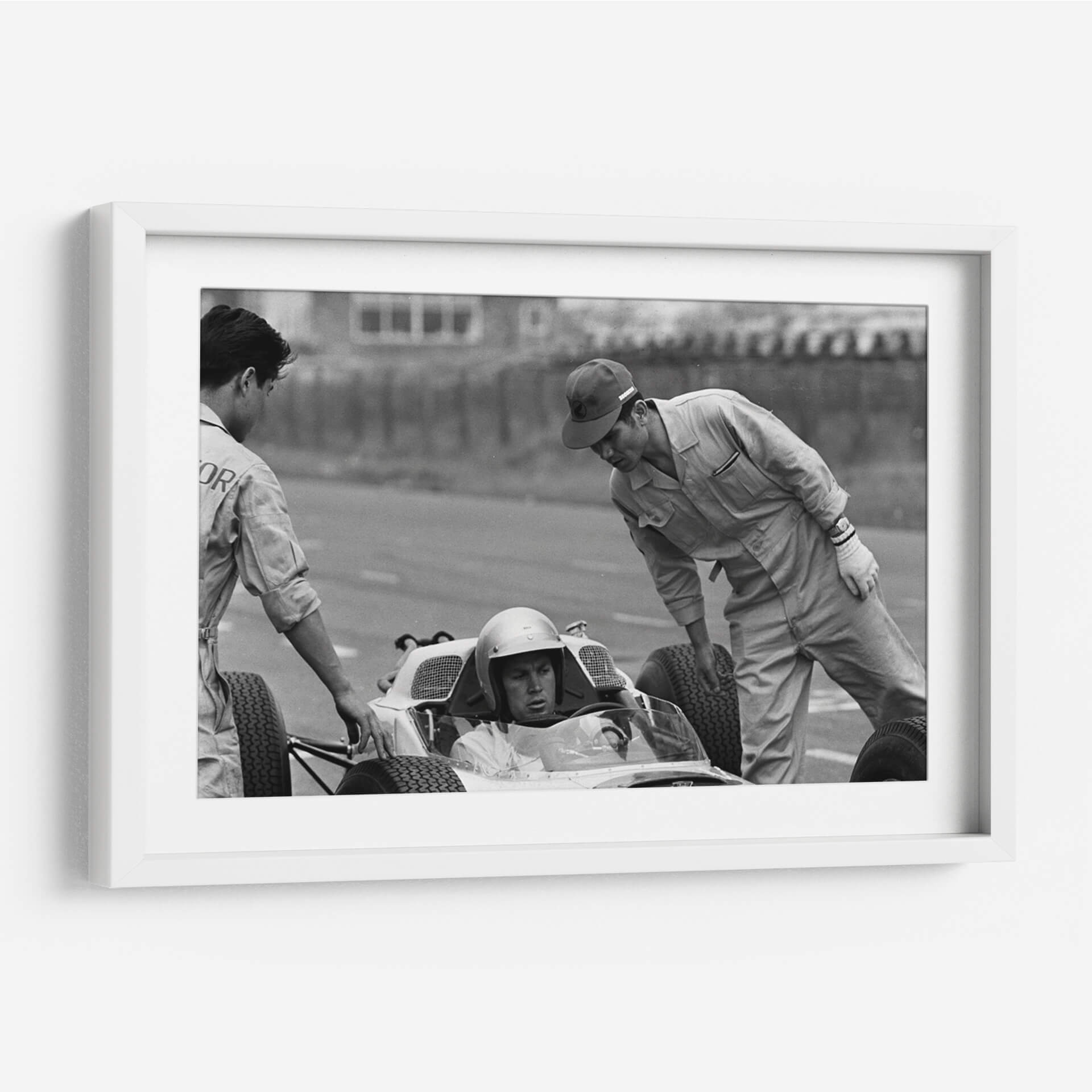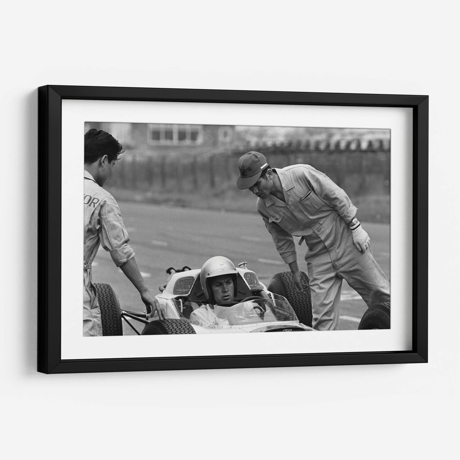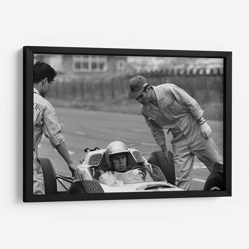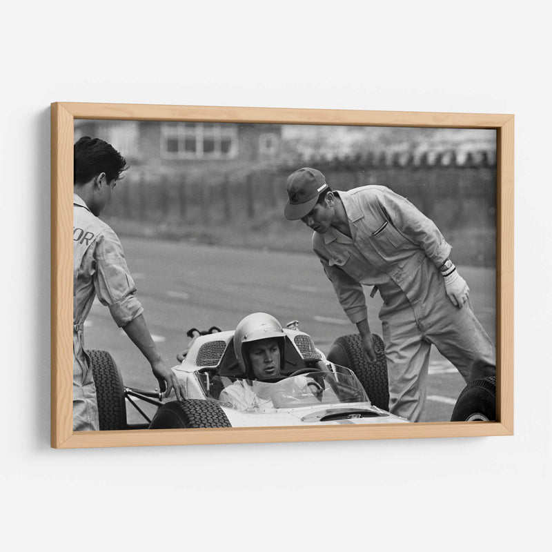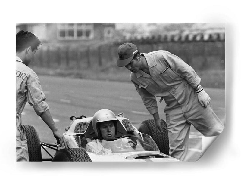 Sumérgete en la historia del automovilismo con esta cautivadora fotografía en blanco y negro que captura un momento íntimo de las pruebas del Honda en Zandvoort en 1964. La imagen, con su estilo documental y atemporal, evoca la atmósfera de concentración y preparación previa a una carrera. Se aprecia la interacción entre el piloto y su equipo, destacando la tensión y la expectación del momento. La composición se centra en el cockpit del monoplaza, con el piloto ataviado con casco, mientras dos mecánicos revisan o asisten en el proceso. La estética en blanco y negro resalta las texturas, las sombras y la expresión de los rostros, otorgando una profundidad y un carácter únicos a la escena. Este cuadro decorativo es perfecto para los amantes de los coches clásicos, la historia de la Fórmula 1 y para aquellos que buscan una pieza de arte con un fuerte componente narrativo. Ideal para ubicar en un despacho, sala de estar o cualquier espacio donde se desee añadir un toque de elegancia nostálgica y un guiño a la velocidad y la ingeniería.