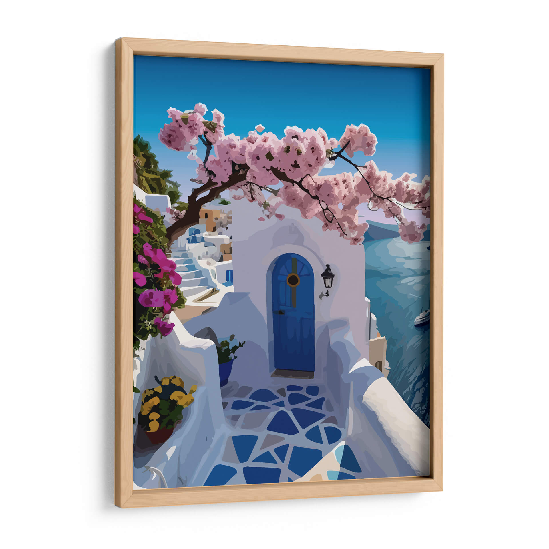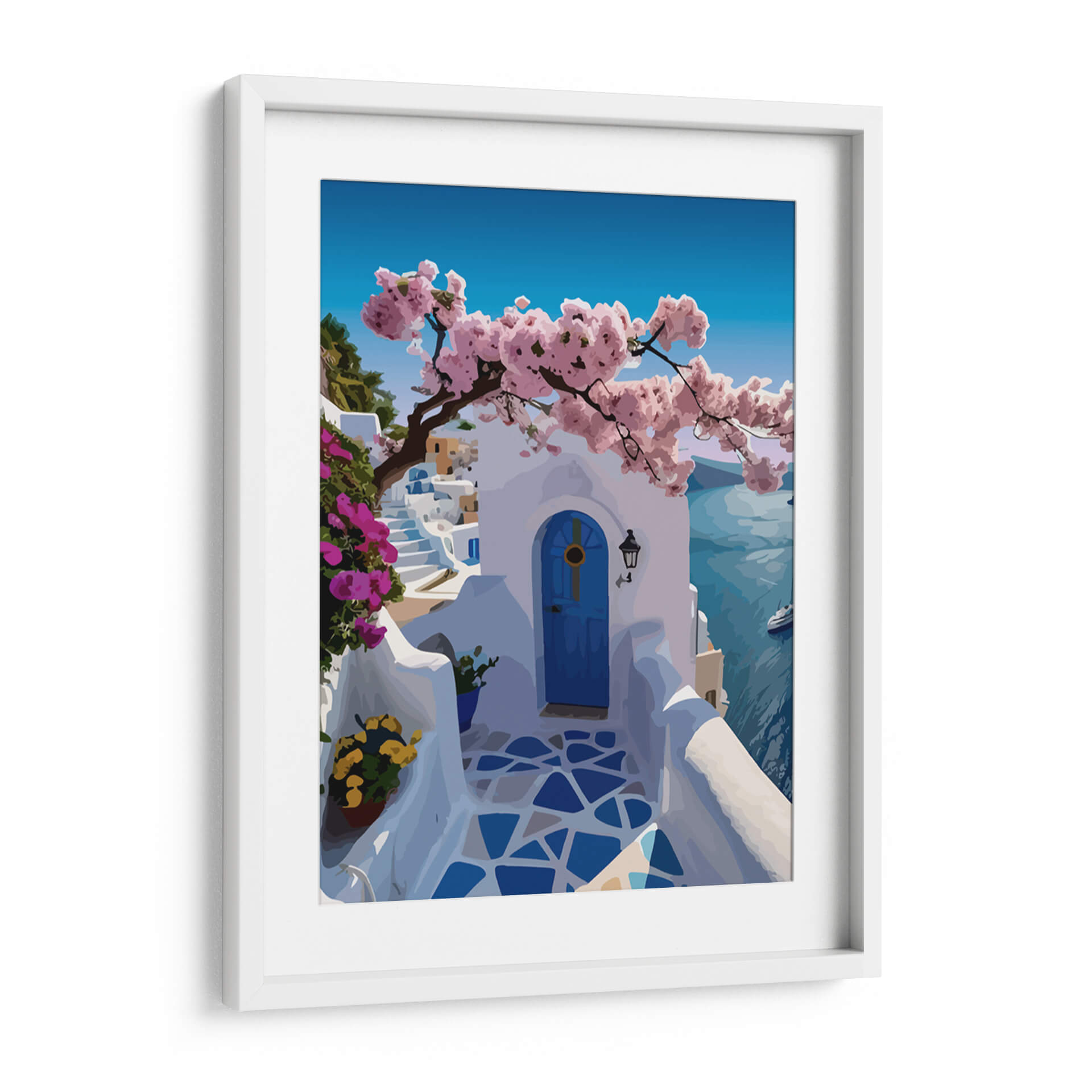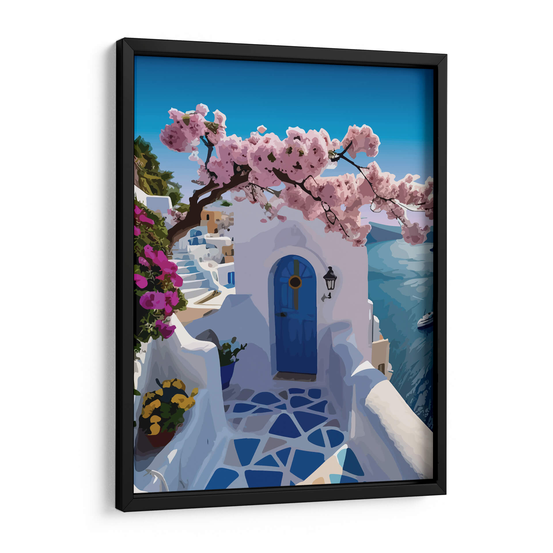 Embárcate en un viaje visual a las idílicas islas griegas con nuestro exquisito cuadro decorativo "Santorini 1". Esta obra de arte captura la esencia de un día soleado en una encantadora villa cicládica. La composición se centra en una puerta azul vibrante que invita a la contemplación, flanqueada por escalinatas blancas inmaculadas que se pierden en la distancia. Un árbol de cerezo en flor, con sus delicadas ramas cargadas de pétalos rosados, se extiende elegantemente sobre la escena, añadiendo un toque de dulzura y color. El fondo revela el mar Egeo en un tono azul profundo y sereno, salpicado por la silueta de un pequeño barco, evocando la brisa marina y la tranquilidad vacacional. La paleta de colores, dominada por blancos luminosos, azules intensos y vibrantes rosas, crea una atmósfera de paz y sofisticación. Este cuadro decorativo es perfecto para transportarte a un paraíso mediterráneo sin salir de tu hogar, añadiendo un toque de serenidad y belleza atemporal a cualquier habitación, ya sea tu sala de estar, dormitorio o un espacio de trabajo que necesite una dosis de inspiración vacacional.