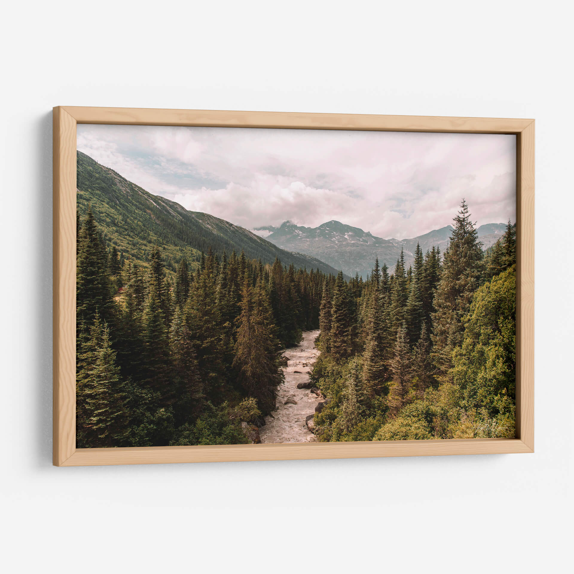 Sumérgete en la majestuosidad de la naturaleza con 'Skagway Forest', una obra de arte que captura la esencia de un bosque sereno y un río caudaloso. Este cuadro decorativo te transportará a un paisaje virgen, donde imponentes montañas cubiertas de nieve se alzan en el horizonte, custodiando un denso bosque de coníferas. Los tonos verdes profundos de los árboles y los ocres y grises del río y las montañas crean una paleta de colores terrosos que infunden calma y armonía. La composición, con el río serpenteando entre los árboles y las montañas como telón de fondo, invita a la contemplación y a la conexión con la naturaleza. Es una pieza ideal para aquellos que buscan añadir un toque de serenidad y la belleza de la vida salvaje a su hogar u oficina. Este cuadro de paisaje es perfecto para salas de estar, dormitorios o espacios de trabajo que necesiten un respiro visual y una atmósfera de tranquilidad. Transforma tu pared en una ventana a la naturaleza con esta impresionante obra de arte fotográfico.