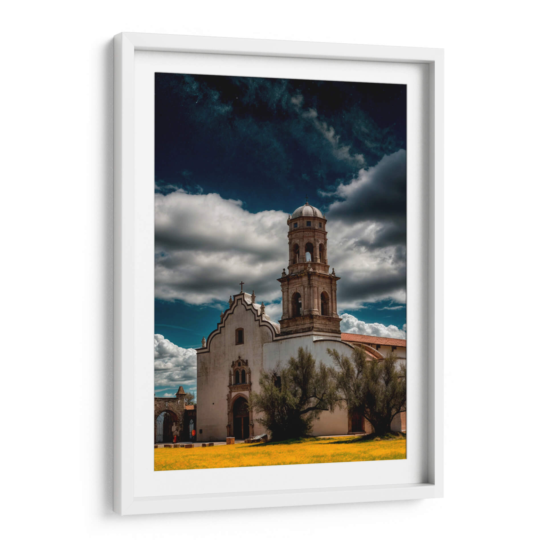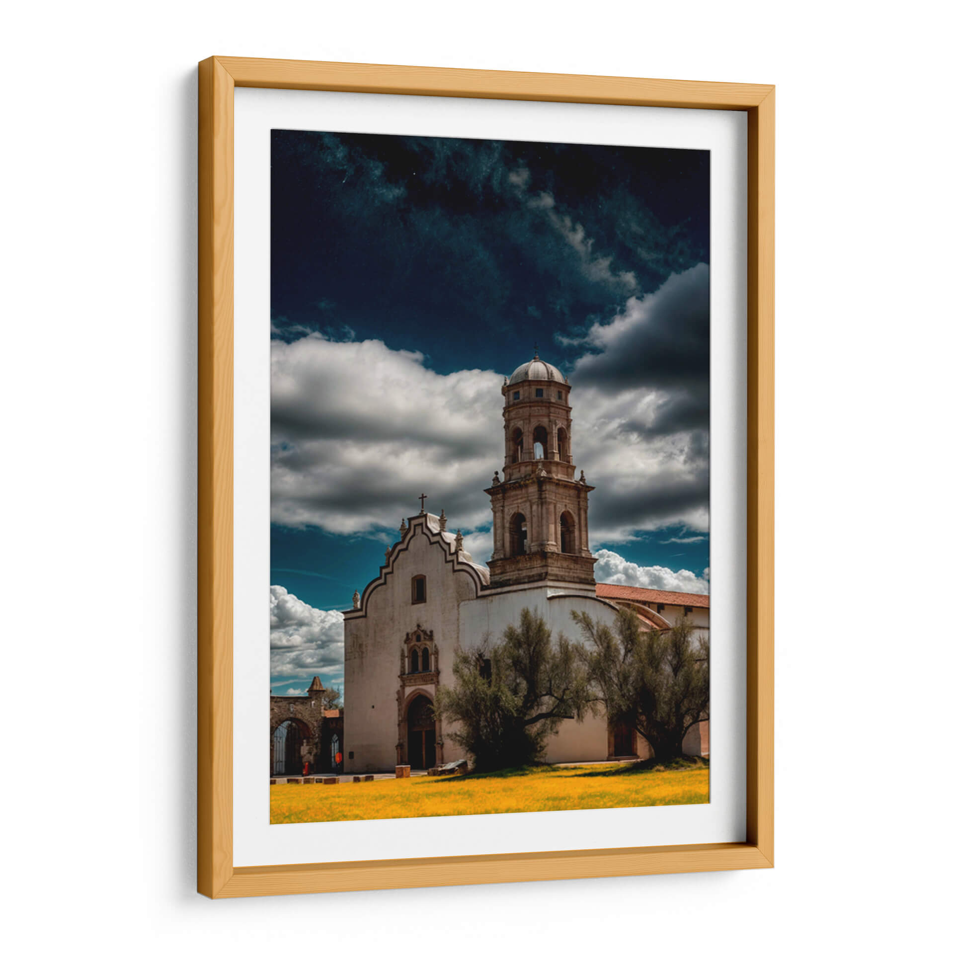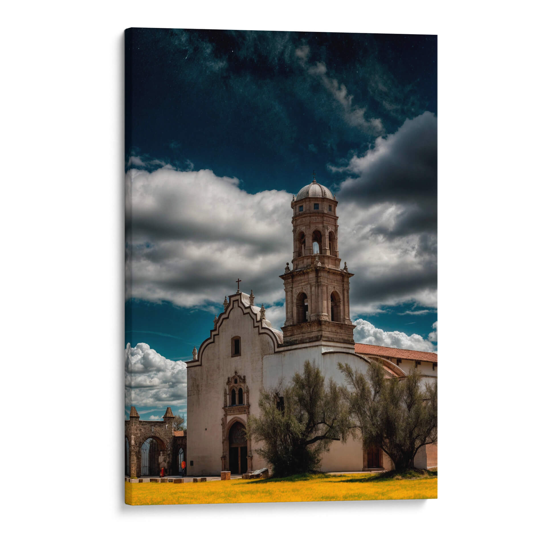 Captura la majestuosidad y el drama de un atardecer épico con nuestro cuadro decorativo "Templo de Tzintzuntzan bajo cielos dramáticos", una obra que evoca una profunda conexión con la historia y la naturaleza. Esta impresionante pieza visual presenta una arquitectura imponente, con una torre campanario que se eleva hacia un cielo tumultuoso, adornado con nubes oscuras y contrastantes celestes azules, salpicado sutilmente de estrellas. El primer plano cobra vida con un vibrante campo de hierba dorada que contrasta con la serenidad de la piedra y la profundidad del cielo, creando una composición visualmente impactante. Los árboles desgastados y las sombras que se proyectan añaden un toque de melancolía y atemporalidad. Ideal para infundir carácter y un sentido de maravilla en tu sala de estar, estudio u oficina, este cuadro decorativo es perfecto para aquellos que aprecian la belleza de los paisajes históricos y la potencia de los cielos cambiantes. Su estilo fotográfico con un toque dramático lo convierte en un punto focal cautivador para cualquier espacio que busque inspiración y profundidad. Añade un toque de historia y arte a tu hogar.