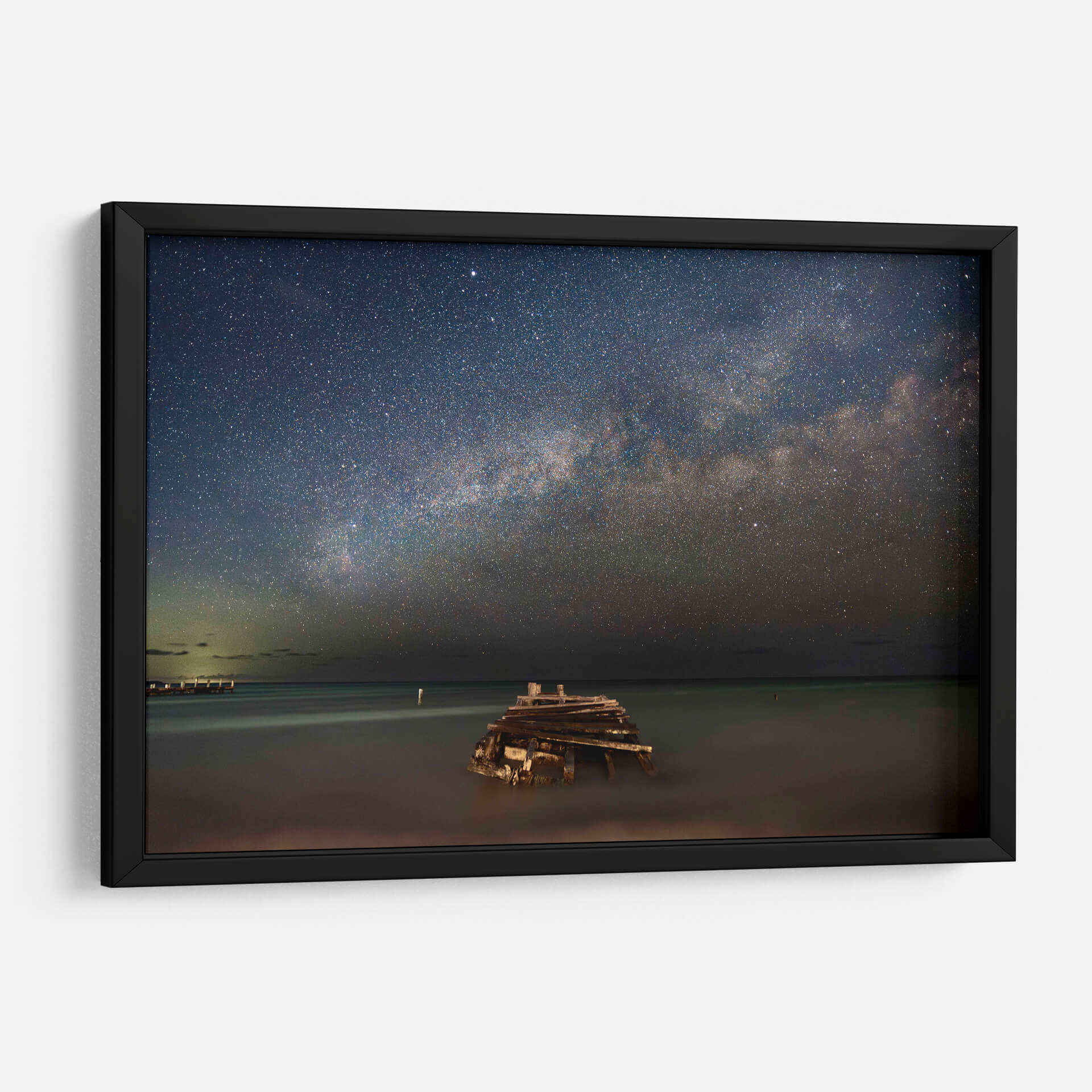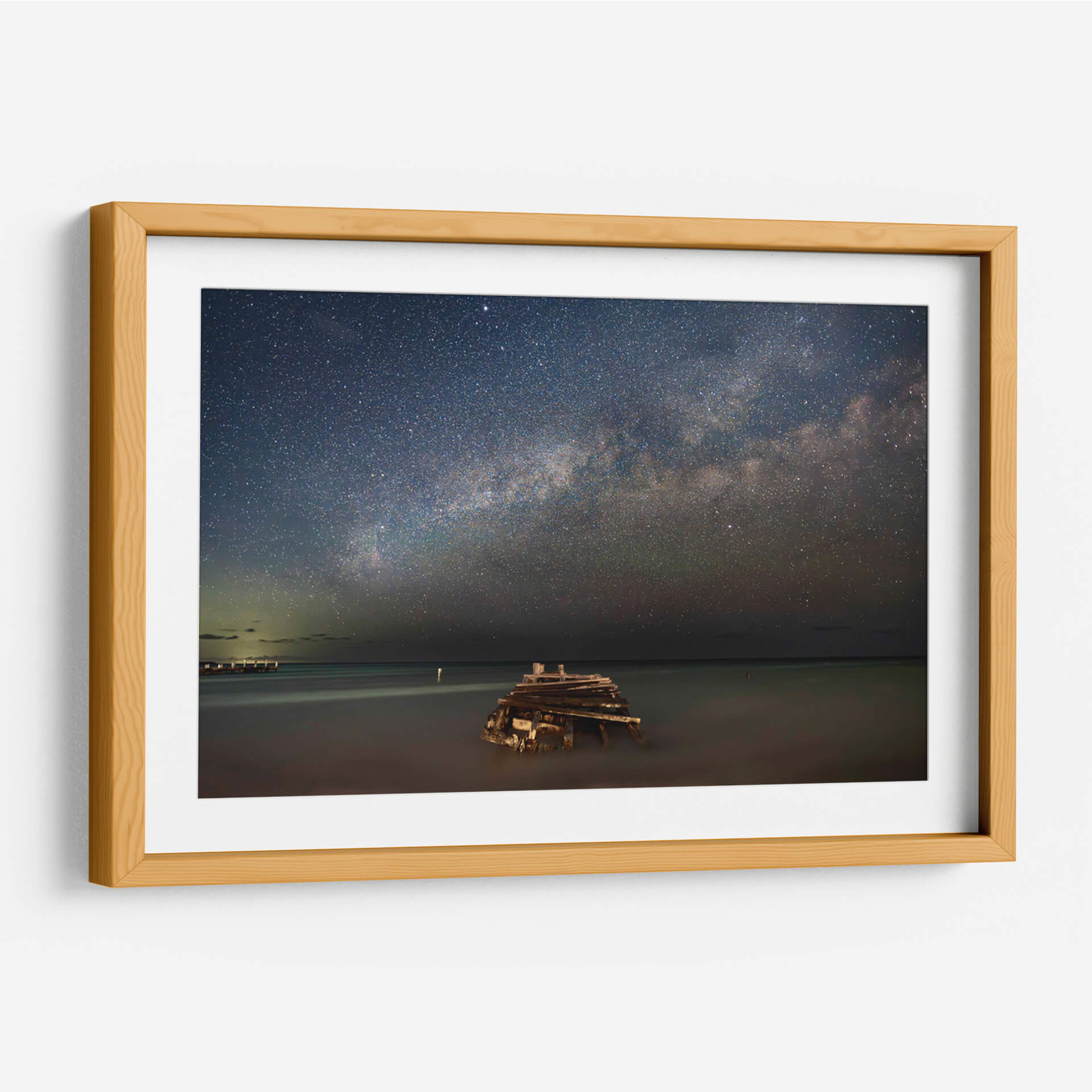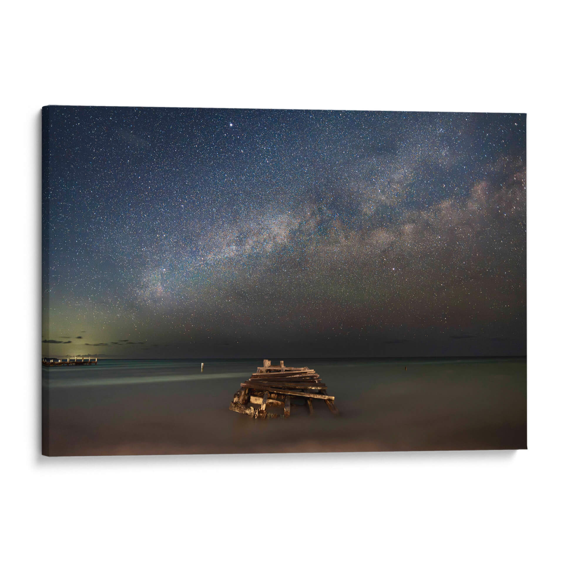 Sumérgete en la inmensidad del cosmos con "Via Láctea en Punta Allen QROO", una obra maestra de Fernando Lopez que captura la majestuosidad de nuestra galaxia sobre un sereno paisaje costero. Este cuadro decorativo transporta al espectador a un lugar de profunda contemplación y asombro, donde la fusión de los tonos oscuros del cielo nocturno, salpicado de innumerables estrellas brillantes, contrasta con la calma del mar y la silueta de un muelle rústico. La paleta de colores, dominada por profundos azules y negros, realzada por el blanco y sutiles toques de color del universo, crea una atmósfera de misterio y tranquilidad. El estilo fotográfico, con una composición que equilibra la escala del universo con la intimidad de la escena terrestre, es ideal para espacios que buscan evocar serenidad y conexión con la naturaleza y el cosmos. "Via Láctea en Punta Allen QROO" no es solo una decoración de pared, sino una ventana a la maravilla del universo, perfecta para salones, dormitorios o estudios donde se desee un toque de inspiración y calma.