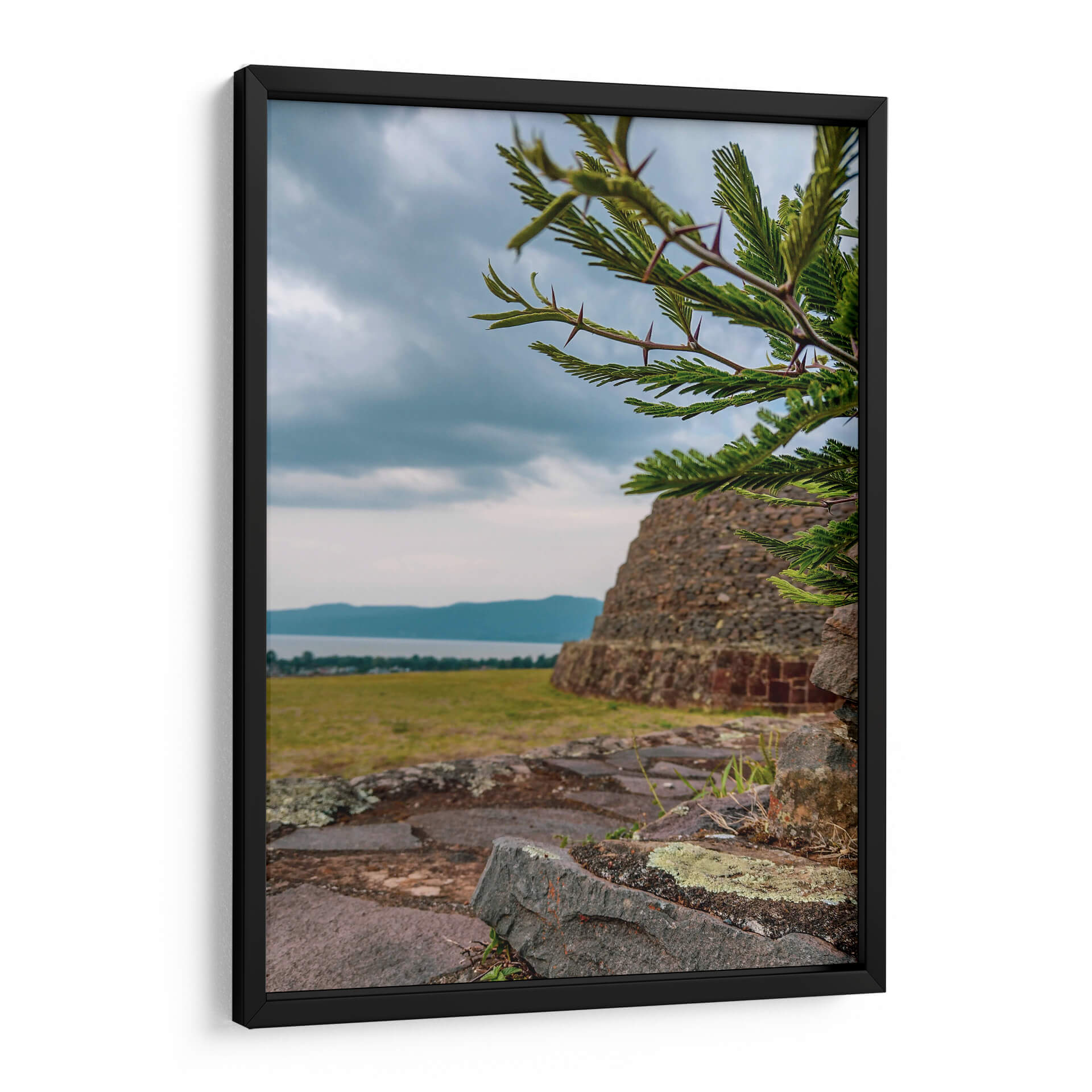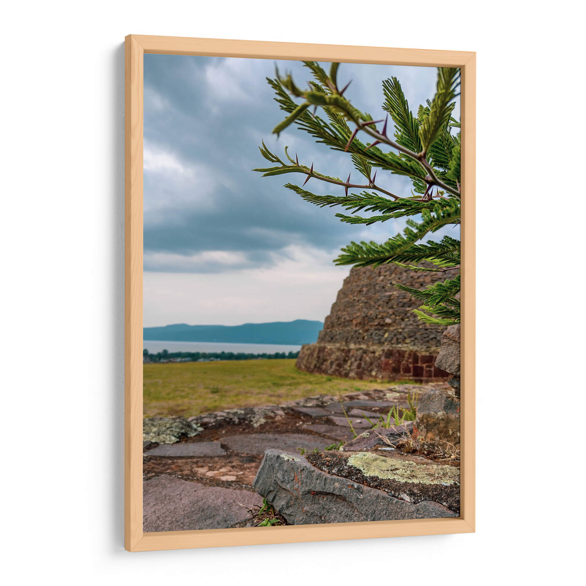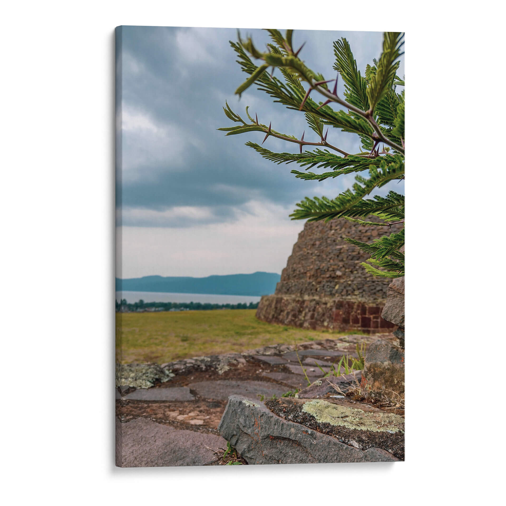 Adéntrate en la historia y la naturaleza con este evocador cuadro decorativo que captura la majestuosidad de las 'Yácatas de Tzintzuntzan'. La obra presenta una imponente estructura de piedra antigua, reminiscente de las civilizaciones precolombinas, emergiendo de un paisaje sereno. En primer plano, las ramas de un árbol espinoso, con sus detalladas hojas y púas, crean un marco natural que añade profundidad y textura a la composición. La paleta de colores, dominada por tonos tierra, verdes y grises, evoca una atmósfera de tranquilidad y contemplación, ideal para conectar con la esencia de la arqueología y la herencia cultural. El cielo nublado, con sutiles matices azules y grises, añade un toque de dramatismo y misterio, invitando a la reflexión sobre el paso del tiempo y la grandeza del pasado. Este cuadro decorativo es perfecto para aquellos que buscan infundir a sus hogares u oficinas un sentido de conexión con la historia, la cultura y la belleza natural. Imagina este lienzo como el punto focal de tu sala de estar, aportando un toque de sabiduría antigua y serenidad a tu espacio, o como una pieza inspiradora en tu estudio. Su composición detallada y su atmósfera contemplativa lo convierten en una elección excepcional para transformar cualquier ambiente en un refugio de paz y descubrimiento.