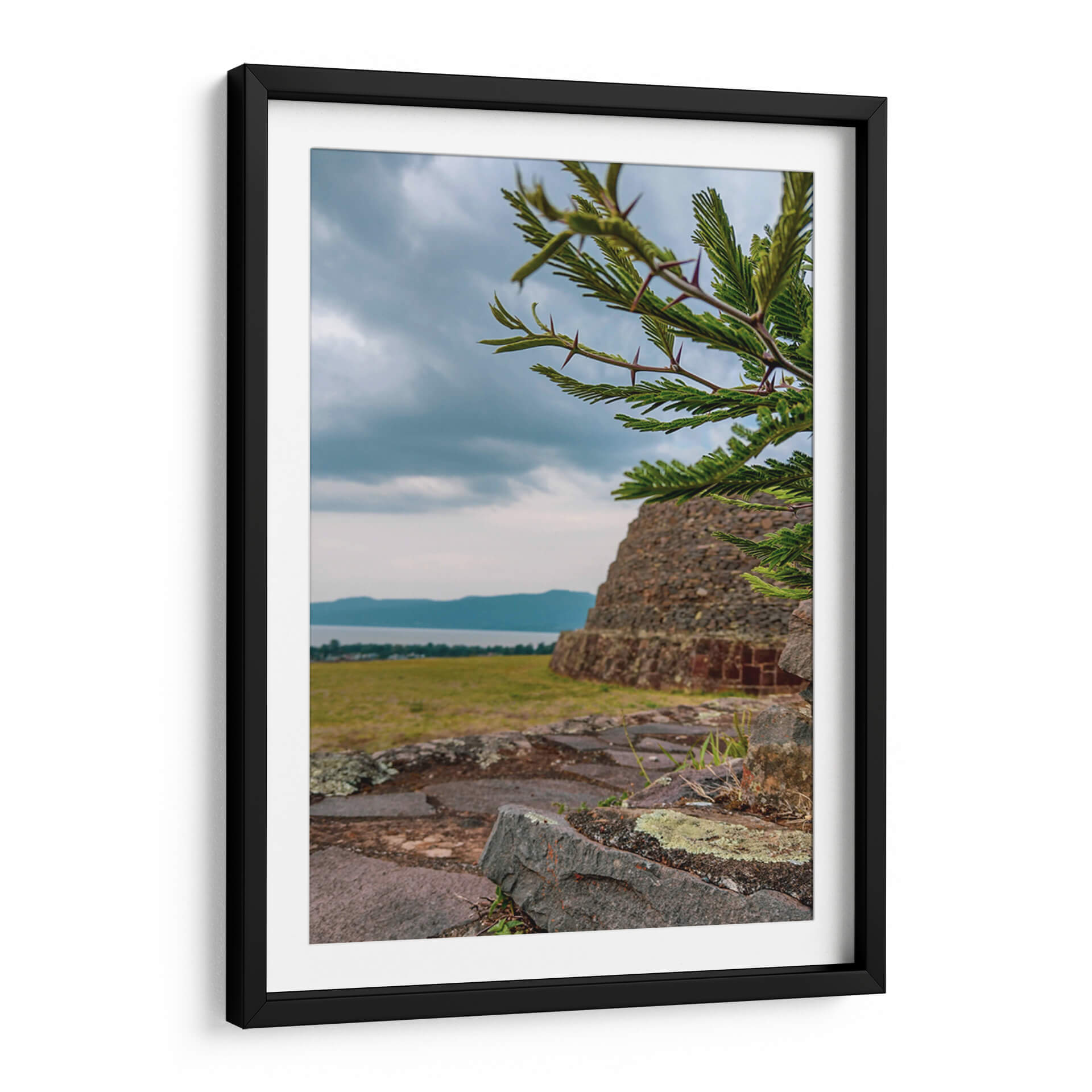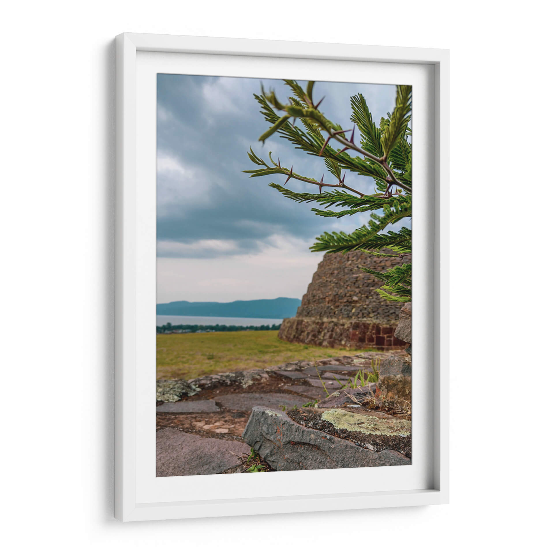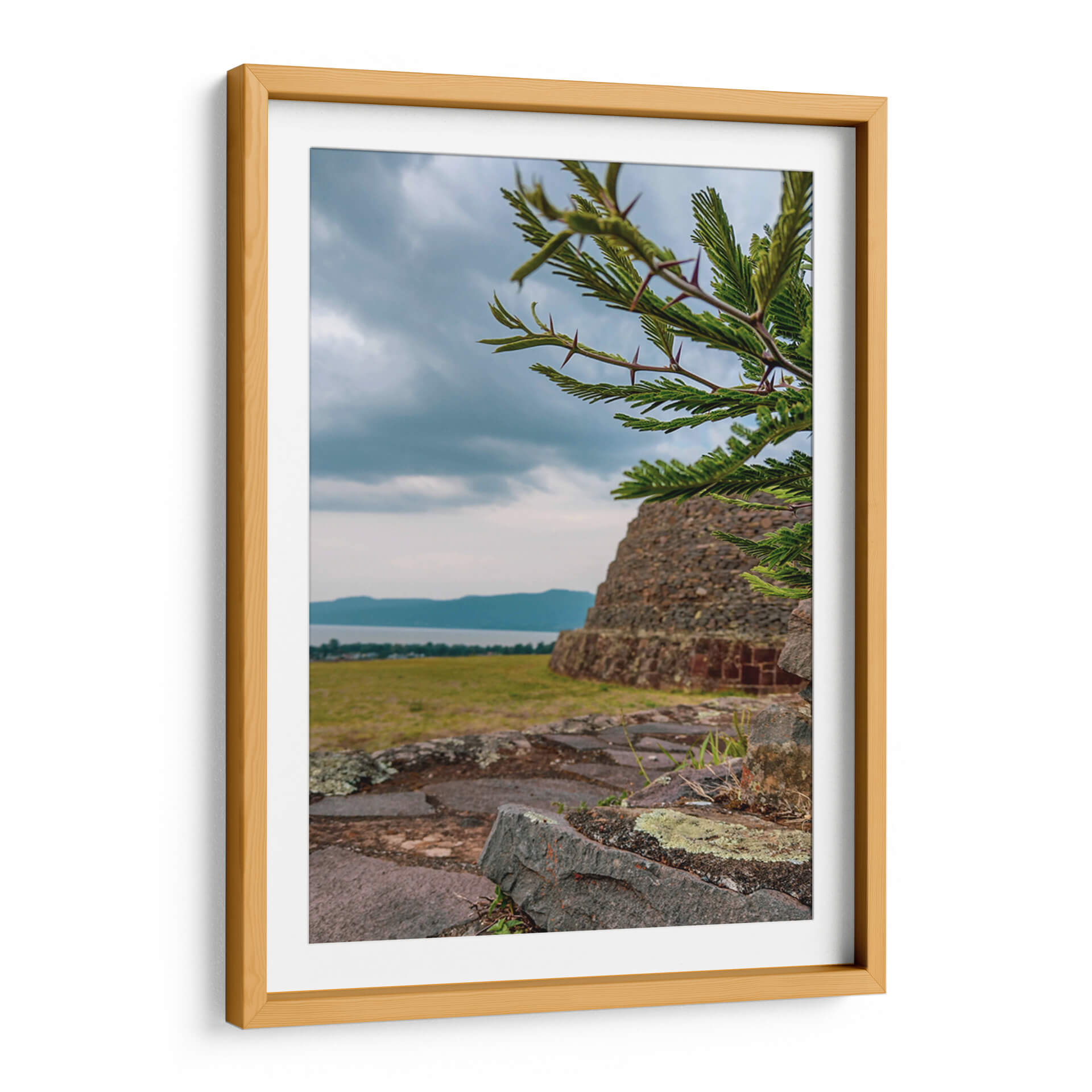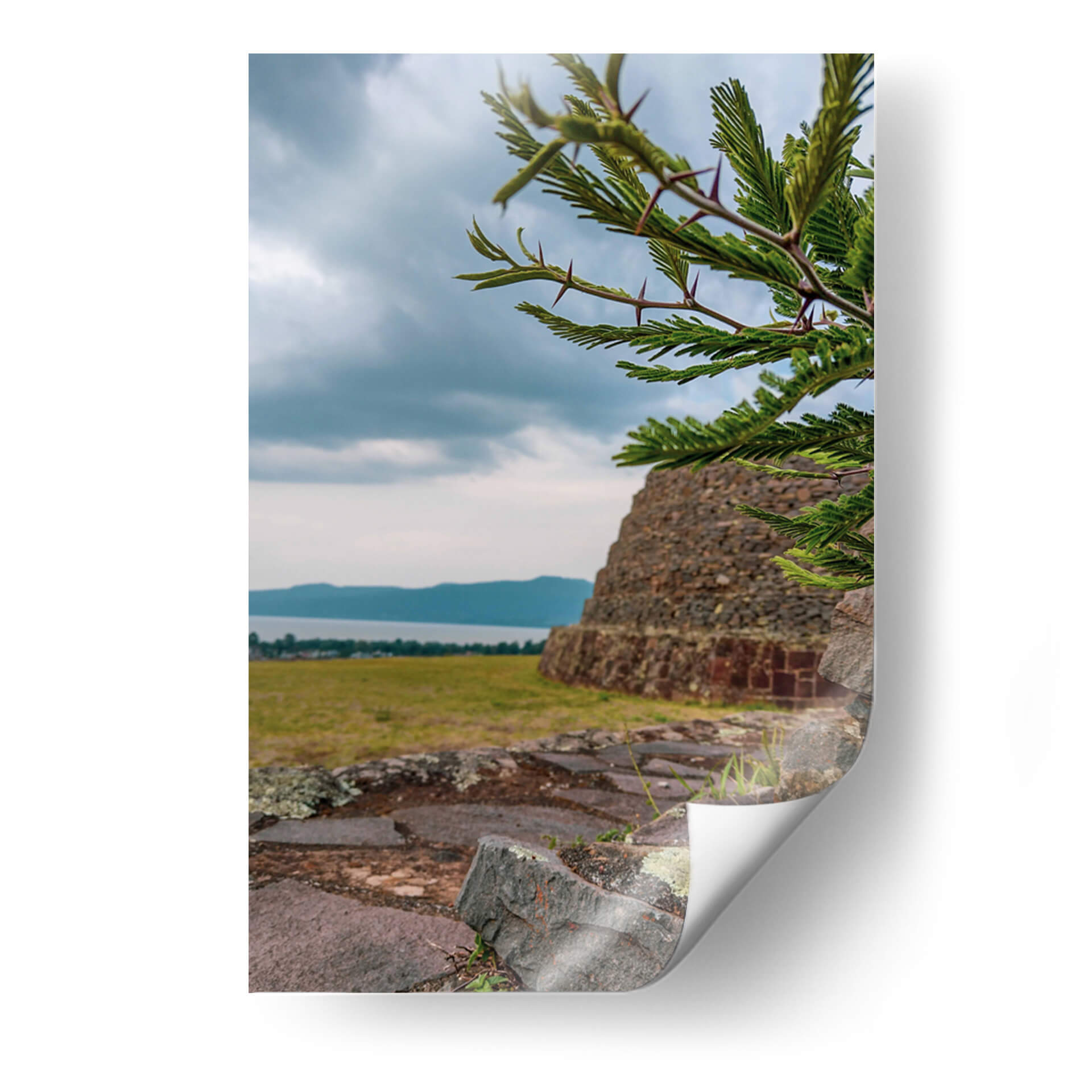 Adéntrate en la historia y la naturaleza con este evocador cuadro decorativo que captura la majestuosidad de las 'Yácatas de Tzintzuntzan'. La obra presenta una imponente estructura de piedra antigua, reminiscente de las civilizaciones precolombinas, emergiendo de un paisaje sereno. En primer plano, las ramas de un árbol espinoso, con sus detalladas hojas y púas, crean un marco natural que añade profundidad y textura a la composición. La paleta de colores, dominada por tonos tierra, verdes y grises, evoca una atmósfera de tranquilidad y contemplación, ideal para conectar con la esencia de la arqueología y la herencia cultural. El cielo nublado, con sutiles matices azules y grises, añade un toque de dramatismo y misterio, invitando a la reflexión sobre el paso del tiempo y la grandeza del pasado. Este cuadro decorativo es perfecto para aquellos que buscan infundir a sus hogares u oficinas un sentido de conexión con la historia, la cultura y la belleza natural. Imagina este lienzo como el punto focal de tu sala de estar, aportando un toque de sabiduría antigua y serenidad a tu espacio, o como una pieza inspiradora en tu estudio. Su composición detallada y su atmósfera contemplativa lo convierten en una elección excepcional para transformar cualquier ambiente en un refugio de paz y descubrimiento.