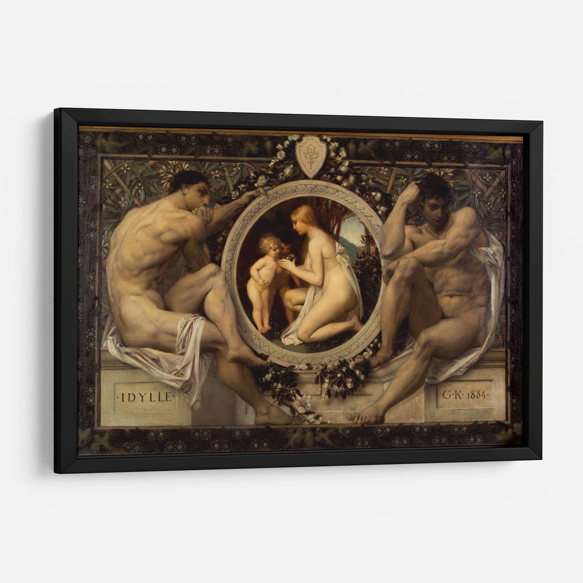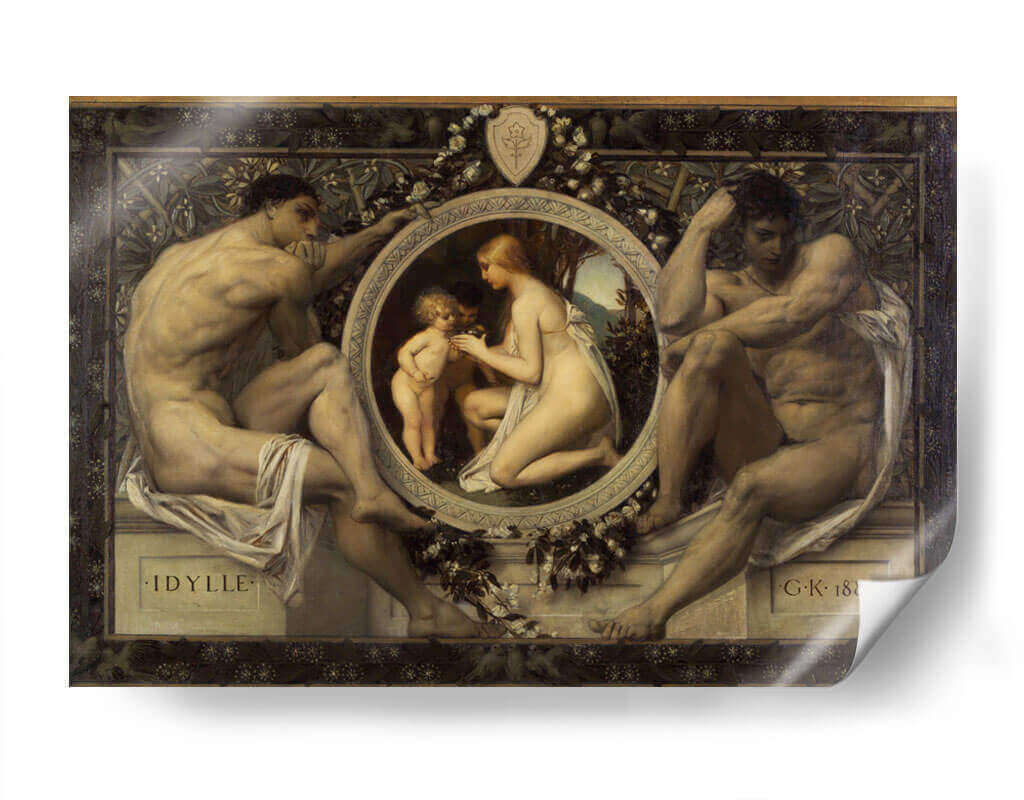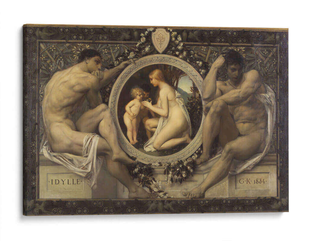 Sumérgete en la serenidad y la belleza atemporal de "Idilio", una obra maestra que captura la esencia de la conexión humana y la naturaleza. Este cuadro decorativo presenta una composición clásica con figuras masculinas robustas flanqueando un medallón central donde una mujer y un niño interactúan tiernamente, rodeados de motivos florales y vegetales. La paleta de colores, rica en tonos terrosos y pieles luminosas, aporta una calidez y profundidad inigualables, mientras que la detallada representación anatómica y la atmósfera evocadora transportan al espectador a un momento de paz idílica. Inspirado en el estilo simbolista, "Idilio" es una pieza que invita a la contemplación y añade un toque de sofisticación clásica a cualquier espacio. Perfecto para salones, estudios o dormitorios, este cuadro decorativo de Gustav Klimt es una adición exquisita para quienes aprecian el arte con profundidad emocional y estética refinada. Transforme su hogar en una galería personal con esta representación sublime de la armonía y la ternura.