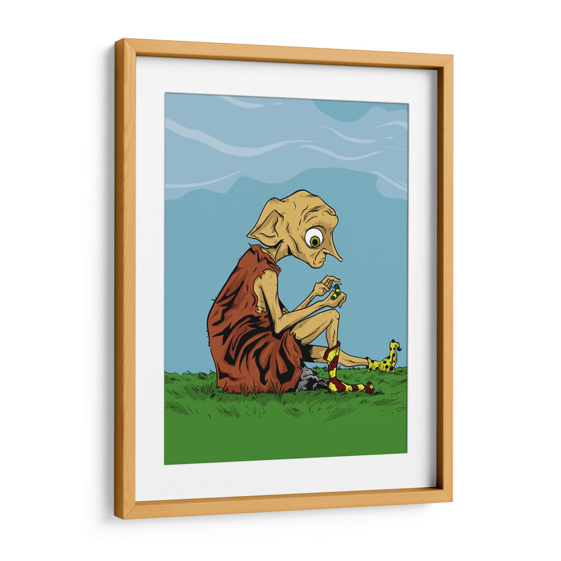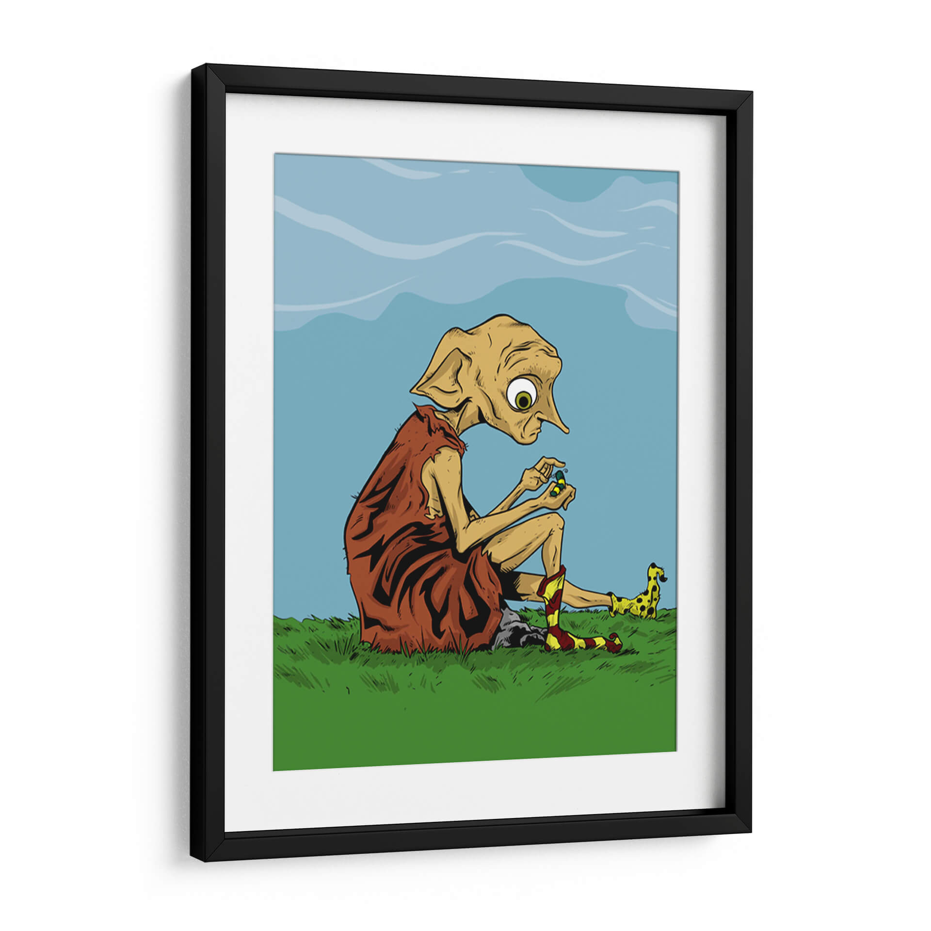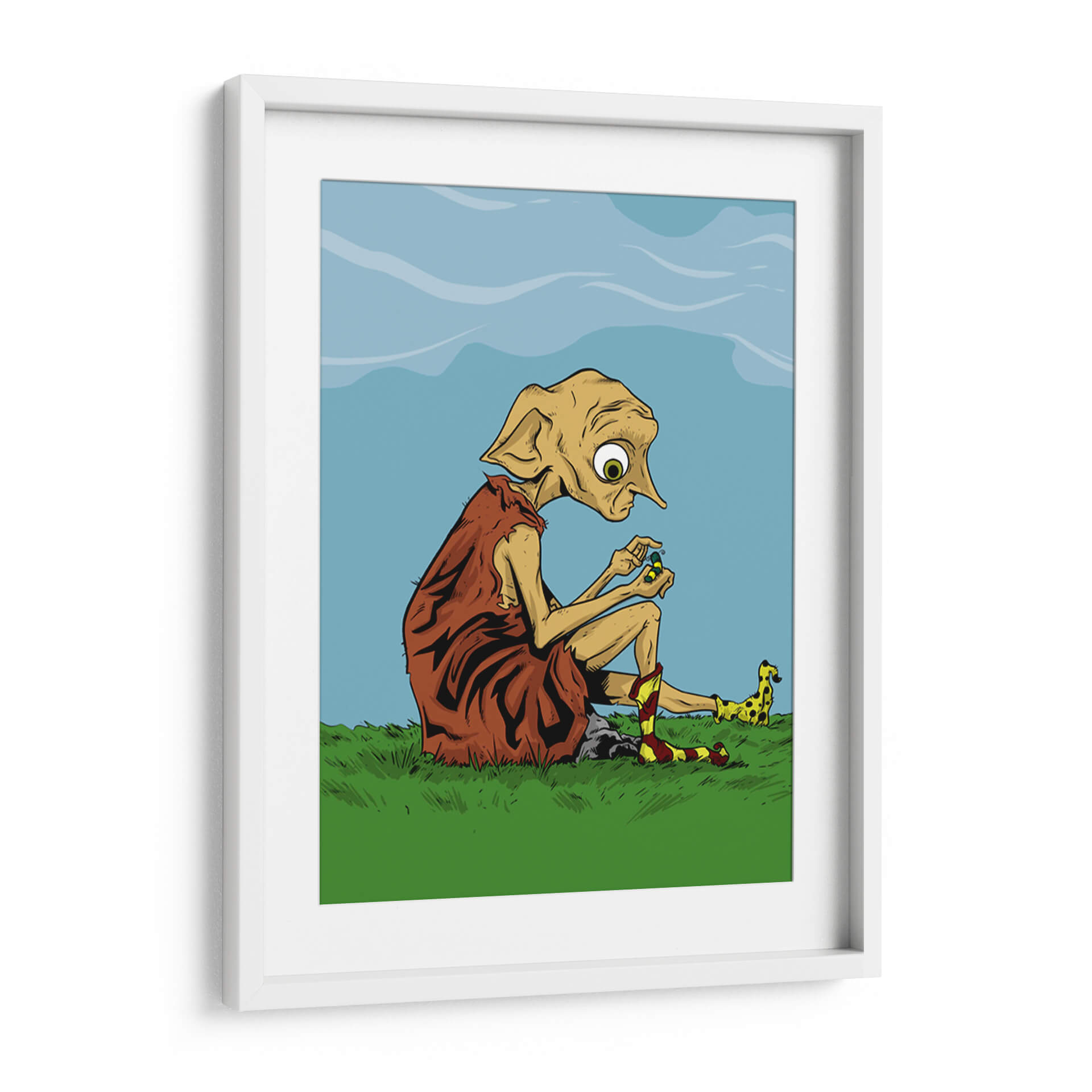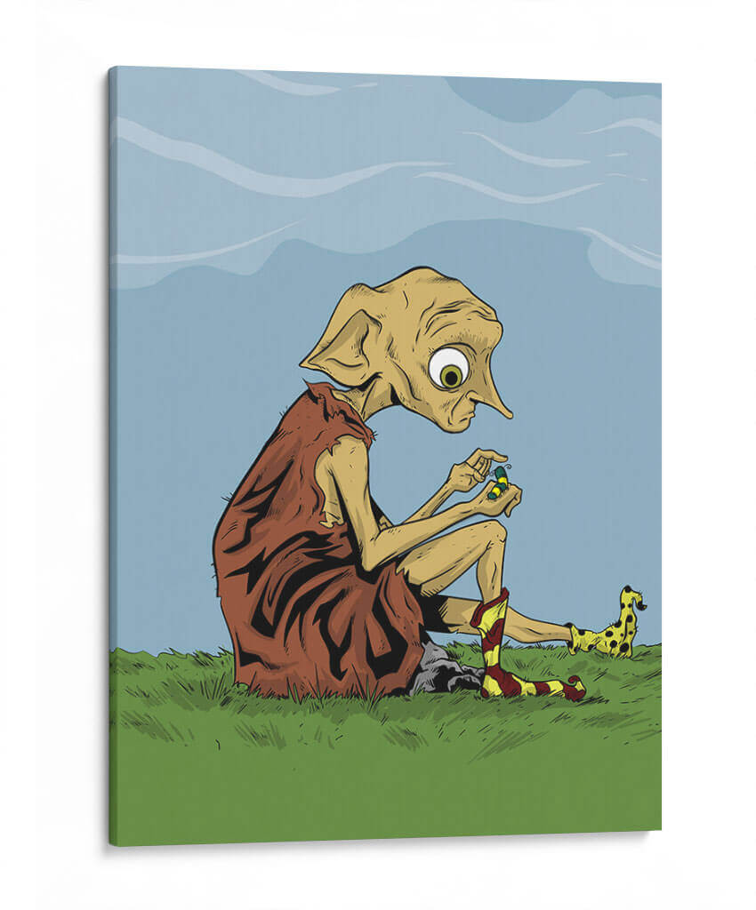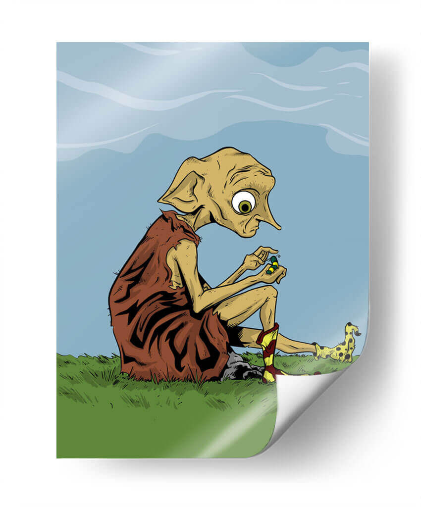 Sumérgete en un mundo de fantasía y melancolía con este cautivador cuadro decorativo. La obra presenta a una figura icónica, sentada solitaria en un prado verde bajo un cielo azul sereno, absorta en la manipulación de pequeños objetos. Sus grandes ojos expresivos y su peculiar vestimenta, junto con sus calcetines a rayas, evocan una sensación de inocencia y quizás una pizca de tristeza. La paleta de colores, dominada por verdes vibrantes, azules celestes y tonos terrosos, crea una atmósfera tranquila pero intrigante. El estilo artístico, con sus líneas definidas y su ejecución digital, confiere a la pieza un aire contemporáneo y distintivo. Este cuadro es perfecto para añadir un toque de personalidad y conversación a cualquier habitación, ya sea un dormitorio, una sala de estar o un espacio de trabajo creativo. Ideal para amantes de la cultura pop y aquellos que aprecian el arte que cuenta una historia.