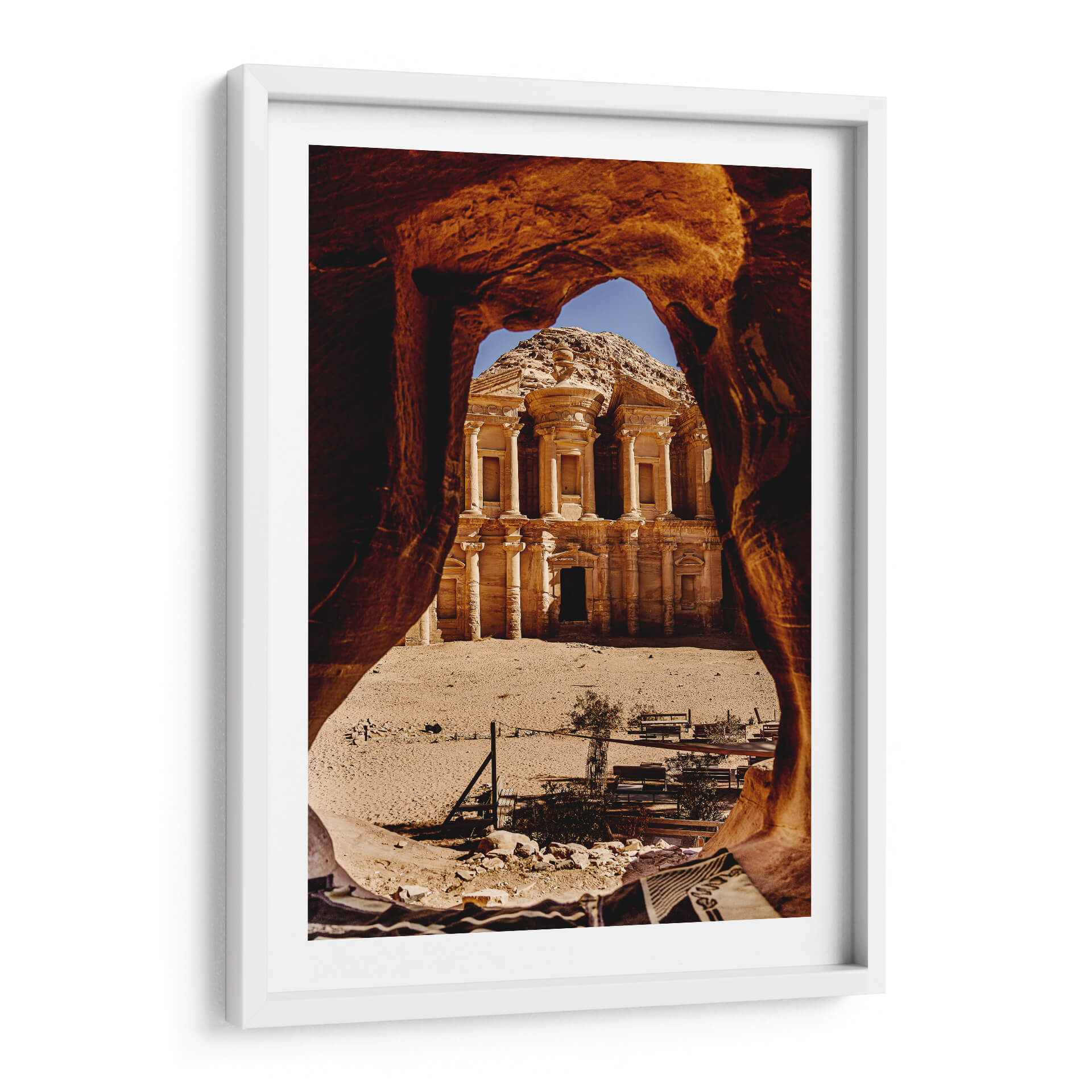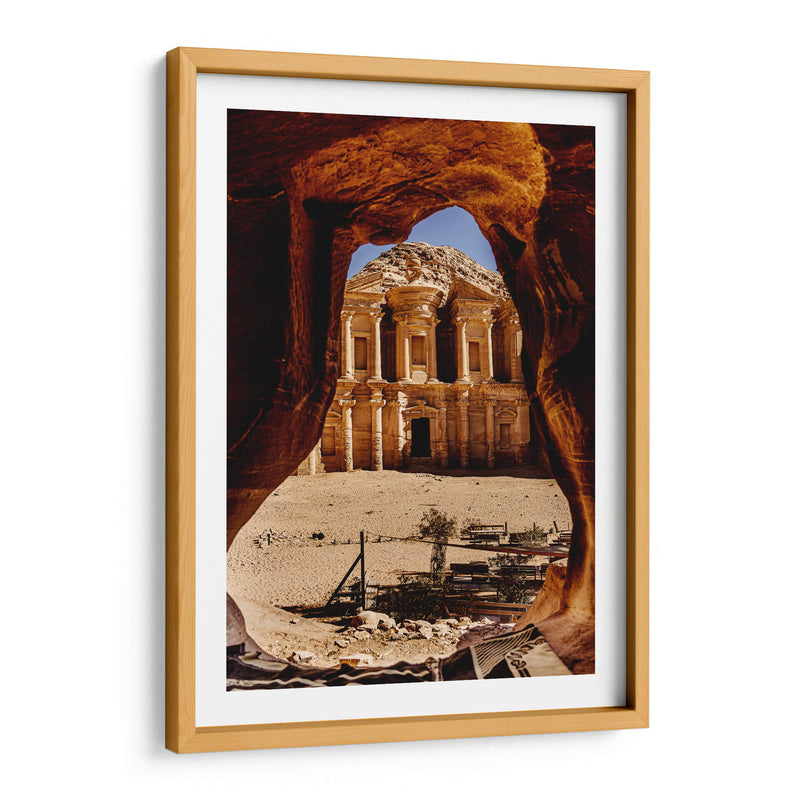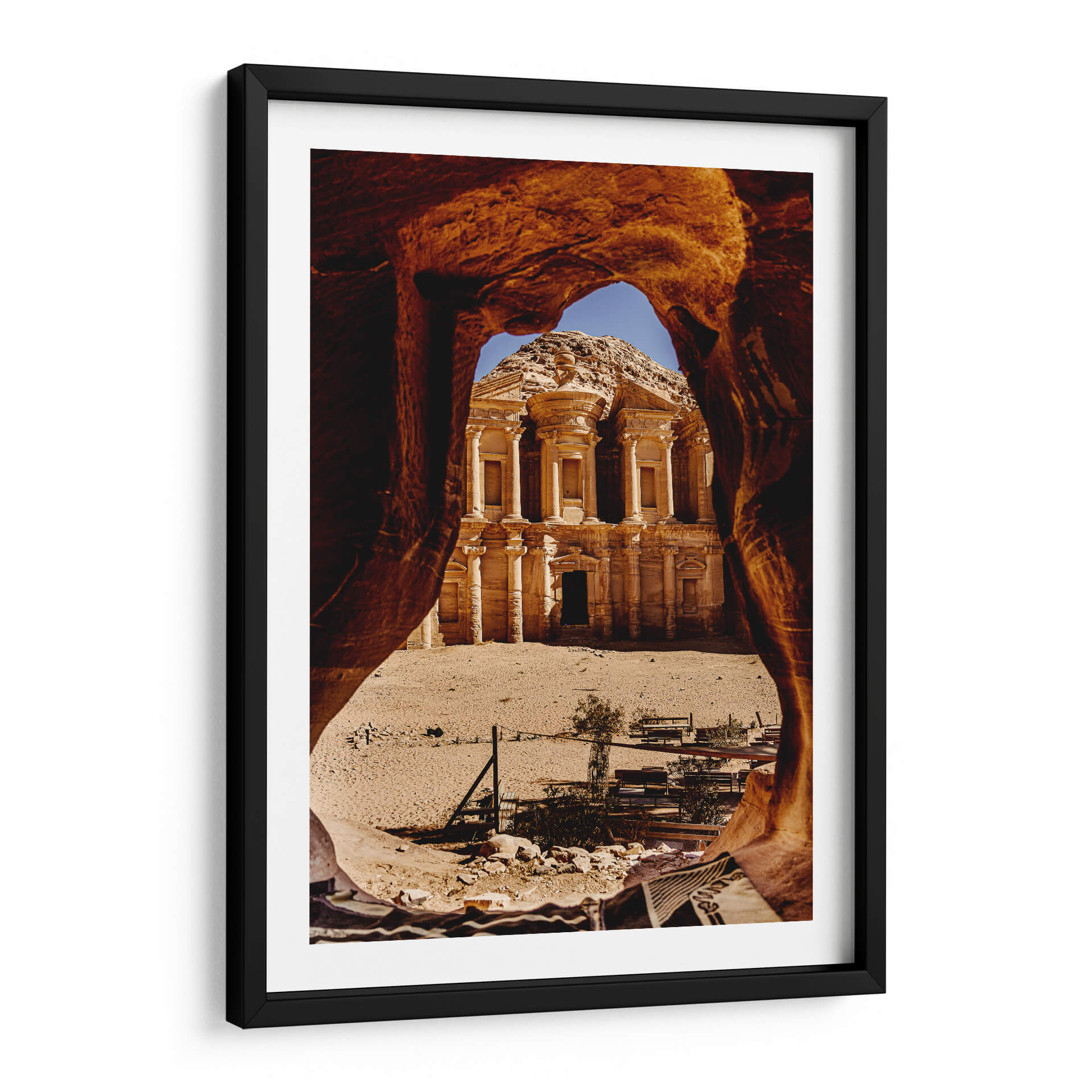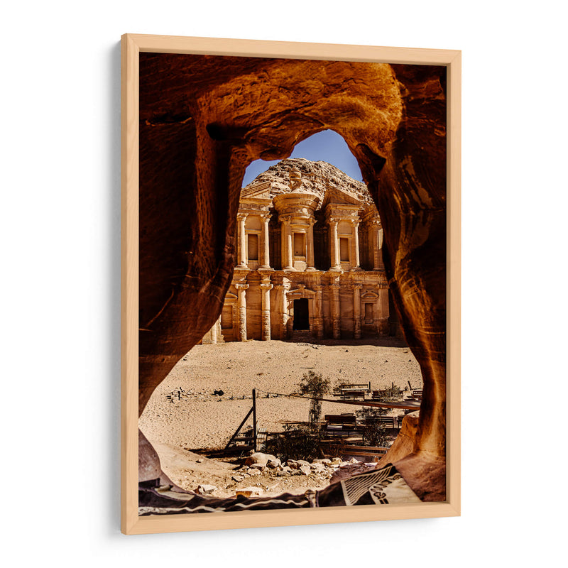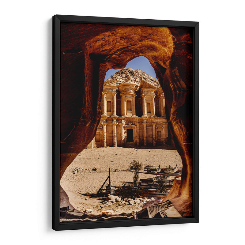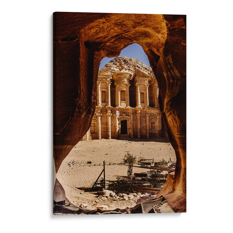 Transporta tu hogar a las antiguas maravillas de Jordania con este evocador cuadro decorativo de 'El Monasterio' en Petra. Capturada a través de la mirada artística de Emmanuel Ramírez, esta obra maestra te sumerge en la majestuosidad de una arquitectura tallada en roca, enmarcada por la textura orgánica de una cueva natural. Los tonos tierra dominantes, que van desde ocres cálidos hasta marrones profundos, crean una atmósfera de serenidad y misterio ancestral. La luz del sol baña la imponente fachada, resaltando los detalles de las columnas y las formas geológicas, mientras que el cielo azul claro contrasta sutilmente, aportando un toque de frescura. Este cuadro es una ventana a un lugar histórico, perfecto para infundir una sensación de aventura y conexión con el pasado en tu sala de estar, estudio u oficina. Su composición dramática, que juega con la perspectiva y la escala, lo convierte en un punto focal cautivador que invita a la contemplación y la admiración. Ideal para amantes de la historia, la arquitectura y los paisajes exóticos, este cuadro decorativo transformará cualquier espacio en un santuario de belleza atemporal y exploración.