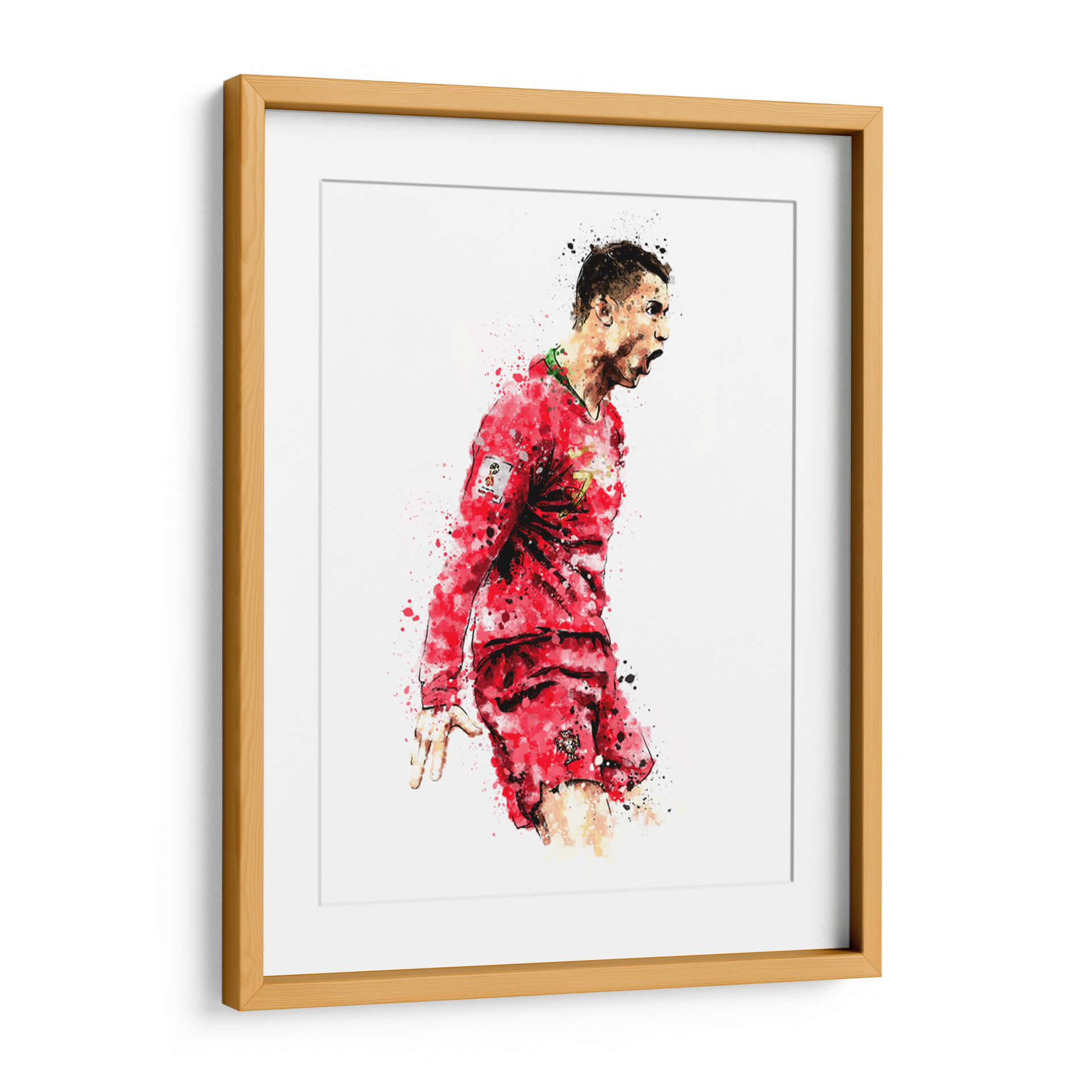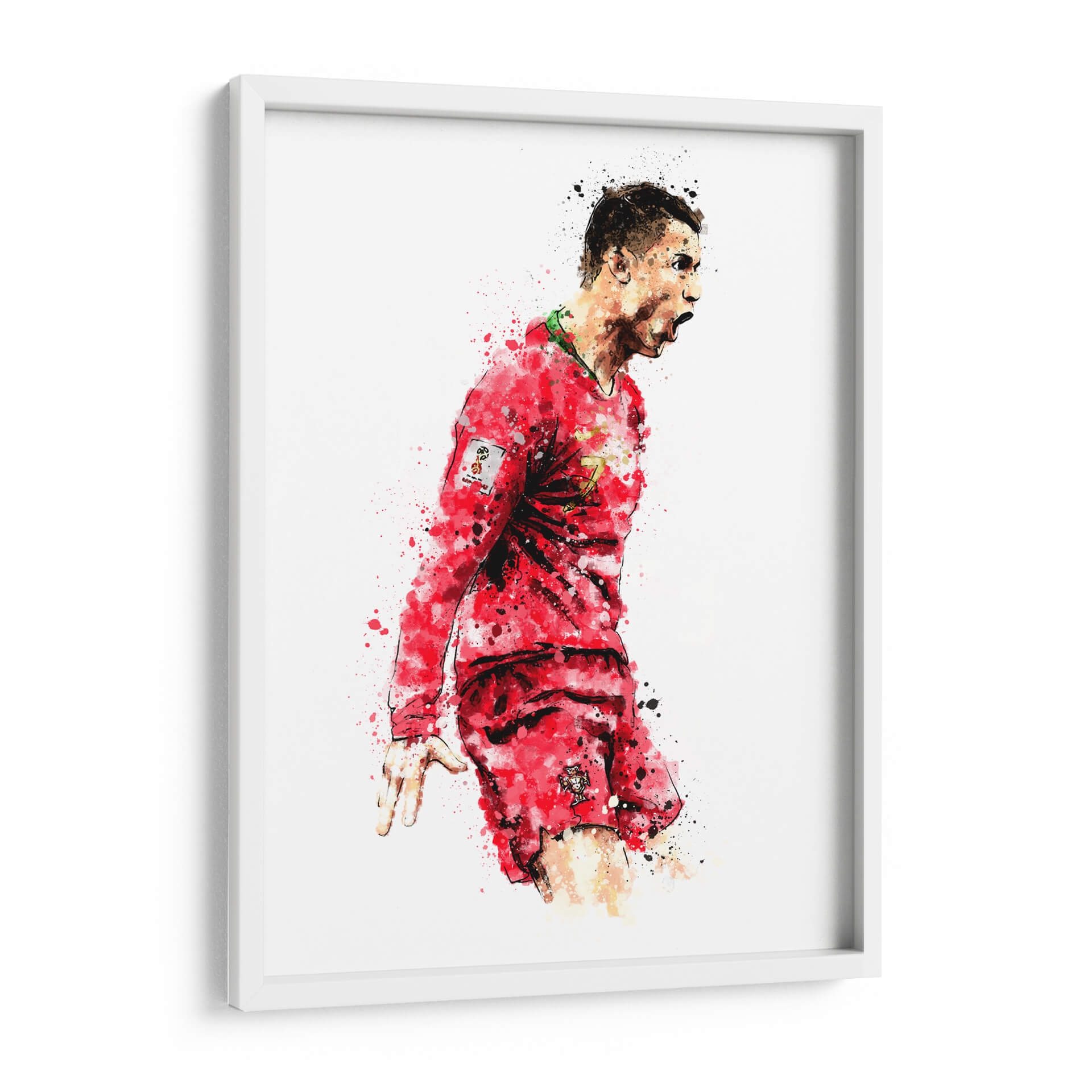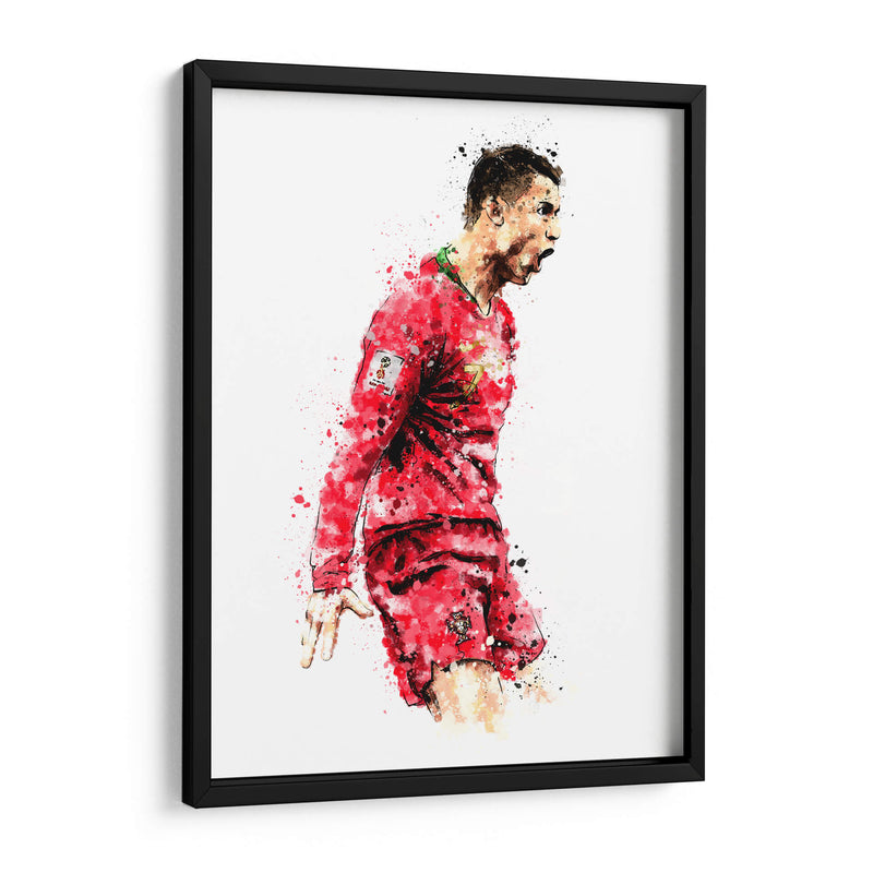 Captura la esencia de la pasión deportiva con este vibrante cuadro decorativo 'CR7 Portugal Colors'. La obra presenta una representación dinámica y expresiva del icónico futbolista Cristiano Ronaldo, sumergido en el fervor del juego. Utilizando una técnica que evoca la acuarela y salpicaduras de pintura, el artista Hue Art plasma la energía y la determinación del atleta en cada trazo. La paleta de colores se centra en los intensos rojos de la equipación portuguesa, salpicados con toques de verde y negro, que crean un contraste impactante sobre el fondo blanco y minimalista. La composición captura un momento de celebración o intensidad, con el rostro del jugador en primer plano y su cuerpo en movimiento, transmitiendo una sensación de poder y movimiento. Este cuadro decorativo es perfecto para los amantes del fútbol y para aquellos que buscan inyectar dinamismo y un espíritu competitivo en sus espacios. Ideal para salones, oficinas o habitaciones temáticas, este arte de pared se convierte en un punto focal que inspira y evoca la emoción del deporte rey. Añade un toque de carácter y motivación a tu decoración con esta pieza única.