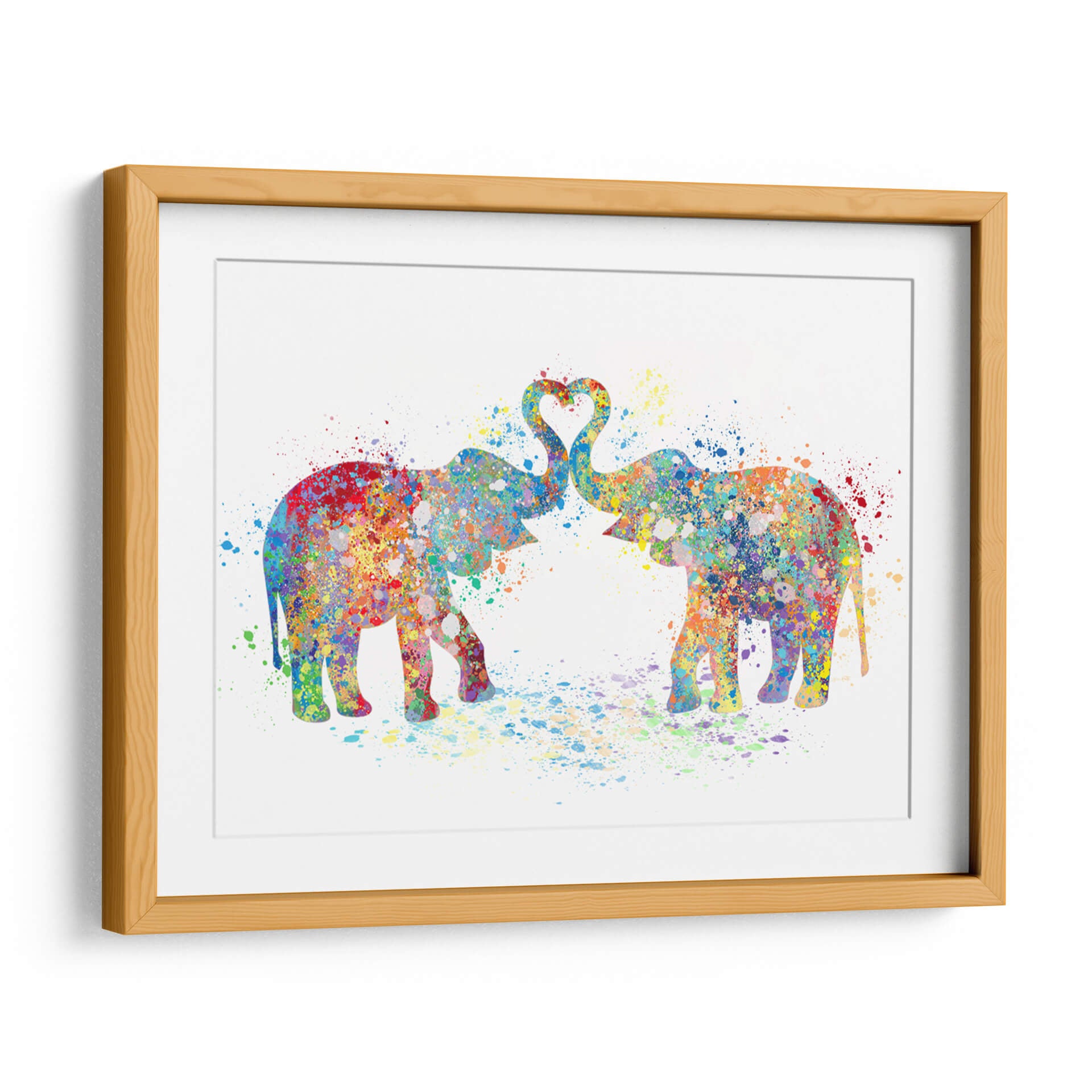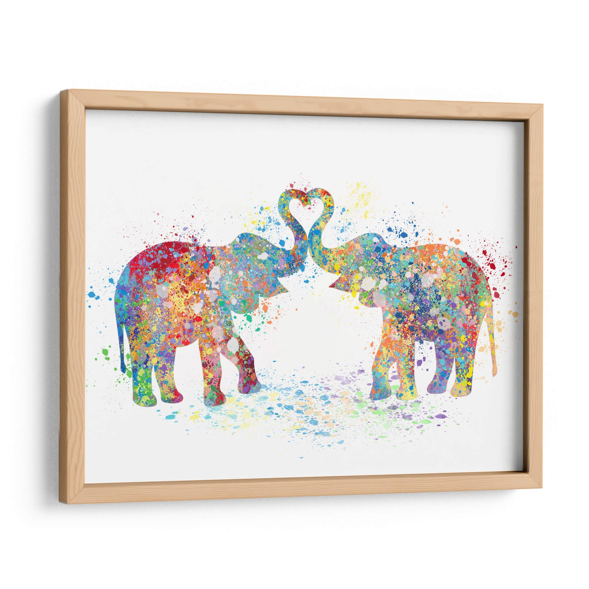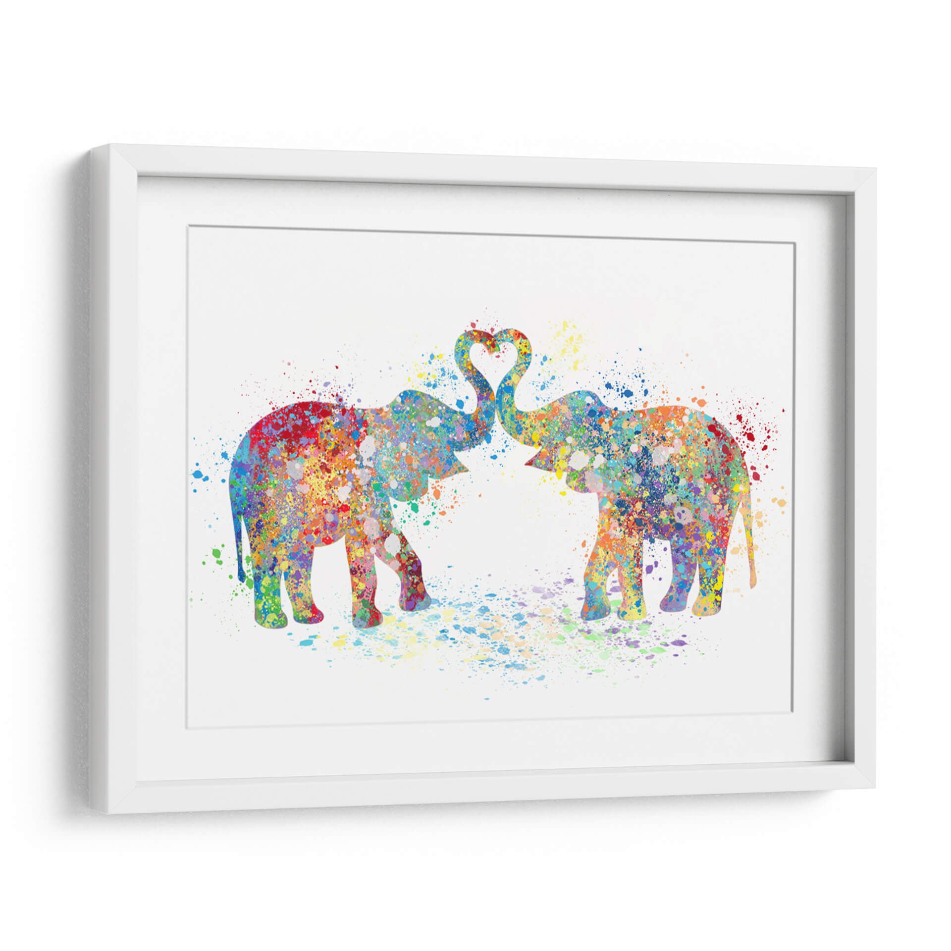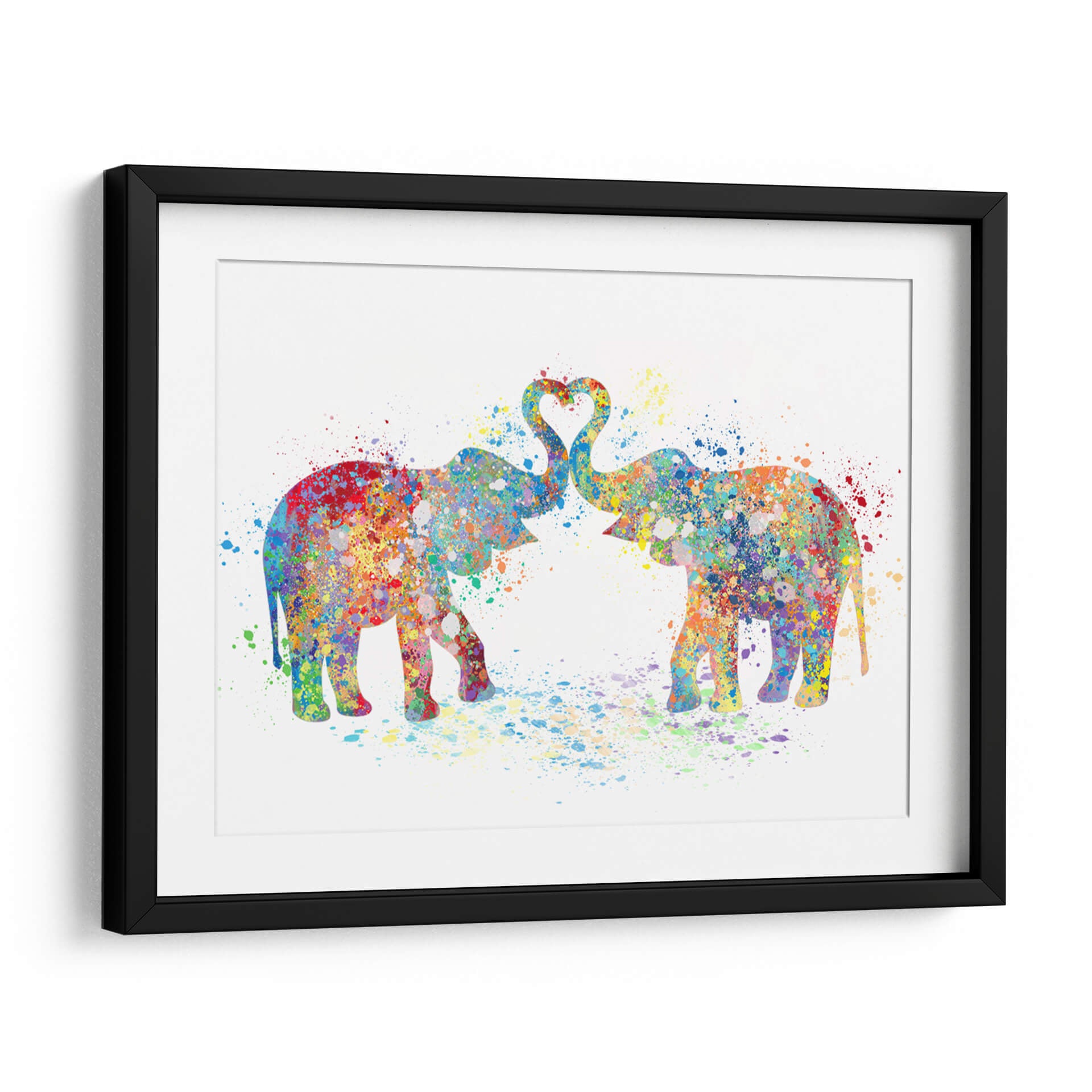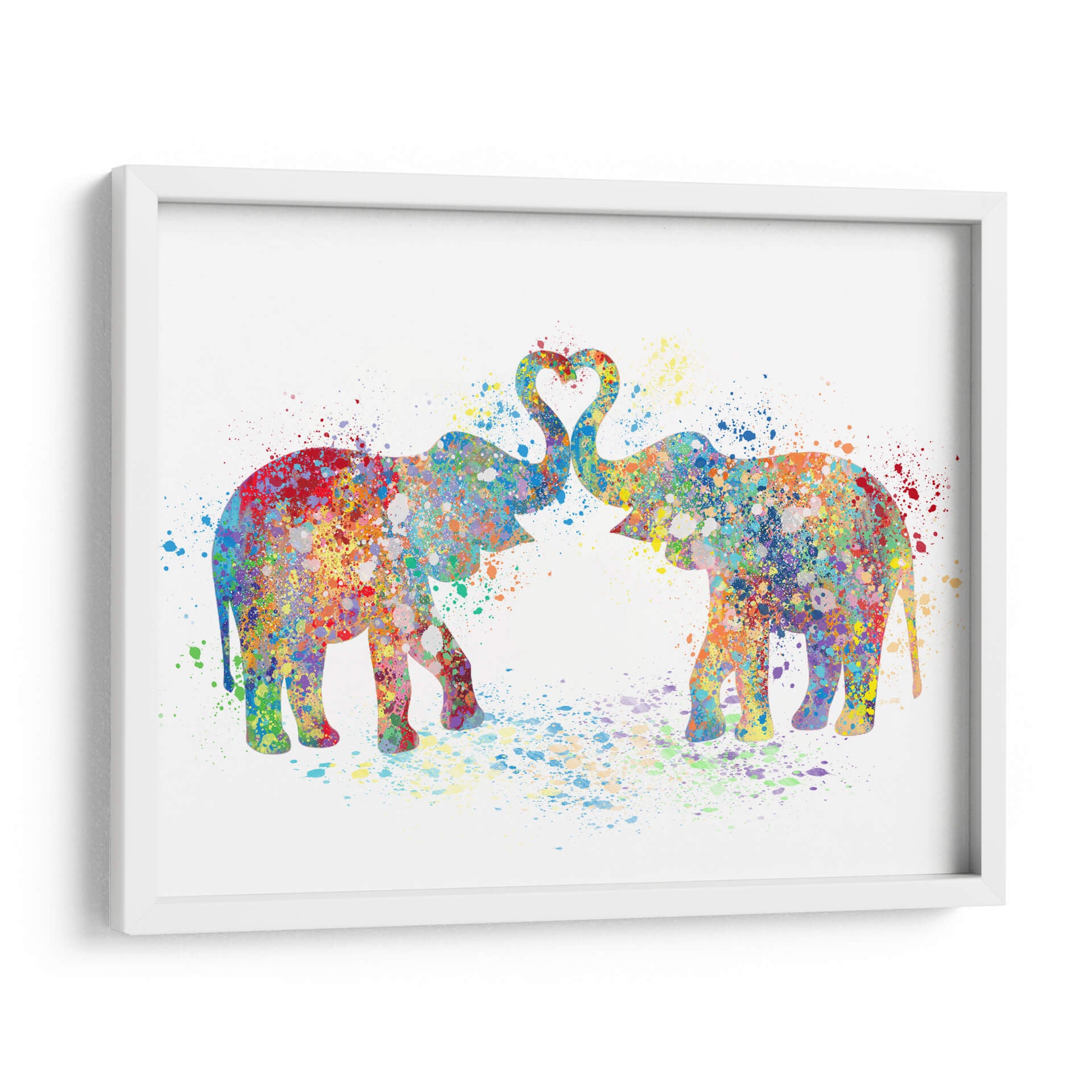 Sumérgete en la ternura y el color con "Elephant Love Colors 02", una obra de arte que celebra el amor y la conexión a través de una vibrante explosión de acuarela. Dos elefantes, representados con siluetas fluidas y salpicaduras de pintura, se unen con sus trompas formando un corazón perfecto en el aire, simbolizando la unión y el afecto. La técnica de acuarela, con sus efectos de goteo y capas translúcidas, otorga a la pieza una cualidad etérea y dinámica, mientras que la paleta de colores es un festín para los sentidos: desde rojos intensos y azules profundos hasta amarillos alegres y verdes frescos, cada tono se mezcla y salpica creando un efecto de alegría contagiosa. Esta pieza abstracta y contemporánea es ideal para añadir un toque de calidez y personalidad a cualquier espacio, ya sea una sala de estar moderna, un dormitorio acogedor o una oficina creativa. "Elephant Love Colors 02" no es solo una decoración de pared; es una declaración de amor, un recordatorio de la belleza en la diversidad de colores y la fuerza de los lazos afectivos, invitando a la reflexión y a la sonrisa. Su composición equilibrada y su energía positiva la convierten en una adición encantadora para quienes buscan arte que inspire y embellezca su hogar.