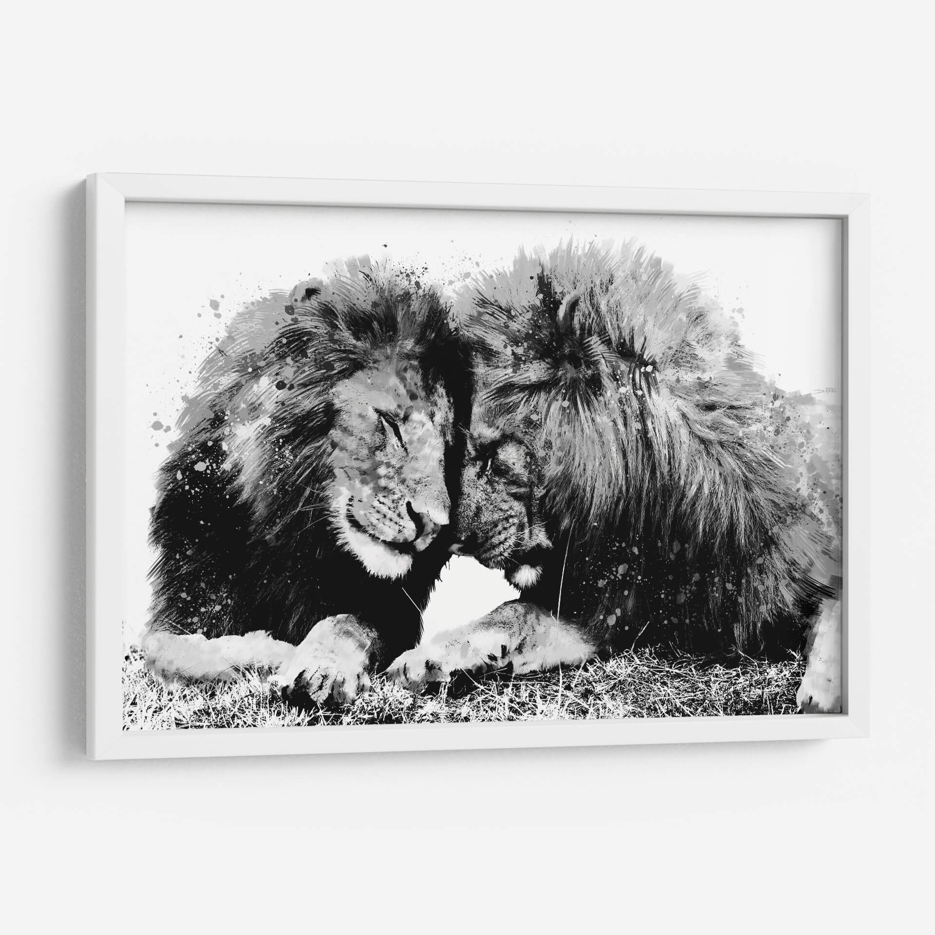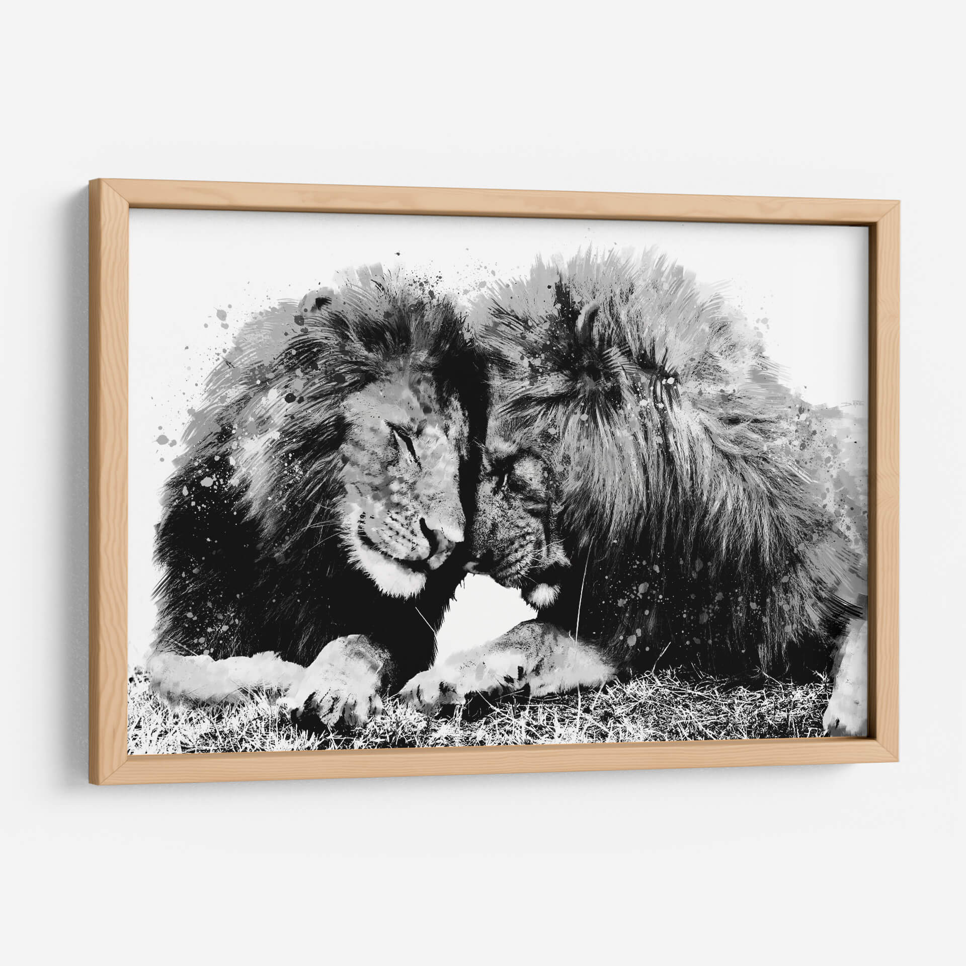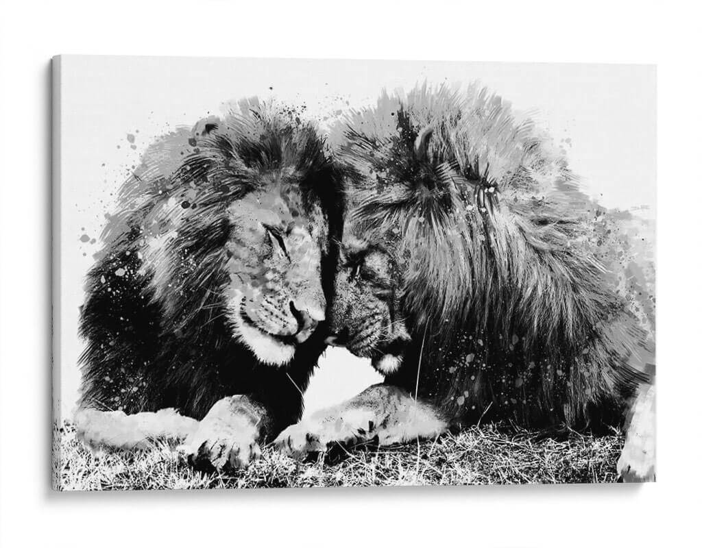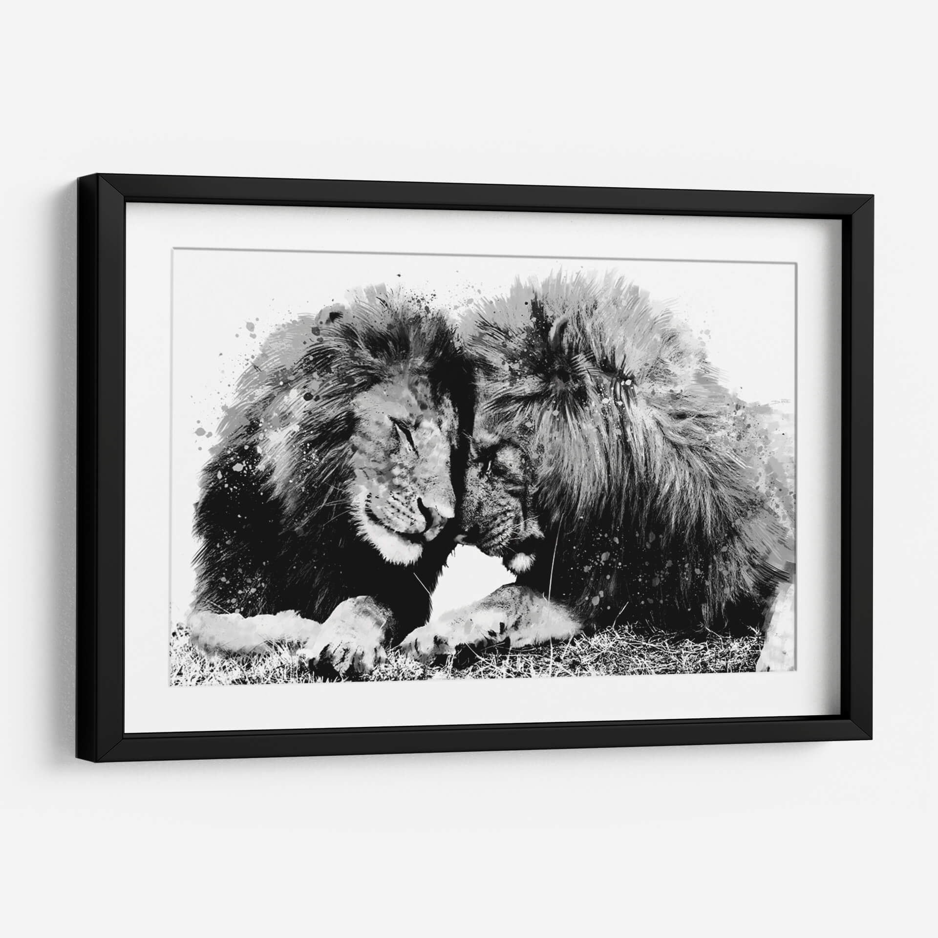 Captura la esencia de la fuerza y la conexión con este evocador cuadro decorativo 'Familia de Leones BnW' del artista Hue Art. La obra presenta un primer plano íntimo de dos leones, sus cabezas juntas en un gesto de profunda ternura y unidad. La técnica acuarelada, con salpicaduras y pinceladas que evocan el movimiento y la textura de sus melenas y el pasto, añade una dimensión artística y expresiva. La paleta monocromática, con intensos contrastes entre luces y sombras, realza la majestuosidad de los felinos y confiere a la pieza una elegancia atemporal. Este cuadro de leones es perfecto para quienes buscan añadir un toque de naturaleza salvaje y poder sereno a su hogar u oficina. Su estilo moderno y emotivo lo convierte en una pieza focal ideal para salas de estar, dormitorios o estudios, creando un ambiente de calma y respeto por la majestuosidad animal. Transforma tu espacio con esta obra de arte que celebra el vínculo familiar y la belleza indómita.