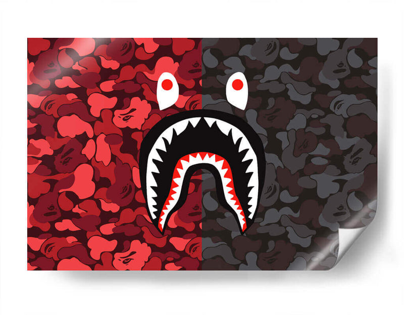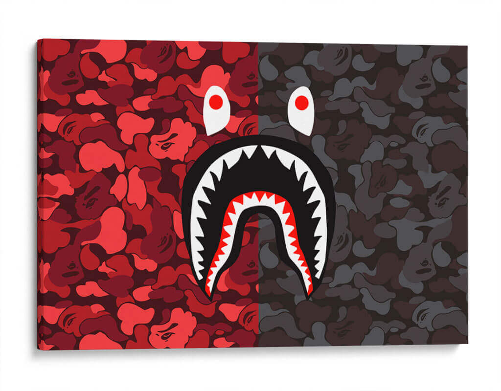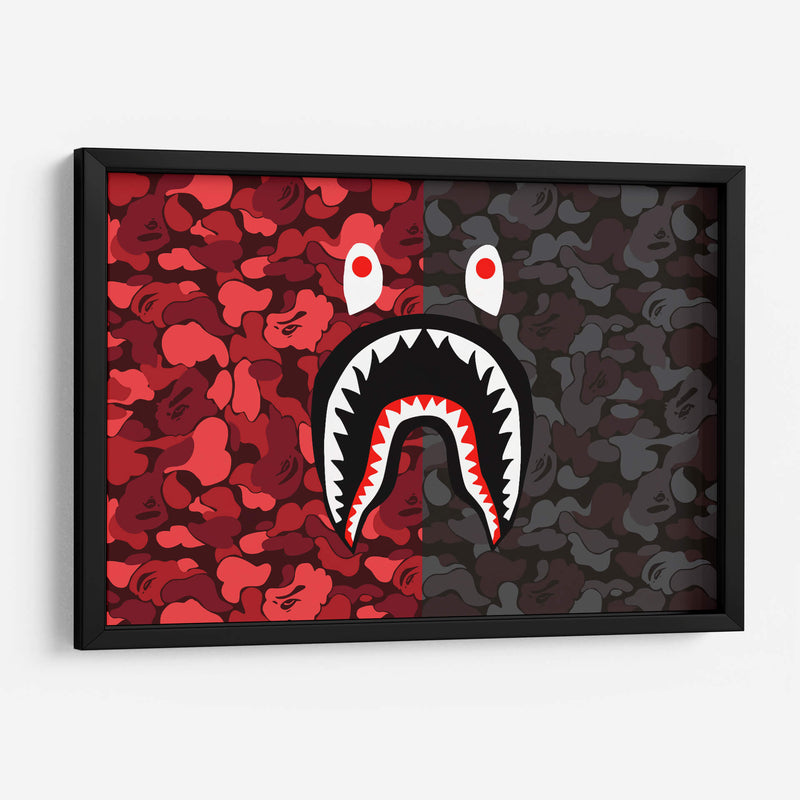 Este llamativo cuadro decorativo, titulado "Bape Red-Black Camo", es una obra maestra de arte contemporáneo que fusiona el icónico diseño de camuflaje con una audaz estética de tiburón. La pieza se divide visualmente en dos mitades, una vibrante en tonos rojos y la otra más sombría en grises y negros, creando un contraste dinámico. El centro de atención es la feroz boca de tiburón, representada con dientes afilados y un interior rojo encendido, que irradia energía y atrevimiento. Los ojos, de un blanco puro con pupilas rojas, añaden una mirada intensa a la composición. El fondo está cubierto por un patrón de camuflaje repetitivo, que añade textura y profundidad visual a la obra. Este cuadro es perfecto para quienes buscan añadir un toque urbano y moderno a su decoración, siendo ideal para salas de estar, estudios o incluso espacios comerciales que deseen proyectar una imagen audaz y vanguardista. Su diseño único lo convierte en un punto focal ineludible, capaz de transformar cualquier ambiente y reflejar una personalidad audaz y llena de carácter. Añade un toque de arte urbano a tu hogar con esta pieza impactante.