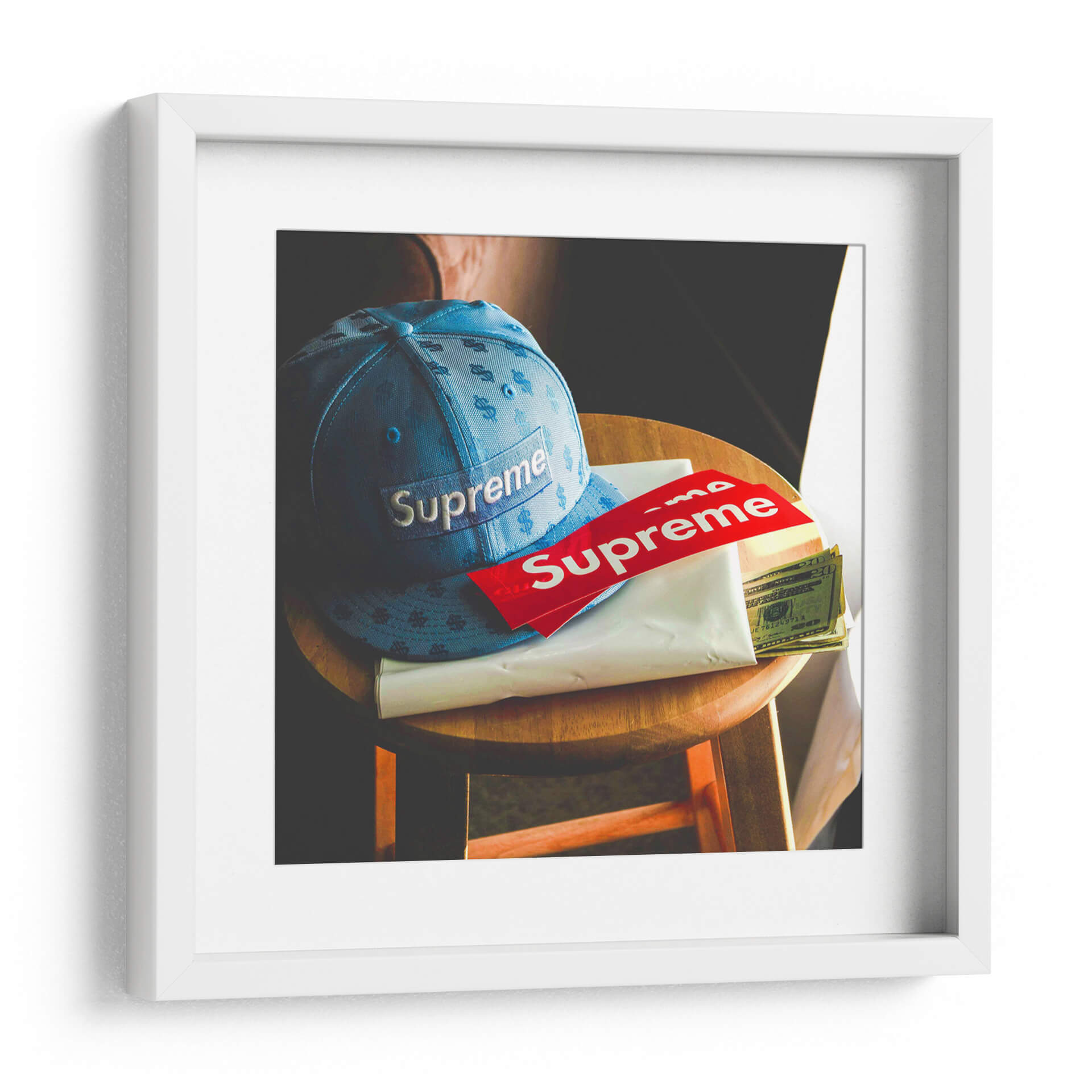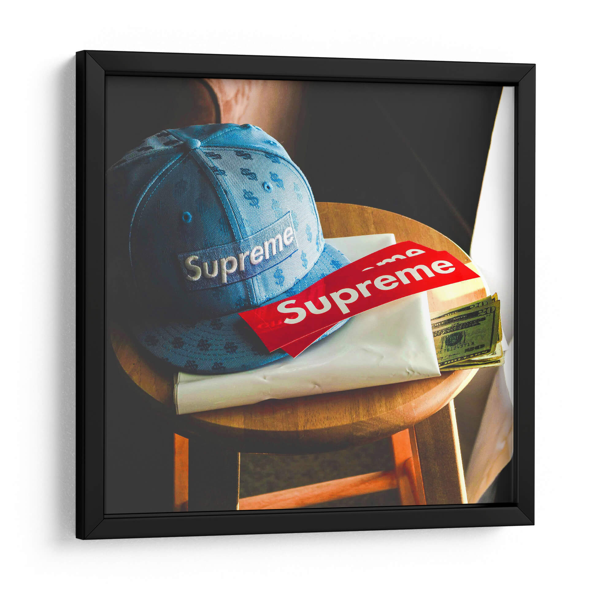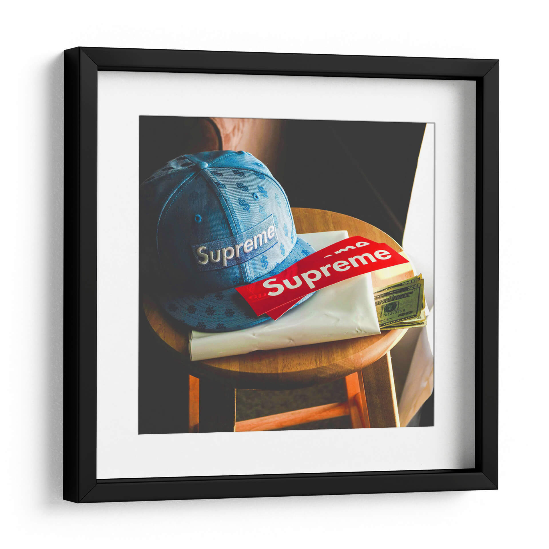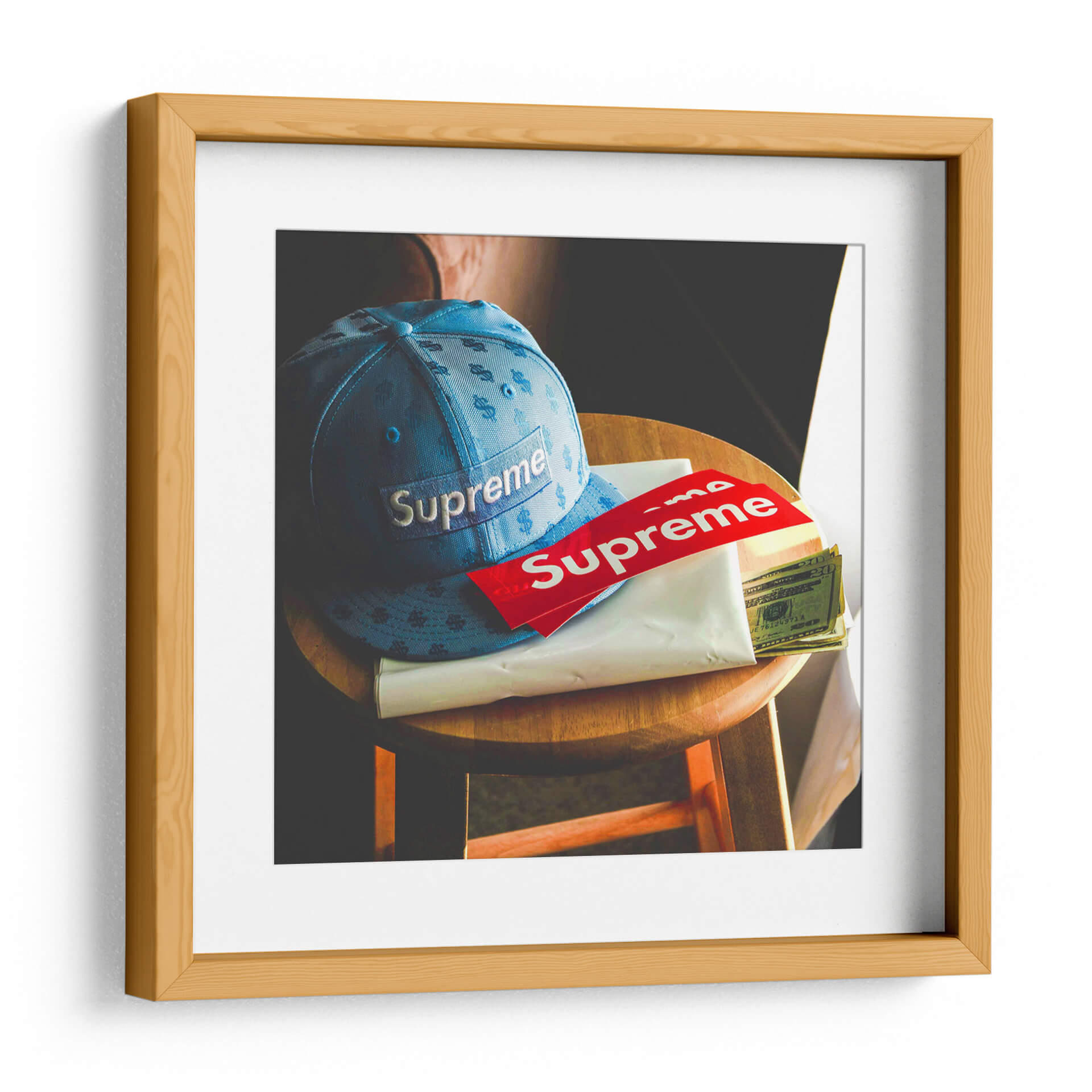 Captura la esencia del estilo urbano y la aspiración con esta impactante obra de arte. La pieza presenta un primer plano de una gorra azul, adornada con un patrón repetitivo de símbolos de dólar y el icónico logo "Supreme" bordado en blanco. Junto a la gorra, destaca una vibrante etiqueta roja con el mismo logotipo, evocando la cultura del streetwear y el deseo de éxito. La composición se completa con un fajo de billetes apilados discretamente, sugiriendo una conexión con la riqueza y el consumismo moderno. La paleta de colores, dominada por el azul claro de la gorra y el rojo enérgico de la etiqueta, crea un contraste visual llamativo. El fondo, con tonos cálidos y desenfocados, centra la atención en los elementos principales. Este lienzo es ideal para espacios que buscan un toque de personalidad audaz y contemporánea, como una sala de estar moderna, un estudio o una oficina con un espíritu dinámico. Transmite una atmósfera de ambición y la estética del hip-hop, convirtiéndose en una declaración de intenciones para cualquier coleccionista de arte urbano.