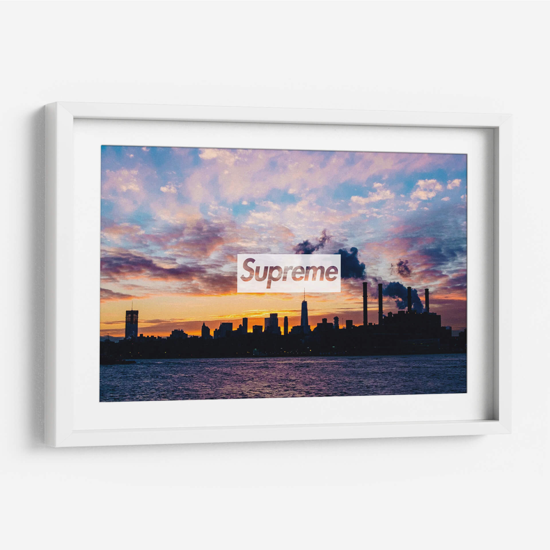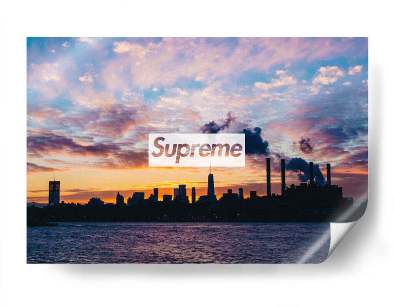 Captura la esencia urbana con este impresionante cuadro decorativo del skyline de Nueva York al atardecer. La obra presenta una silueta icónica de la ciudad, con edificios emblemáticos recortados contra un cielo dramático y colorido, donde los tonos cálidos del amanecer o anochecer se funden con nubes púrpuras y azules vibrantes. El agua en primer plano refleja sutilmente los colores del cielo, añadiendo profundidad y serenidad a la composición. En el centro, el distintivo logo de "Supreme" se integra armoniosamente, aportando un toque de estilo contemporáneo y urbano. Esta pieza es perfecta para quienes buscan añadir un elemento de sofisticación moderna a su hogar u oficina. Su diseño versátil la hace ideal para salas de estar, estudios o espacios de trabajo que requieran un acento visual potente y evocador. La energía de la ciudad, combinada con la belleza etérea del cielo, crea una atmósfera única que inspira y cautiva, convirtiendo cualquier pared en una ventana a la metrópoli. Este cuadro decorativo es una declaración de estilo y un recordatorio constante de la dinámica urbana.