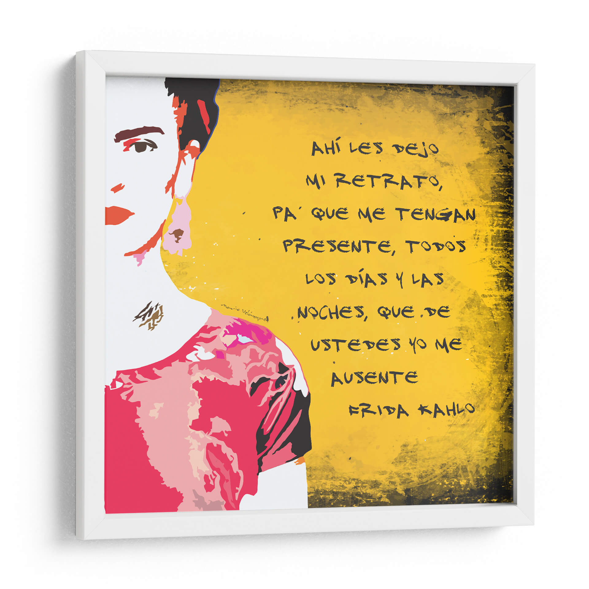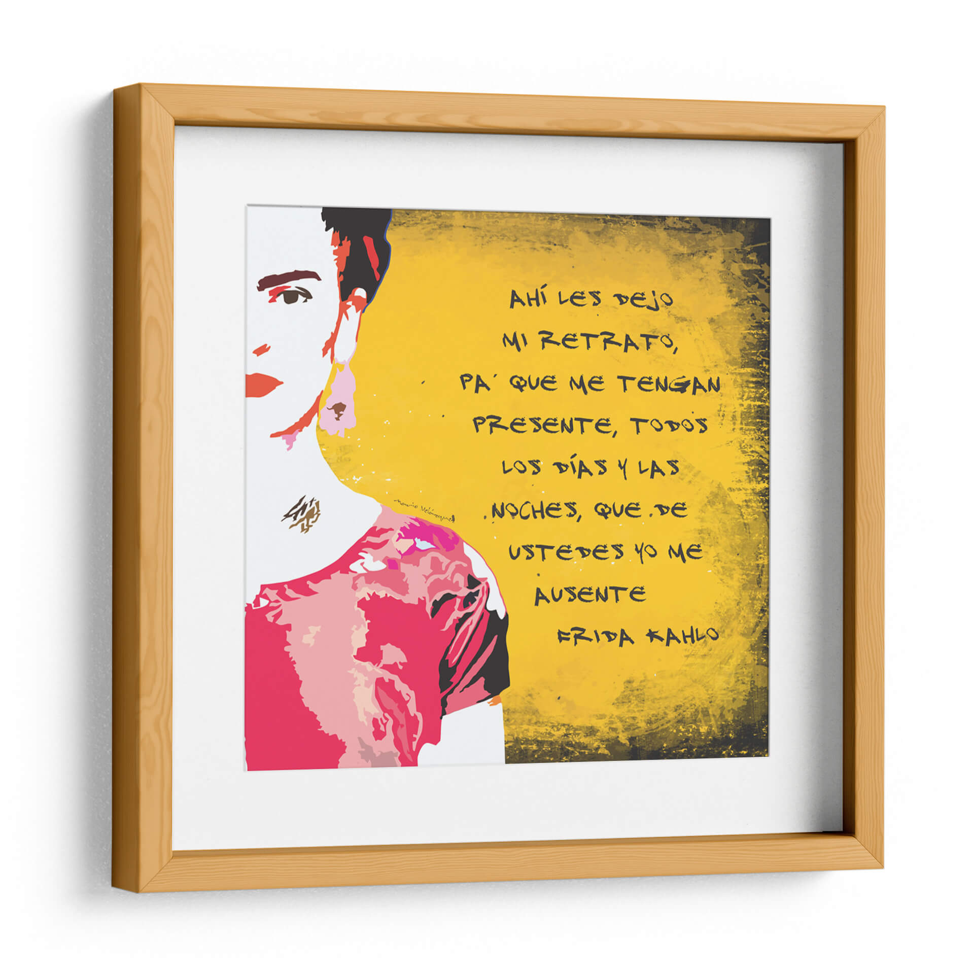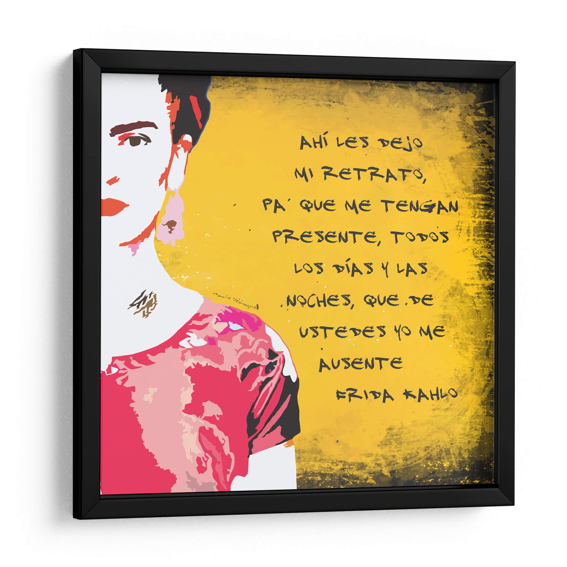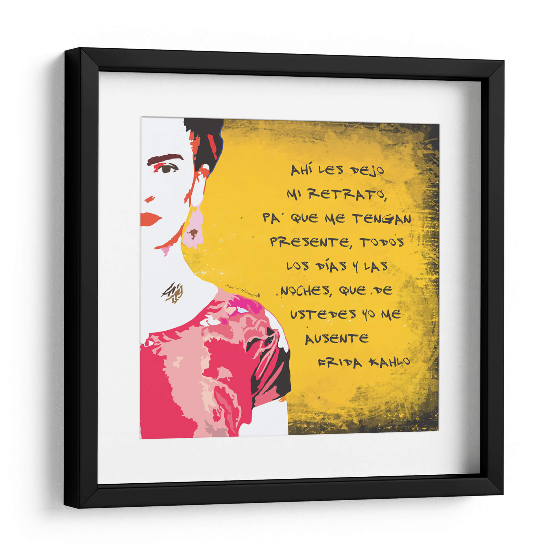 Inmortaliza el espíritu de una leyenda con este evocador cuadro decorativo "Ahí les dejo mi retrato" de Mario Velazquez, inspirado en Frida Kahlo. La obra presenta una representación estilizada y vibrante del icónico rostro de Frida, flanqueado por la poderosa cita "PA' QUE ME TENGAN PRESENTE, TODOS LOS DÍAS Y LAS NOCHES, QUE DE USTEDES YO ME AUSENTE". El fondo amarillo intenso irradia energía y pasión, mientras que la paleta de colores en la figura de Frida, con sus prominentes labios rojos, las flores en su vestimenta y sus pendientes, añade un toque de audacia y feminidad. El estilo artístico combina elementos del arte popular mexicano con una sensibilidad contemporánea, creando un retrato que es a la vez íntimo y audaz. Este cuadro decorativo es perfecto para infundir personalidad y conversación en cualquier espacio, ya sea una sala de estar, un estudio o una oficina. Su fuerte conexión con el arte y la cultura mexicana lo convierte en una pieza excepcional para los amantes del arte y admiradores de Frida Kahlo. Añade un toque de arte inspirador y un legado cultural a tu hogar con esta pieza única. Es ideal para quienes buscan un elemento decorativo que cuente una historia y celebre la resiliencia y el arte de vivir.