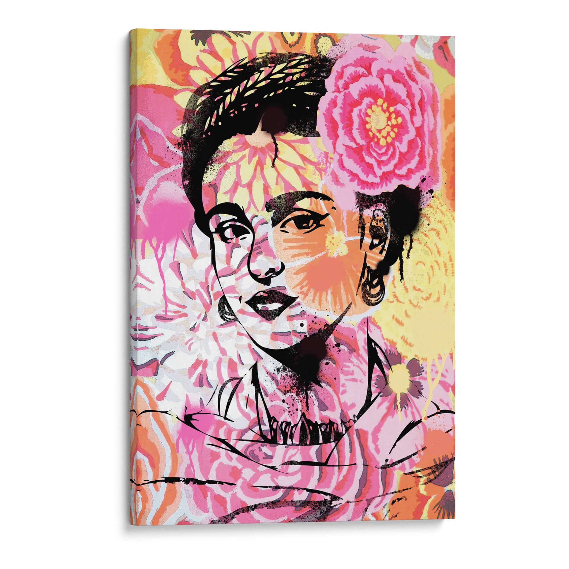 Sumérgete en la vibrante y cautivadora obra "Floral Frida", una pieza de arte contemporáneo que celebra la icónica figura de Frida Kahlo a través de una explosión de color y estilo. Este cuadro decorativo presenta un retrato estilizado de la artista, con trazos audaces en negro que definen sus rasgos distintivos, enmarcado por un torbellino de flores exuberantes en tonos rosas, naranjas y amarillos. La técnica de spray y las salpicaduras añaden una textura urbana y moderna, mientras que la composición general evoca una sensación de fuerza, pasión y resiliencia. "Floral Frida" es más que una simple imagen; es una declaración de estilo y personalidad. Ideal para espacios que buscan un toque de carácter y un homenaje a una de las artistas más influyentes del siglo XX, esta obra es perfecta para salas de estar, estudios o cualquier lugar donde desees inspirar creatividad y conversación. Su paleta de colores cálidos y contrastantes la convierte en un punto focal impactante que transformará cualquier habitación, aportando energía y un aire bohemio-chic. Añade esta pieza única a tu colección y deja que la fuerza de Frida Kahlo florezca en tu hogar.