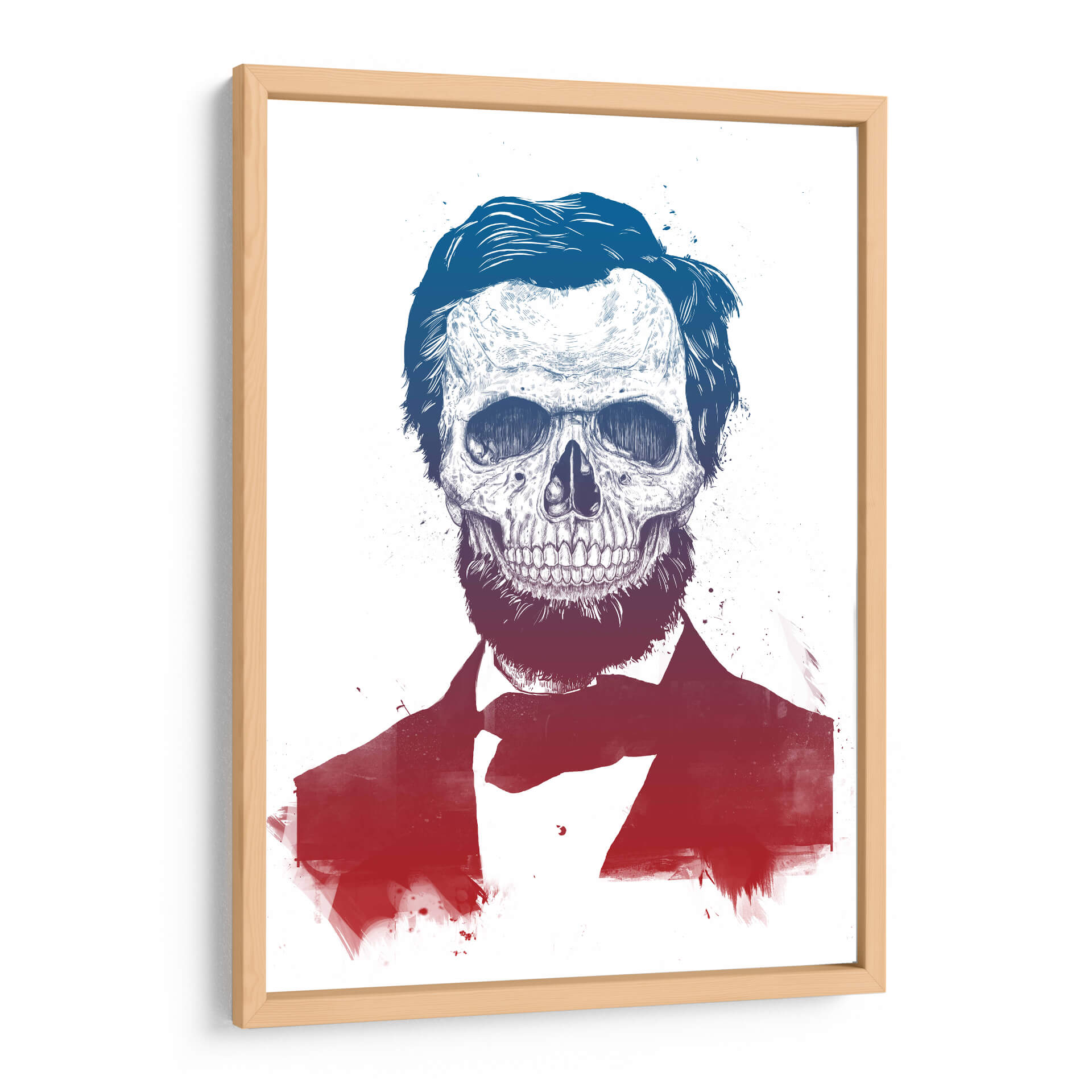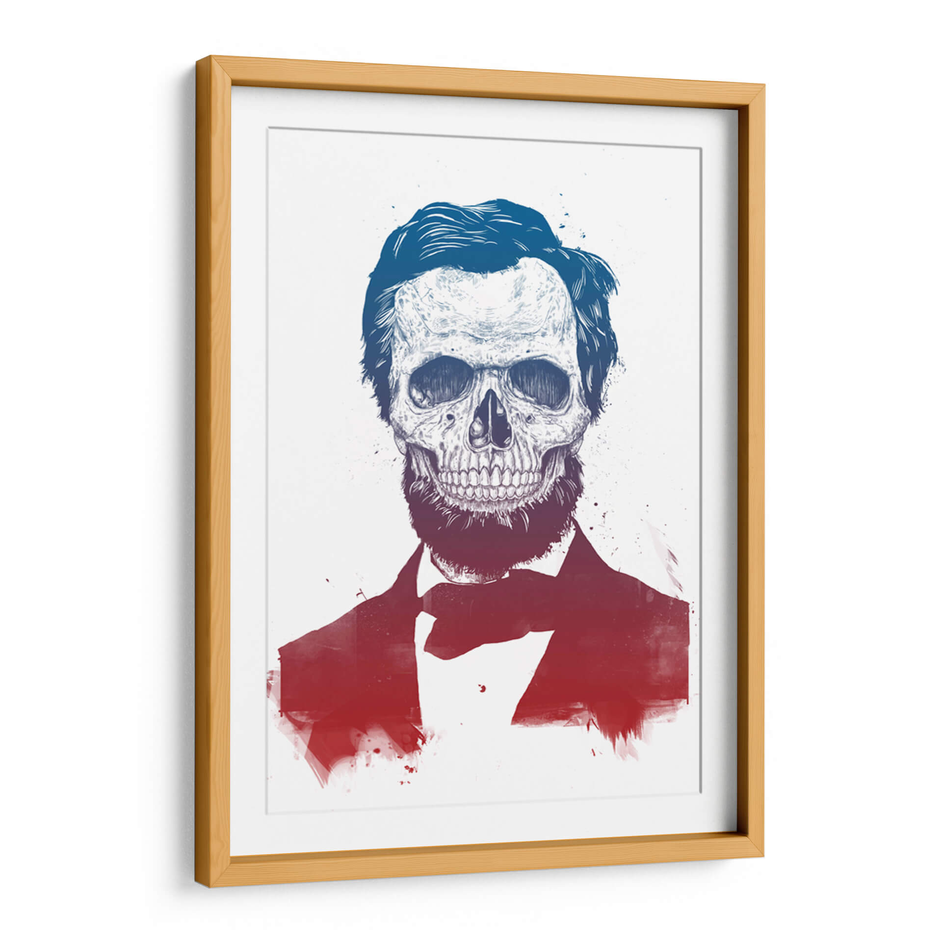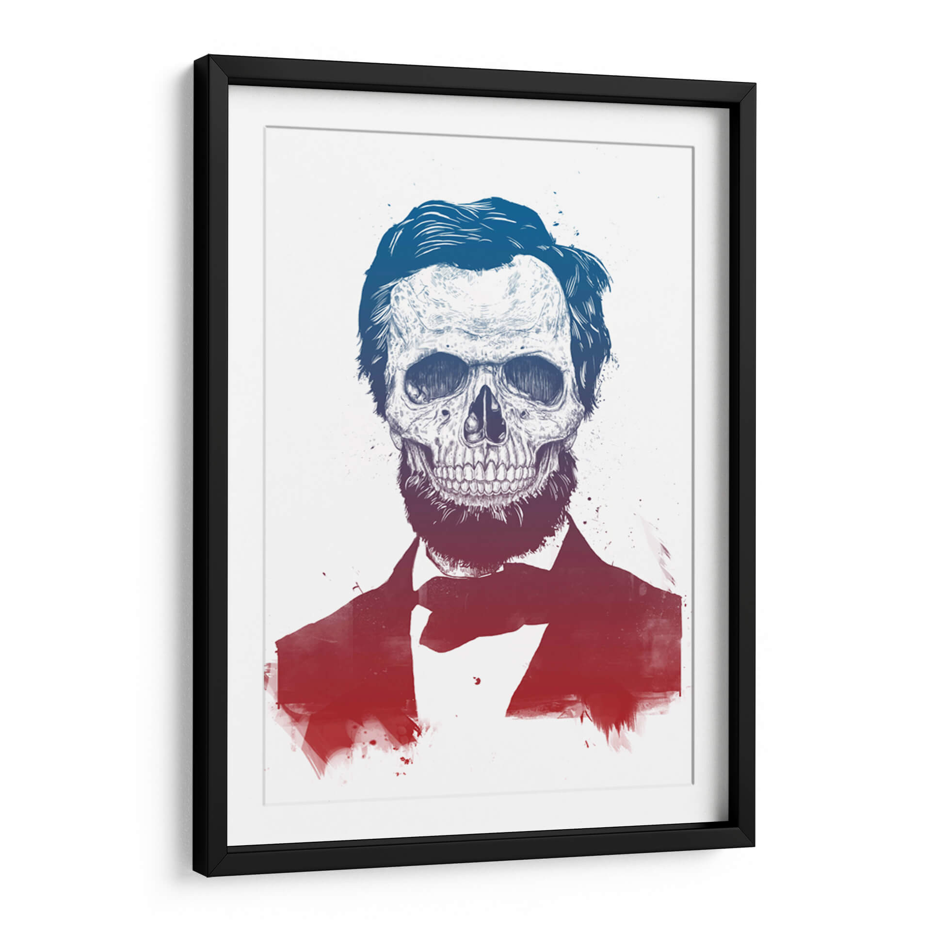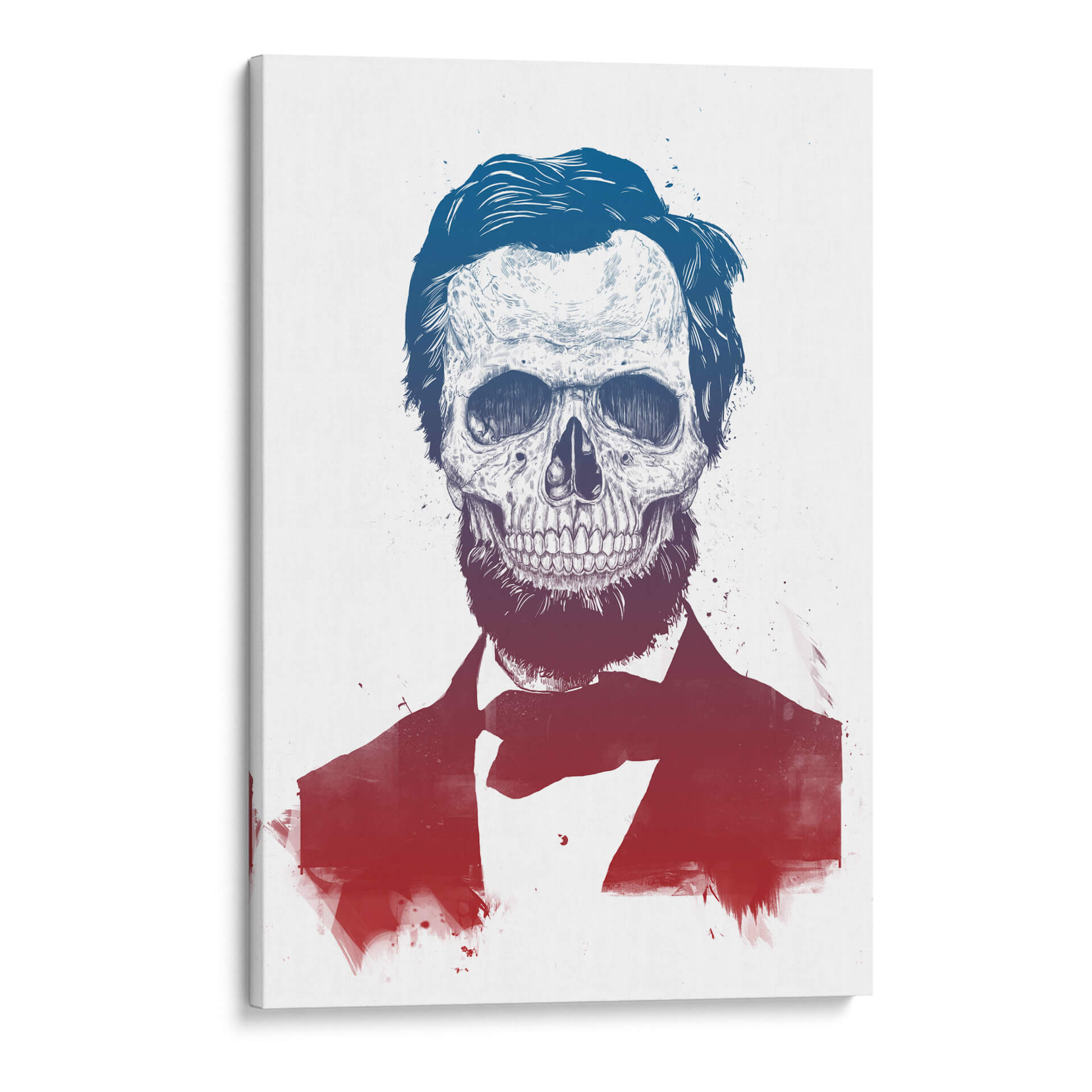 Este impactante cuadro decorativo, titulado 'Lincoln Muerto' por Balazs Solti, reimagina un ícono histórico a través de una lente surrealista y audaz. La obra presenta un retrato crudo y detallado de un cráneo humano que sustituye el rostro de Abraham Lincoln, capturando la esencia de la mortalidad y la figura histórica en un solo plano. La paleta de colores es deliberadamente limitada pero efectiva, con tonos azules oscuros que definen el cabello y contrastan con los rojos vibrantes que tiñen la vestimenta formal, creando una tensión visual dinámica. El estilo artístico combina elementos de ilustración detallada con un toque de expresionismo abstracto en las pinceladas de color, lo que le confiere una modernidad intrigante. La atmósfera general es sombría pero provocativa, invitando a la reflexión sobre la historia, el poder y la transitoriedad. Ideal para espacios que buscan un toque de arte contemporáneo con un trasfondo conceptual, como oficinas, estudios o salas de estar que apelan a lo inusual y lo memorable. Este cuadro decorativo es una pieza de conversación que fusiona lo clásico con lo vanguardista, perfecta para quienes aprecian el arte que desafía las convenciones y estimula el pensamiento.