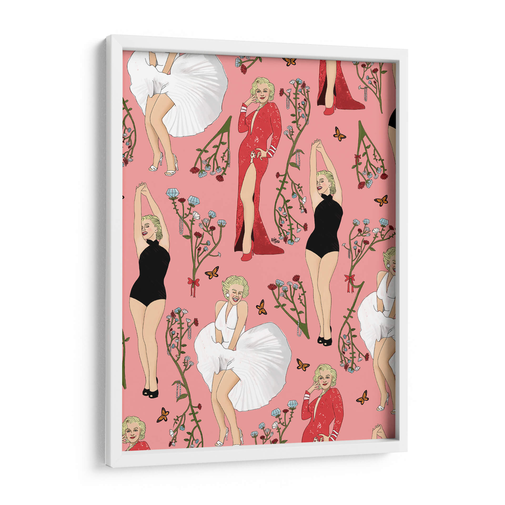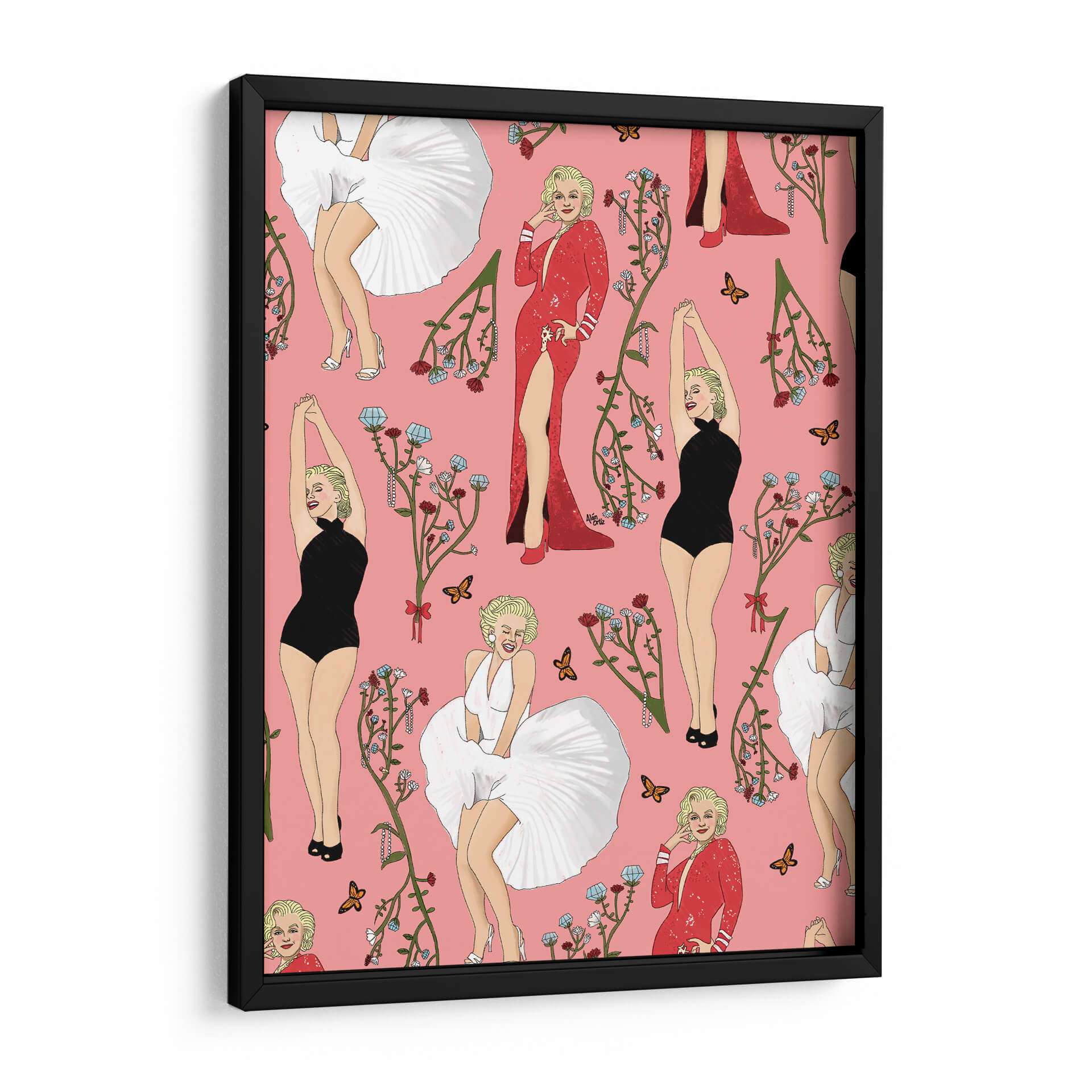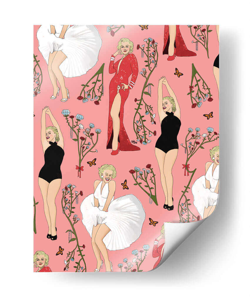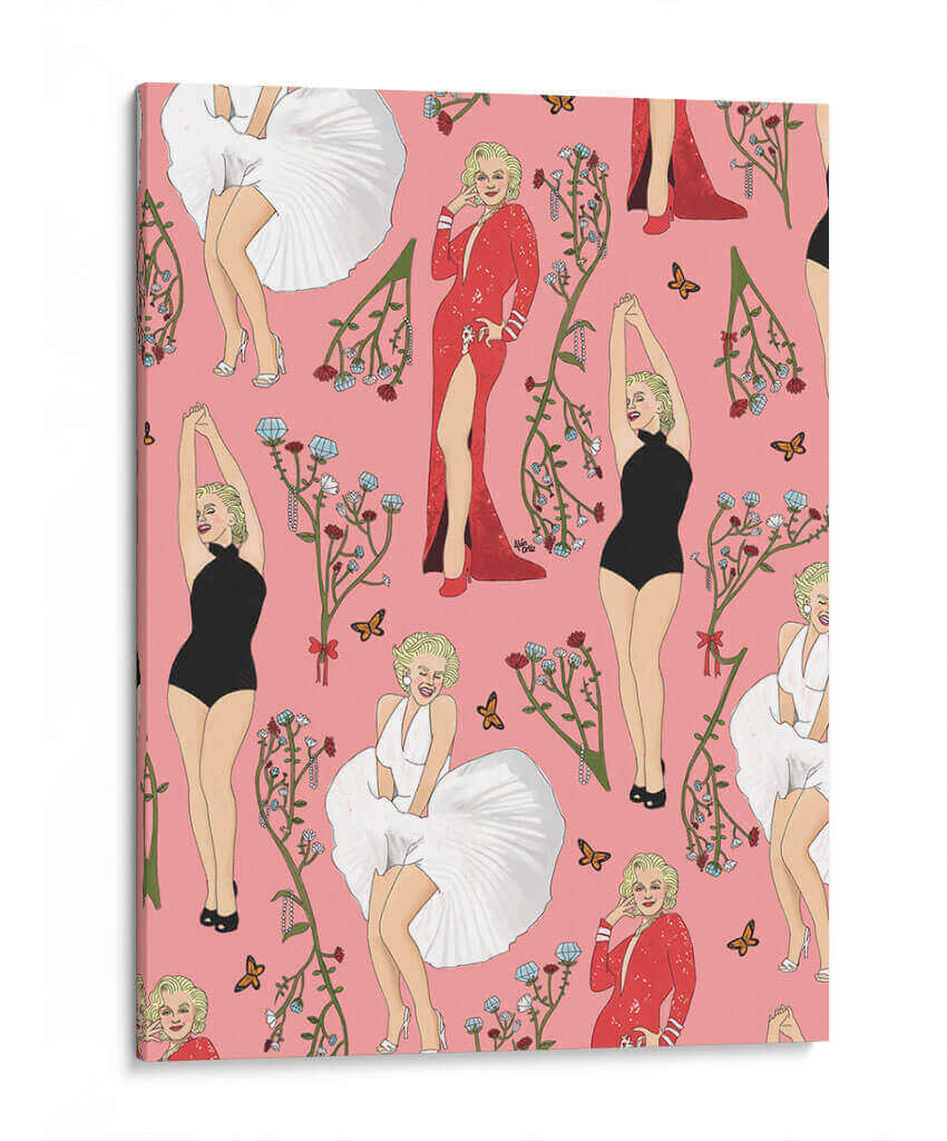 Este cautivador cuadro decorativo, titulado 'Monroe' y creado por el artista Alán Ortiz, es una obra vibrante y llena de estilo que evoca la icónica figura de Marilyn Monroe. La composición presenta un patrón repetitivo de la legendaria actriz en diversas poses y atuendos, incluyendo su famoso vestido blanco ondulante, un elegante traje de baño negro y un deslumbrante vestido rojo con una abertura pronunciada. Cada representación está adornada con delicadas ramas florales en tonos rojizos y azules, junto con mariposas que añaden un toque de delicadeza y movimiento. El fondo rosa pastel proporciona un lienzo alegre y distintivo que realza la figura de Monroe y los elementos decorativos. El estilo de la obra es una mezcla de ilustración pop art y elementos decorativos, con un toque de nostalgia y glamour. Ideal para añadir un punto focal audaz y una dosis de sofisticación a cualquier espacio, desde una sala de estar moderna hasta un tocador o una oficina con personalidad. Este cuadro decorativo no solo celebra a un icono cultural, sino que también aporta una energía juguetona y chic a tu decoración, convirtiéndose en una pieza de conversación para cualquier amante del arte y la cultura pop.