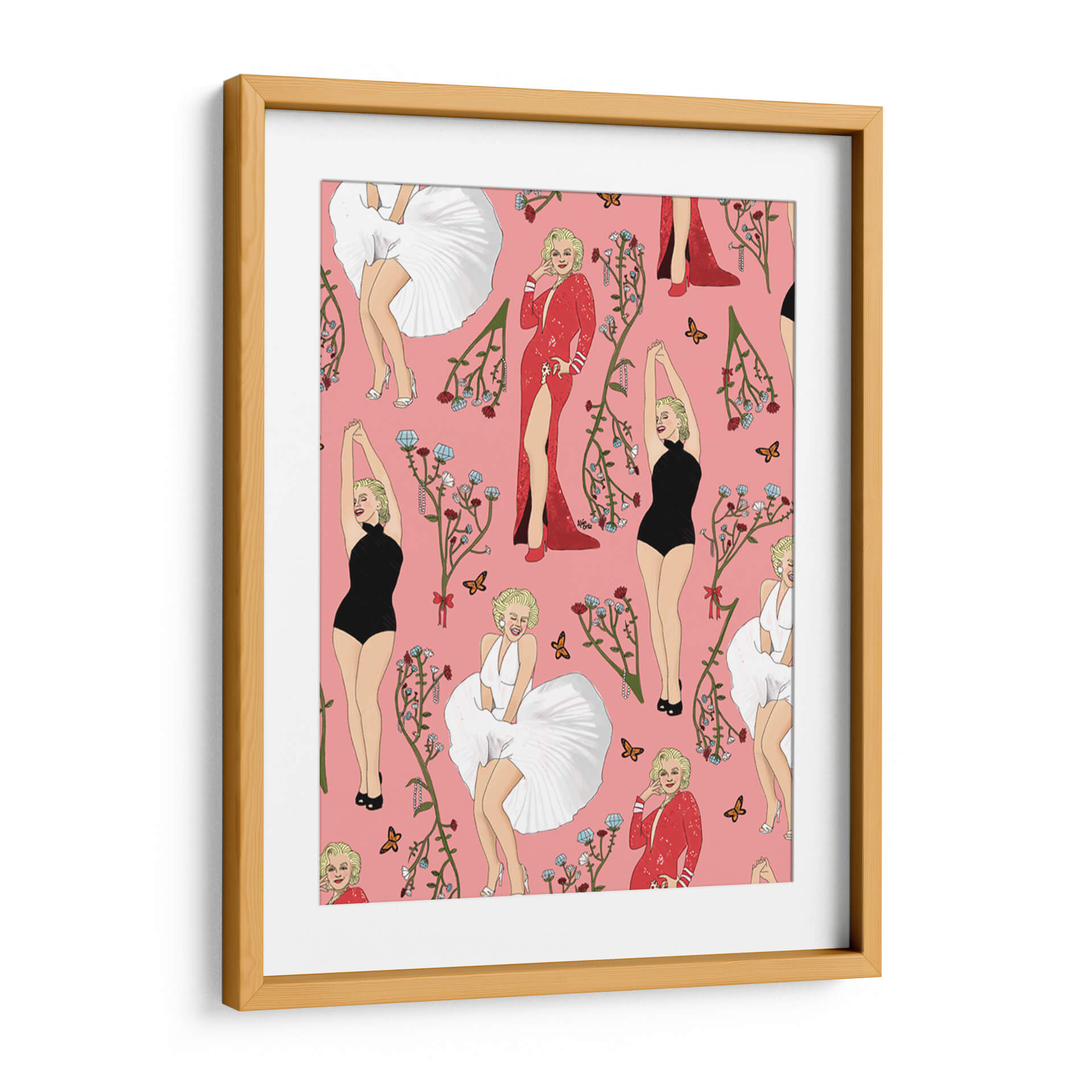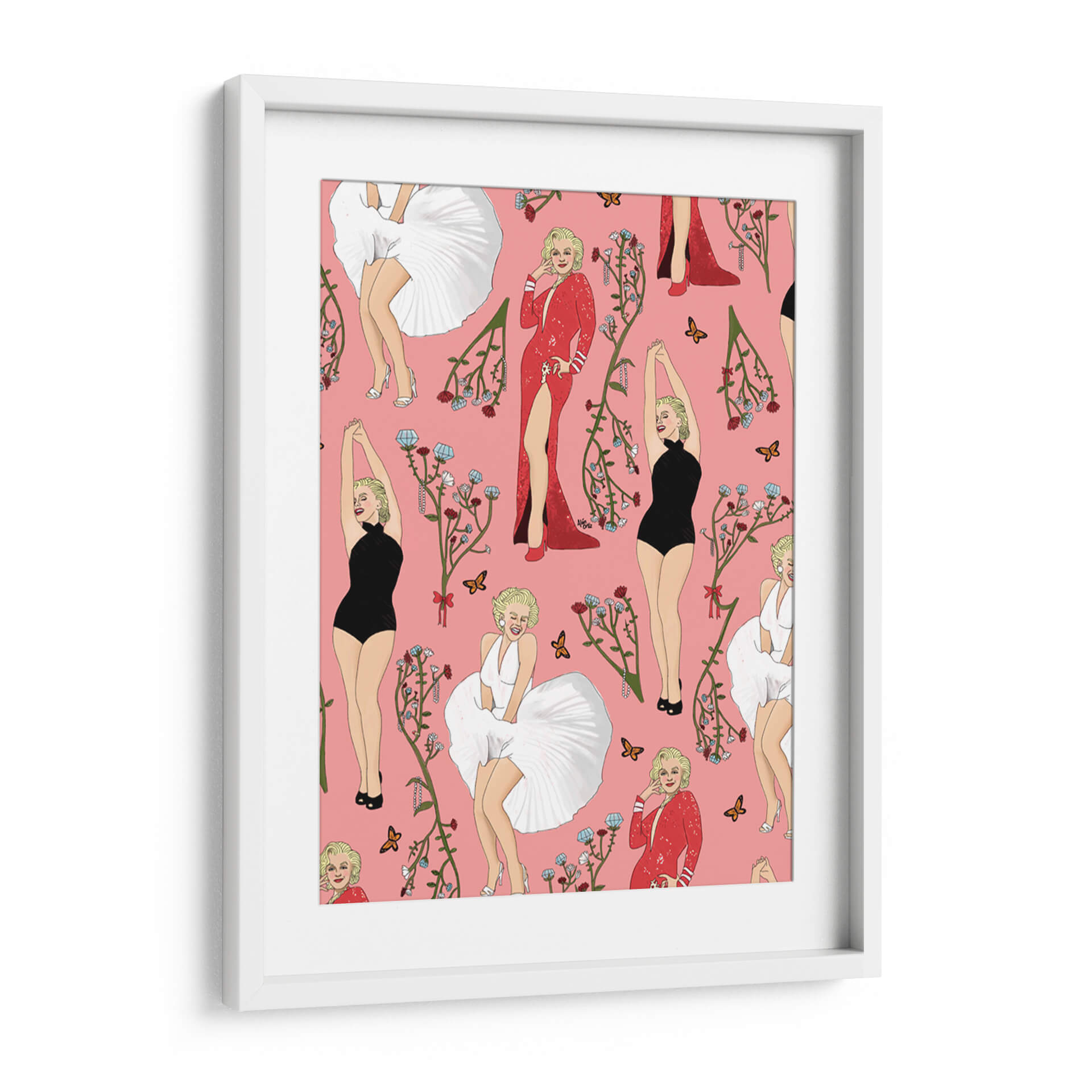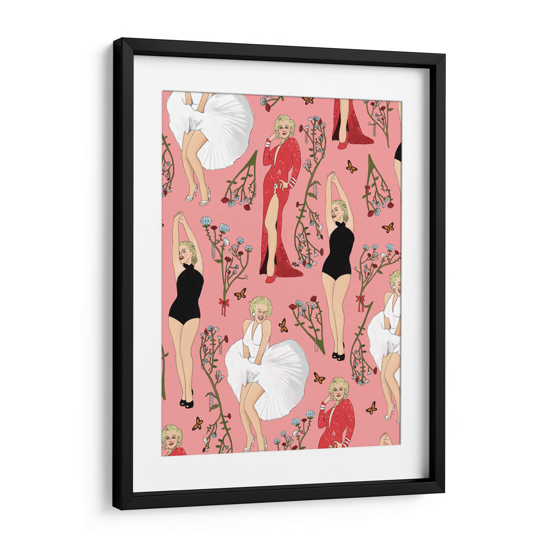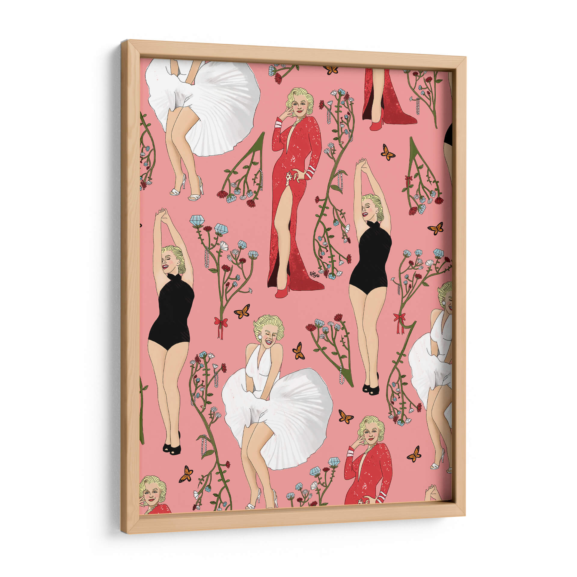 Este cautivador cuadro decorativo, titulado 'Monroe' y creado por el artista Alán Ortiz, es una obra vibrante y llena de estilo que evoca la icónica figura de Marilyn Monroe. La composición presenta un patrón repetitivo de la legendaria actriz en diversas poses y atuendos, incluyendo su famoso vestido blanco ondulante, un elegante traje de baño negro y un deslumbrante vestido rojo con una abertura pronunciada. Cada representación está adornada con delicadas ramas florales en tonos rojizos y azules, junto con mariposas que añaden un toque de delicadeza y movimiento. El fondo rosa pastel proporciona un lienzo alegre y distintivo que realza la figura de Monroe y los elementos decorativos. El estilo de la obra es una mezcla de ilustración pop art y elementos decorativos, con un toque de nostalgia y glamour. Ideal para añadir un punto focal audaz y una dosis de sofisticación a cualquier espacio, desde una sala de estar moderna hasta un tocador o una oficina con personalidad. Este cuadro decorativo no solo celebra a un icono cultural, sino que también aporta una energía juguetona y chic a tu decoración, convirtiéndose en una pieza de conversación para cualquier amante del arte y la cultura pop.