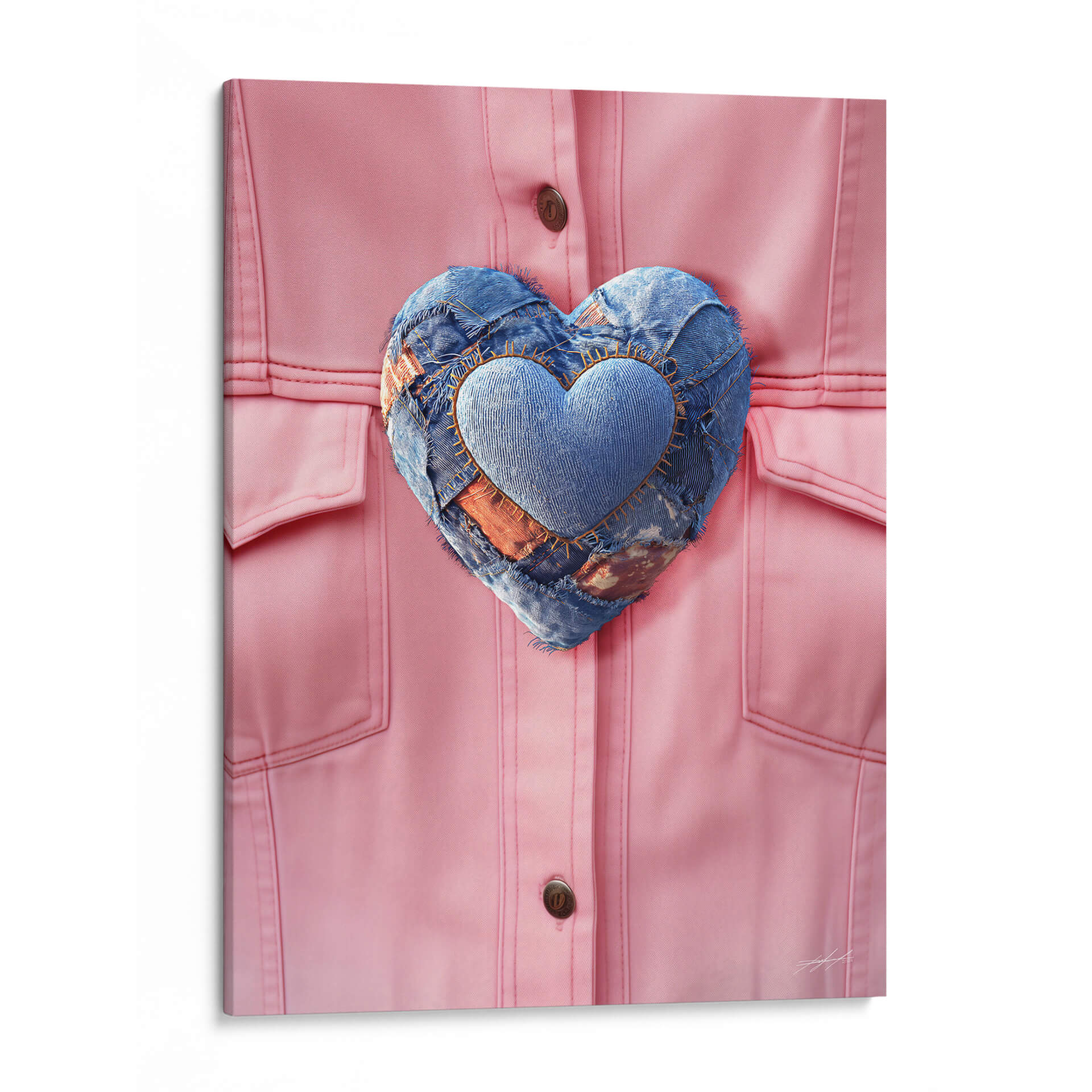 Sumérgete en la ternura y la originalidad con "Amor de Mezclilla", un cuadro decorativo que celebra el afecto a través de materiales inesperados. Esta obra de arte presenta un corazón intrincadamente confeccionado con retazos de mezclilla, cosido con hilos dorados que aportan un toque de calidez y detalle artesanal. El corazón descansa sobre un fondo de tela rosa suave, simulando una prenda de vestir con sus costuras y botones sutiles, creando un contraste visual cautivador entre la textura rústica del denim y la delicadeza del rosa. La paleta de colores, centrada en los azules profundos de la mezclilla y el suave rosa, evoca sentimientos de nostalgia, confort y amor incondicional. El estilo, que fusiona elementos de arte textil y fotografía conceptual, resulta moderno y único, ideal para quienes buscan añadir un toque distintivo y lleno de personalidad a sus espacios. "Amor de Mezclilla" es perfecto para dormitorios, salas de estar o cualquier rincón que necesite una dosis de cariño y originalidad. Este cuadro decorativo no solo embellece, sino que también cuenta una historia de conexión y afecto, convirtiéndose en un punto focal encantador y conmovedor en cualquier hogar. Añade esta pieza única a tu colección y deja que su mensaje de amor transforme tu ambiente.