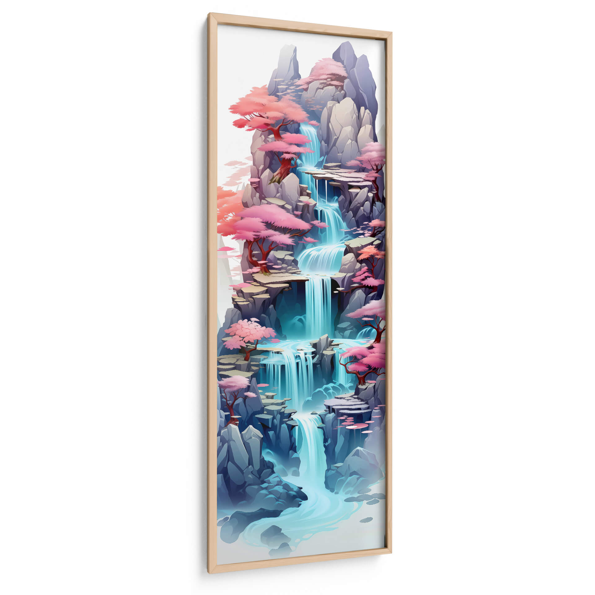 Sumérgete en la serenidad y la belleza etérea de "Cascada de la Vida - 16", una obra de arte digital que captura la esencia de un paisaje natural sereno con un toque vibrante. Este cuadro decorativo presenta una cascada de aguas cristalinas que desciende en cascada por formaciones rocosas escarpadas, rodeada de exuberante vegetación con vibrantes tonos rosados y lilas. La paleta de colores, dominada por azules turquesa profundos y suaves rosas pastel, crea una atmósfera de calma y tranquilidad, contrastando maravillosamente con los grises y azules más oscuros de las rocas. El estilo pictórico, que evoca la delicadeza del arte oriental y la fluidez del impresionismo, invita a la contemplación. "Cascada de la Vida - 16" es ideal para transformar cualquier espacio, ya sea un dormitorio que busca paz, una sala de estar moderna que necesita un acento de color, o una oficina que aspira a un ambiente inspirador. Este cuadro decorativo abstracto de paisajes es una pieza que resonará con quienes buscan un oasis de tranquilidad y belleza en su decoración, aportando un toque de naturaleza estilizada y vibrante a su hogar. Su composición vertical y detallada captura la mirada, invitando a perderse en sus delicados matices y fluidas formas, convirtiéndose en un punto focal único y cautivador.