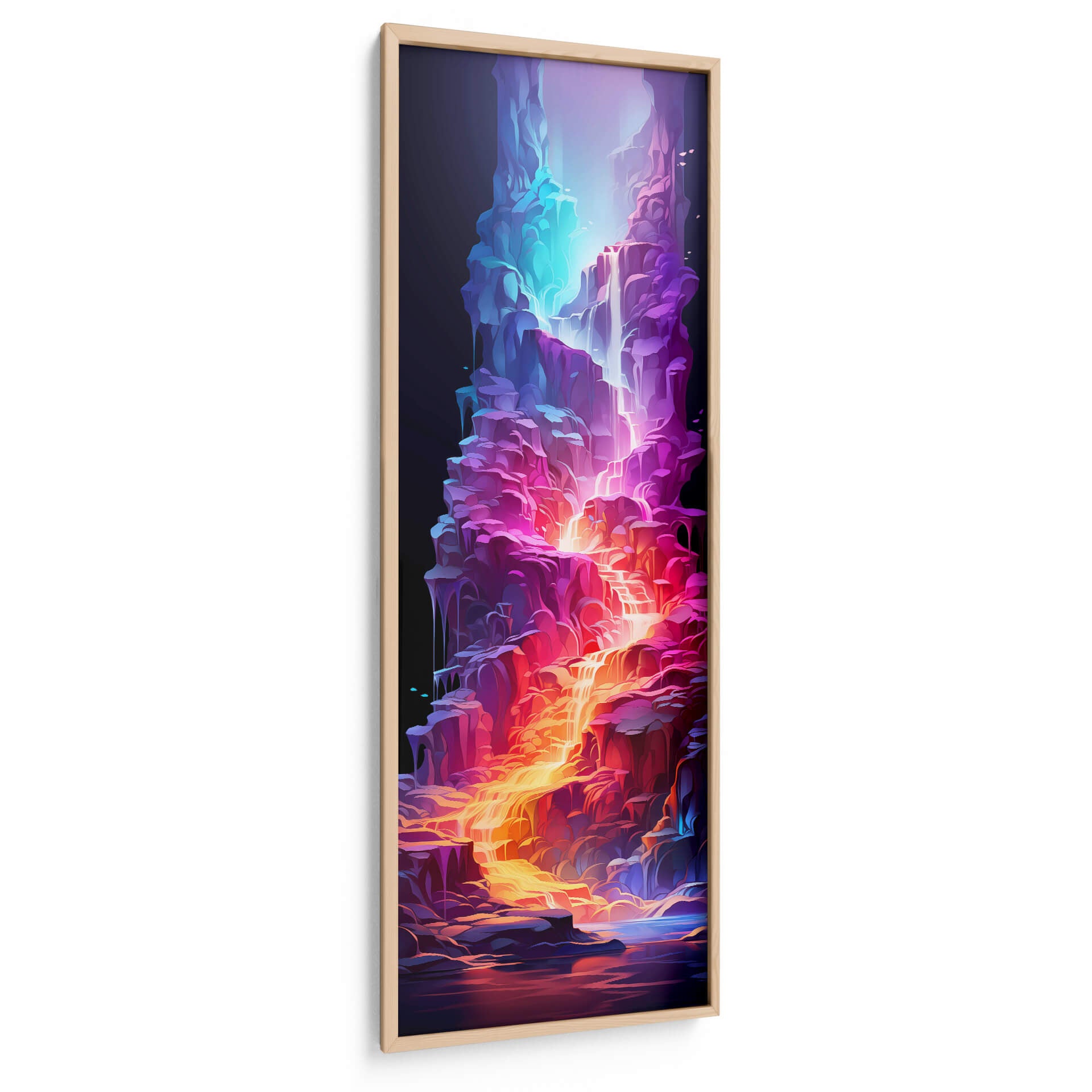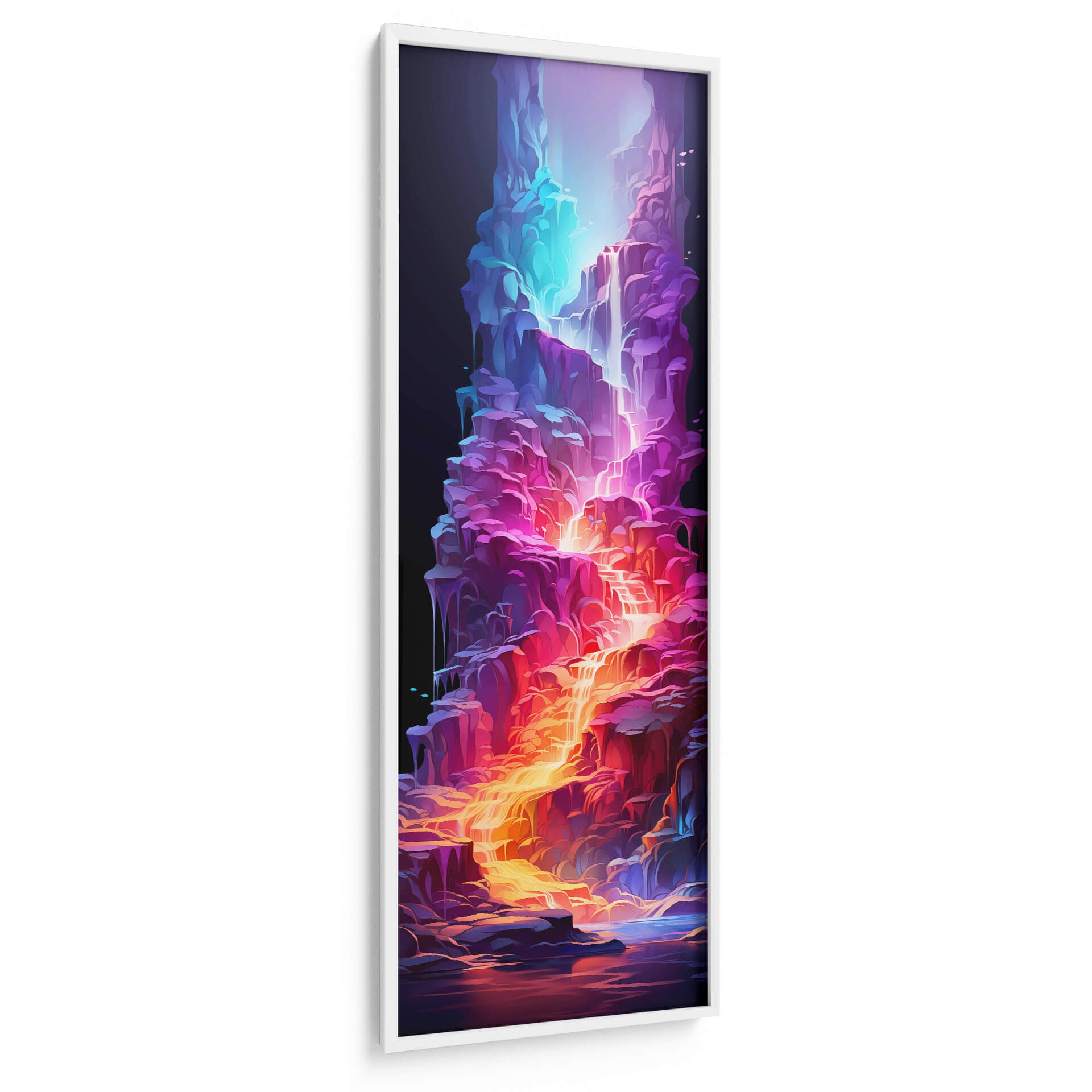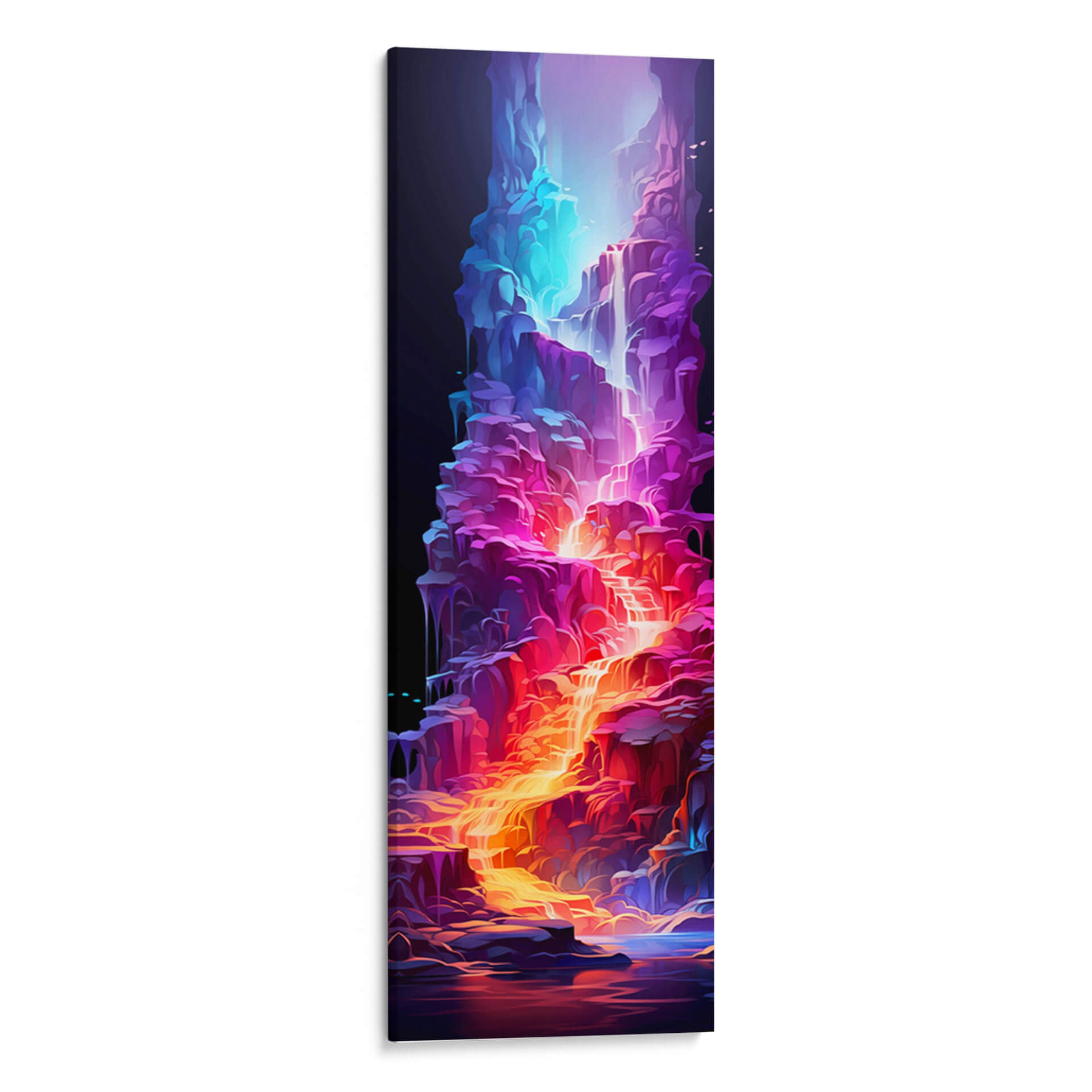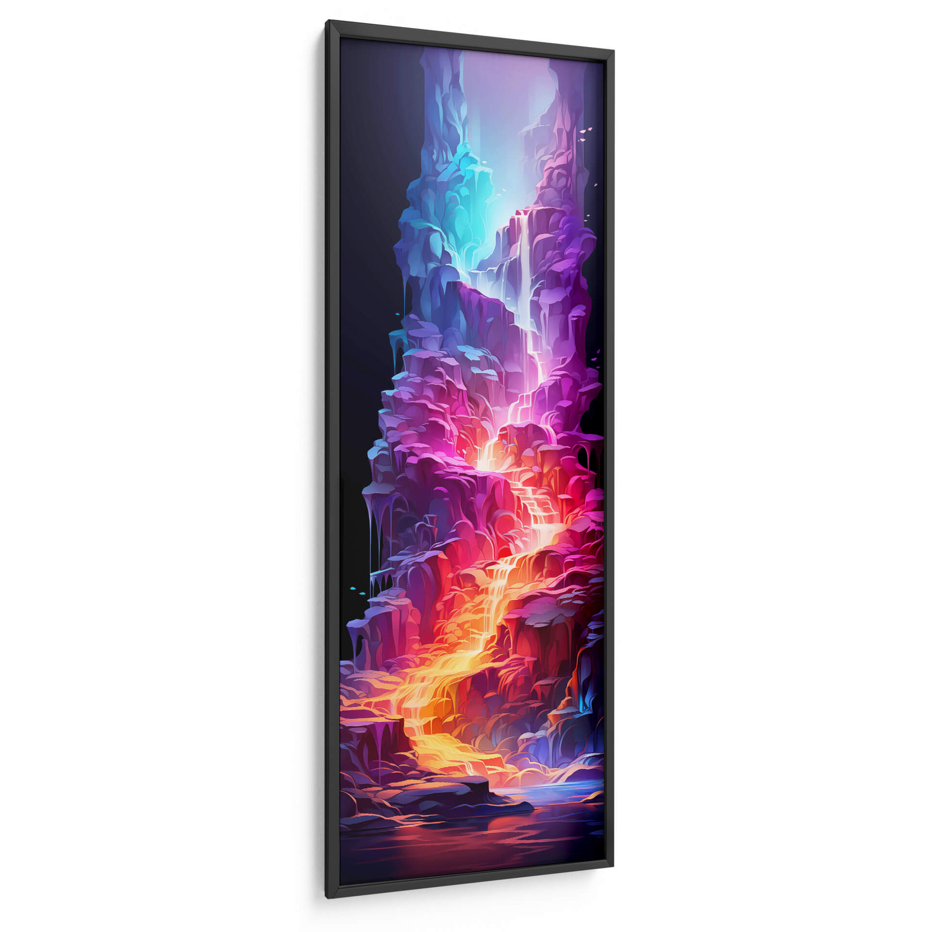 Sumérgete en la vibrante 'Cascada de la Vida - 17', una obra de arte digital que cautiva con su energía y color. Esta pieza vertical presenta una cascada etérea que fluye a través de formaciones rocosas estilizadas, bañadas en una paleta de colores eléctricos que va desde profundos azules y púrpuras hasta ardientes naranjas y dorados. La composición dinámica y las formas fluidas evocan una sensación de movimiento y vitalidad, creando un punto focal impresionante para cualquier espacio. El contraste entre la oscuridad del fondo y la luminosidad de la cascada añade profundidad y misterio a la obra. Ideal para quienes buscan añadir un toque de fantasía y modernidad a su hogar u oficina, este cuadro decorativo abstracto es perfecto para salas de estar, dormitorios o espacios de trabajo que requieran un impulso de creatividad y color. Su estilo único la convierte en una pieza de conversación que transformará tu decoración.