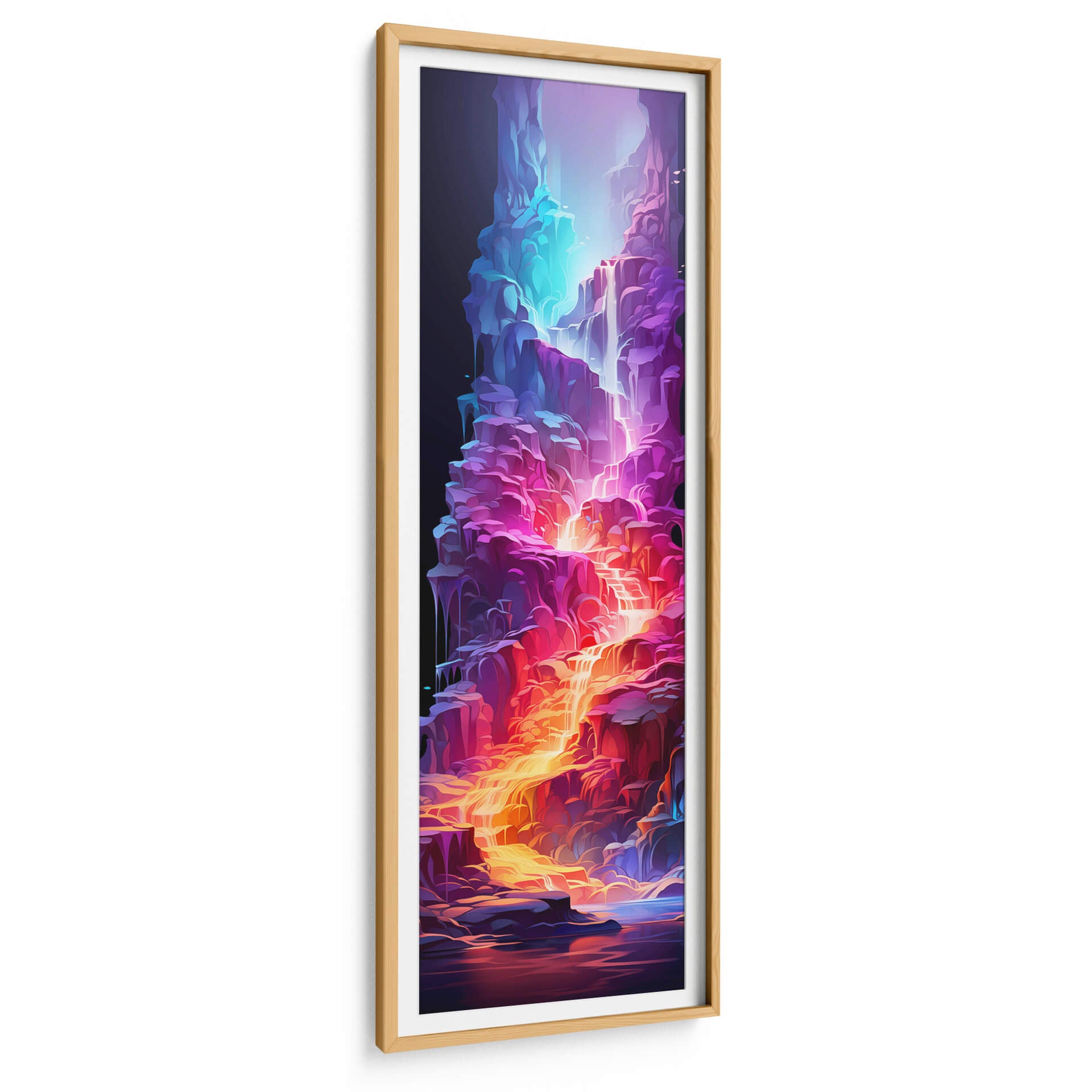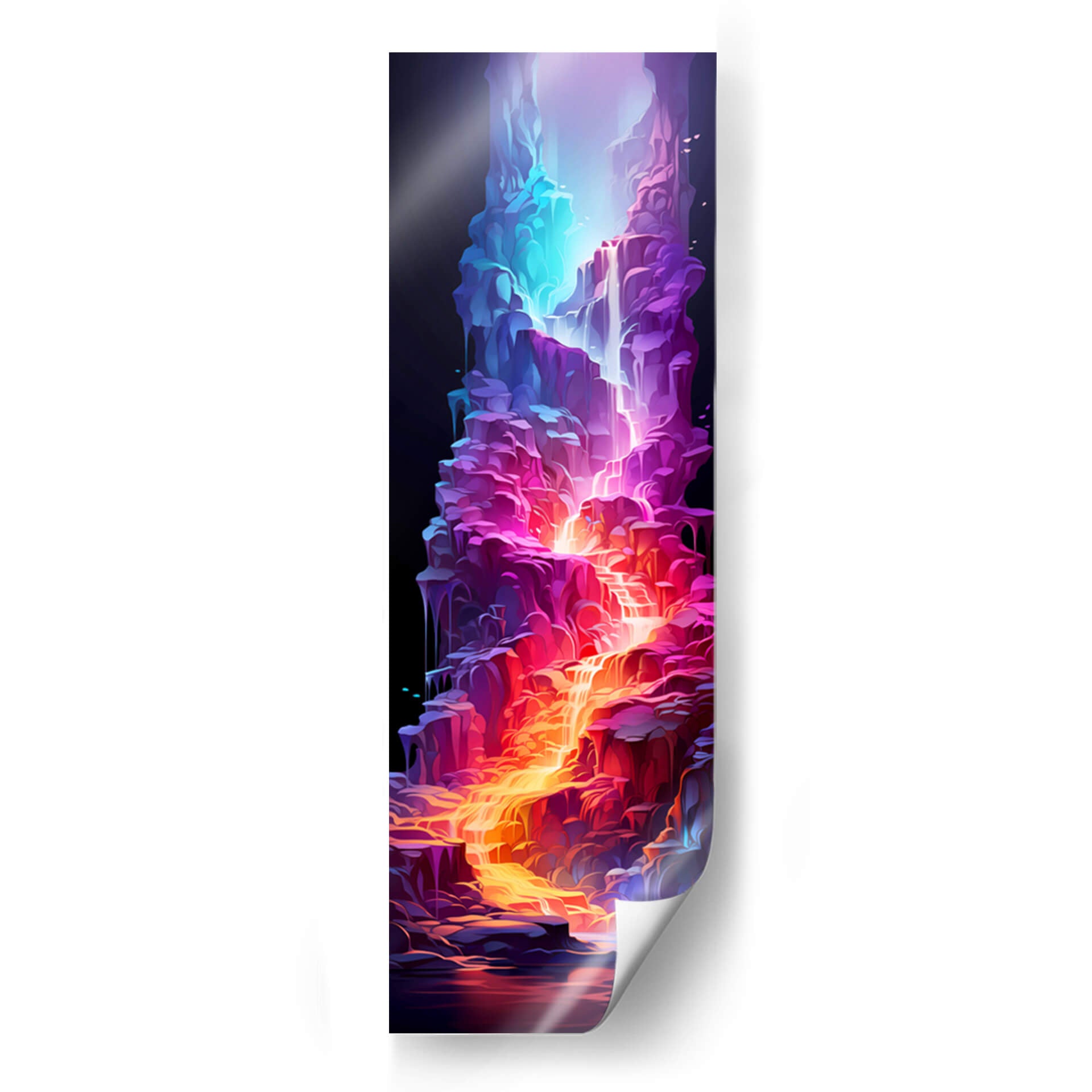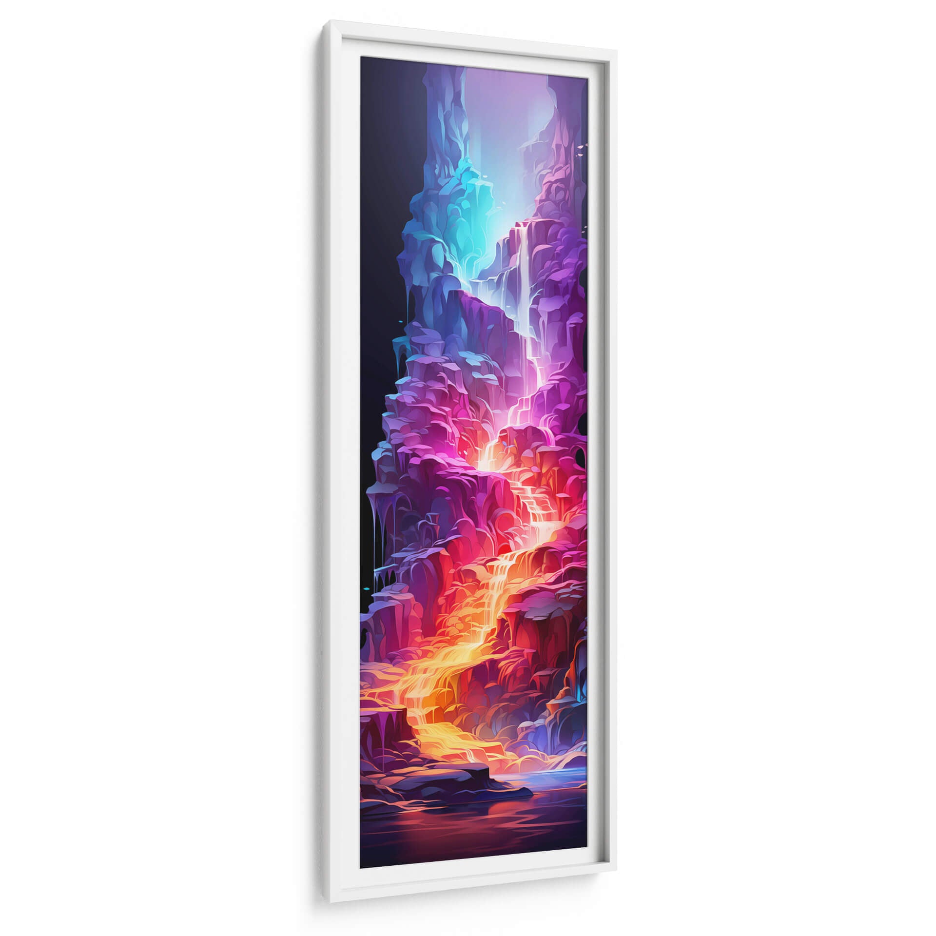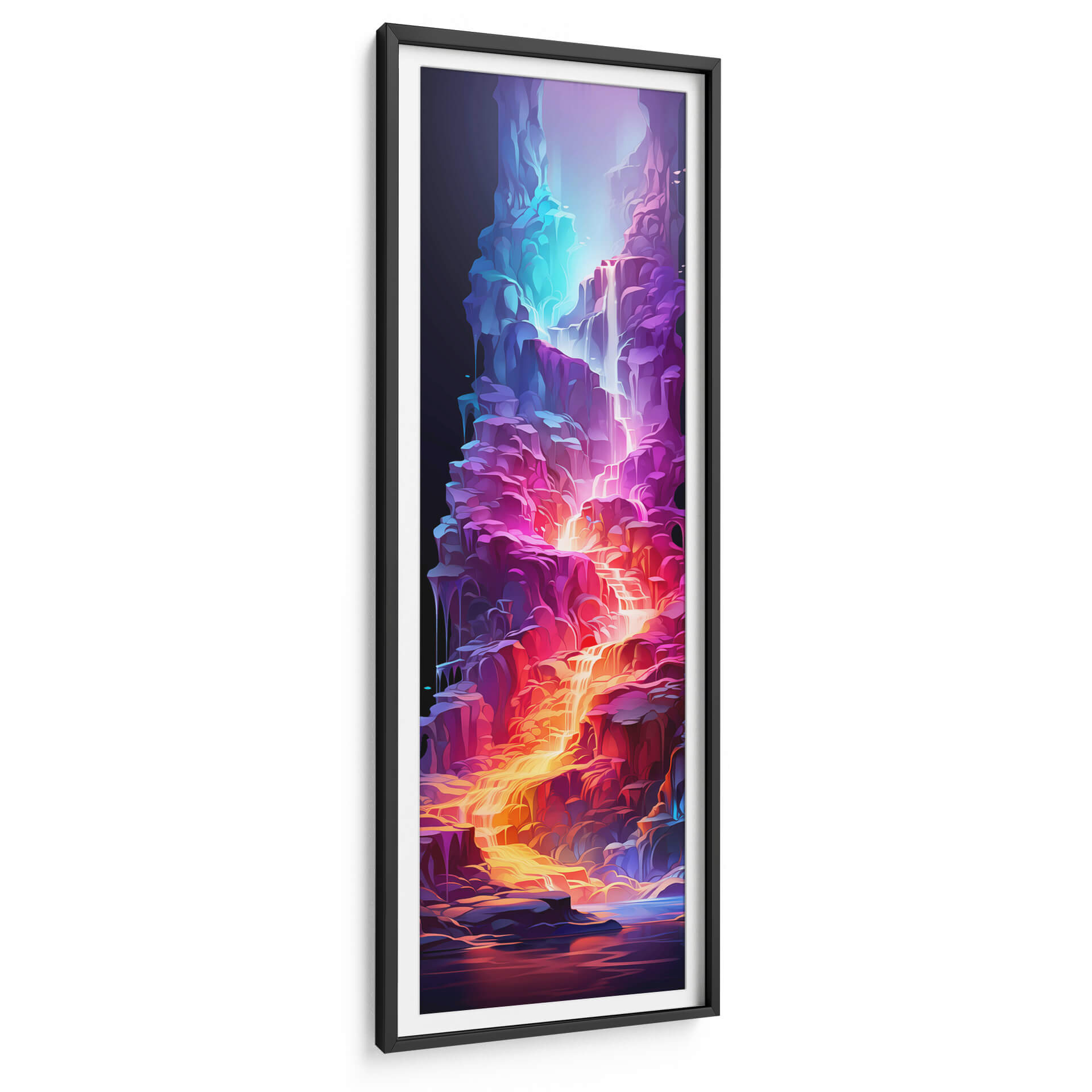 Sumérgete en la vibrante 'Cascada de la Vida - 17', una obra de arte digital que cautiva con su energía y color. Esta pieza vertical presenta una cascada etérea que fluye a través de formaciones rocosas estilizadas, bañadas en una paleta de colores eléctricos que va desde profundos azules y púrpuras hasta ardientes naranjas y dorados. La composición dinámica y las formas fluidas evocan una sensación de movimiento y vitalidad, creando un punto focal impresionante para cualquier espacio. El contraste entre la oscuridad del fondo y la luminosidad de la cascada añade profundidad y misterio a la obra. Ideal para quienes buscan añadir un toque de fantasía y modernidad a su hogar u oficina, este cuadro decorativo abstracto es perfecto para salas de estar, dormitorios o espacios de trabajo que requieran un impulso de creatividad y color. Su estilo único la convierte en una pieza de conversación que transformará tu decoración.