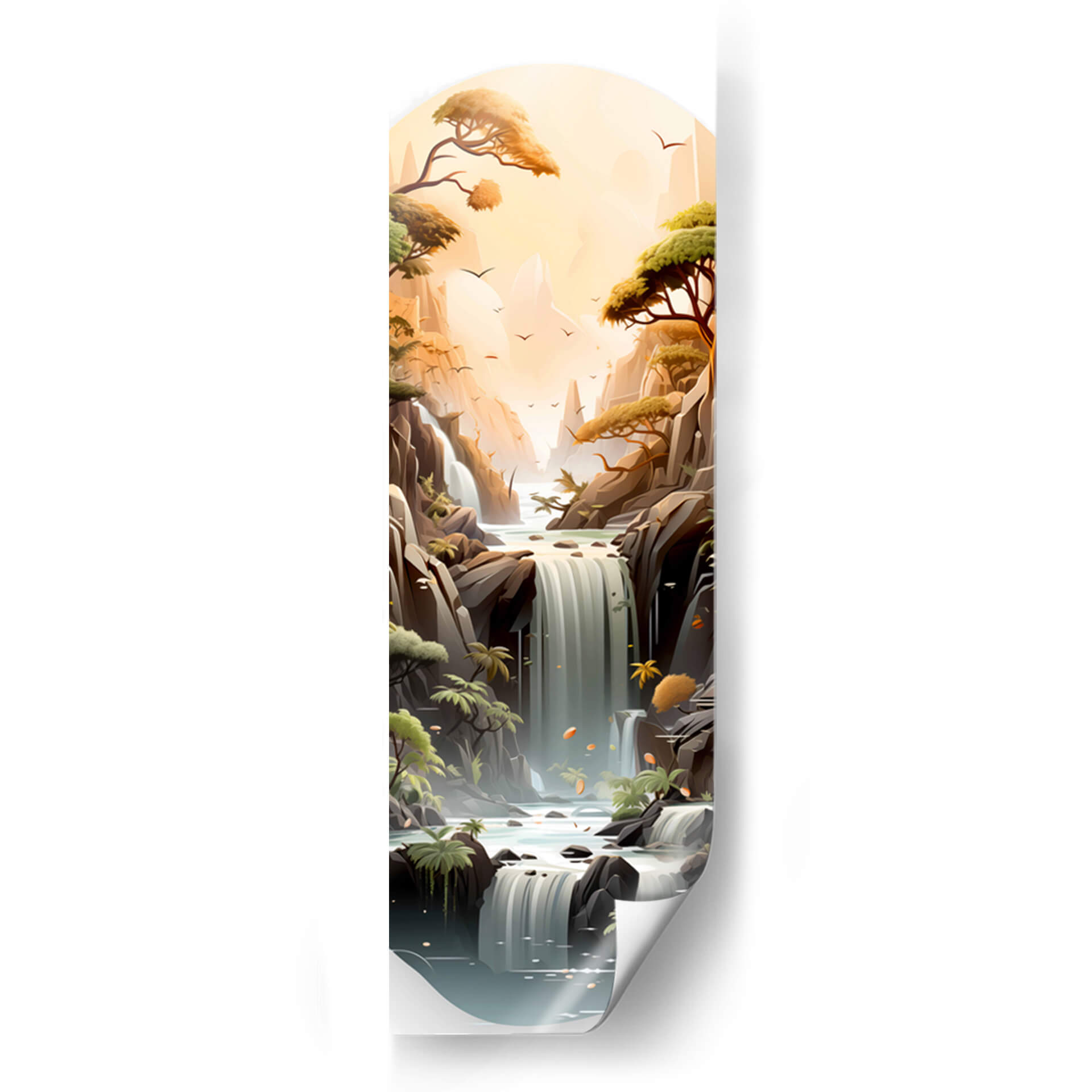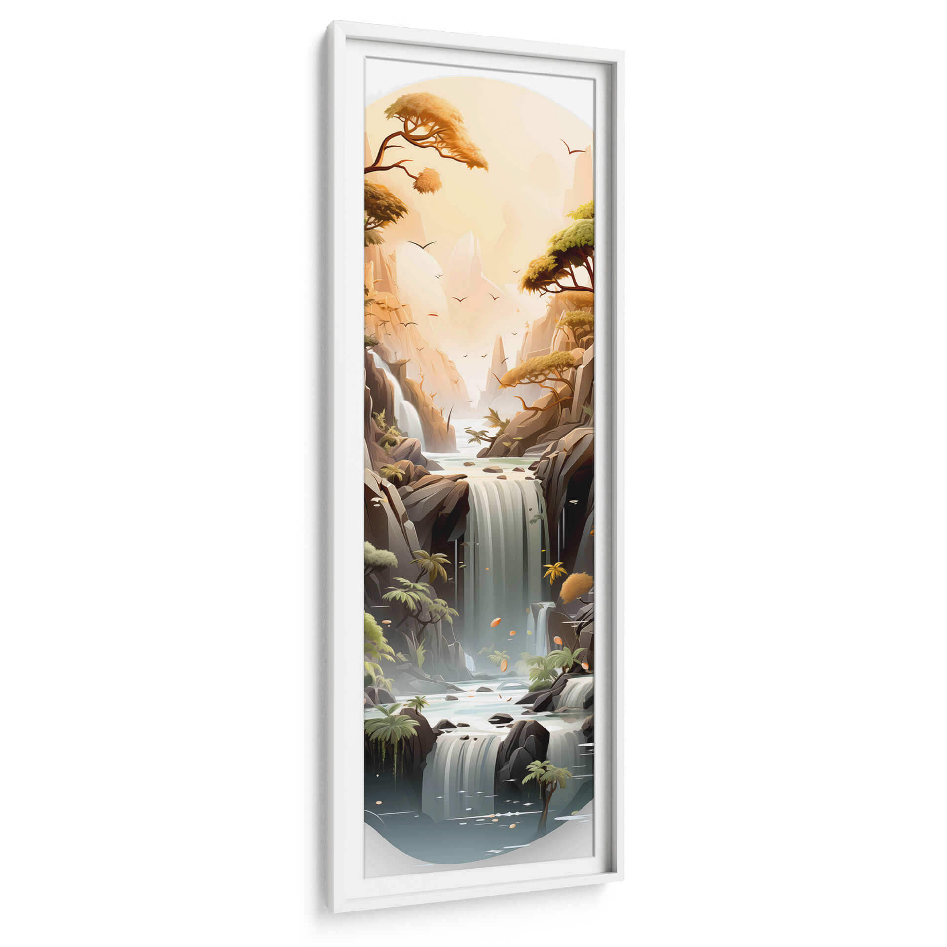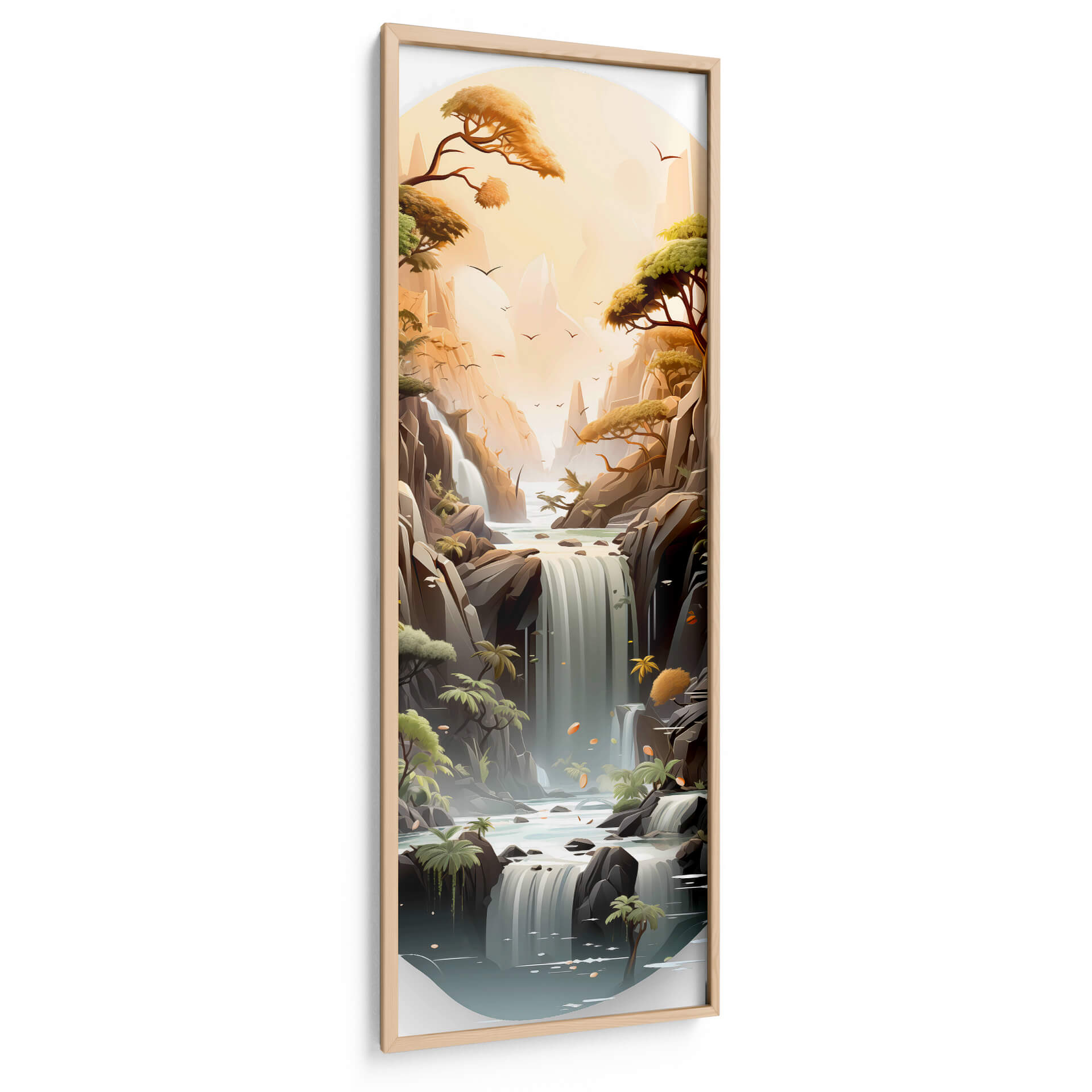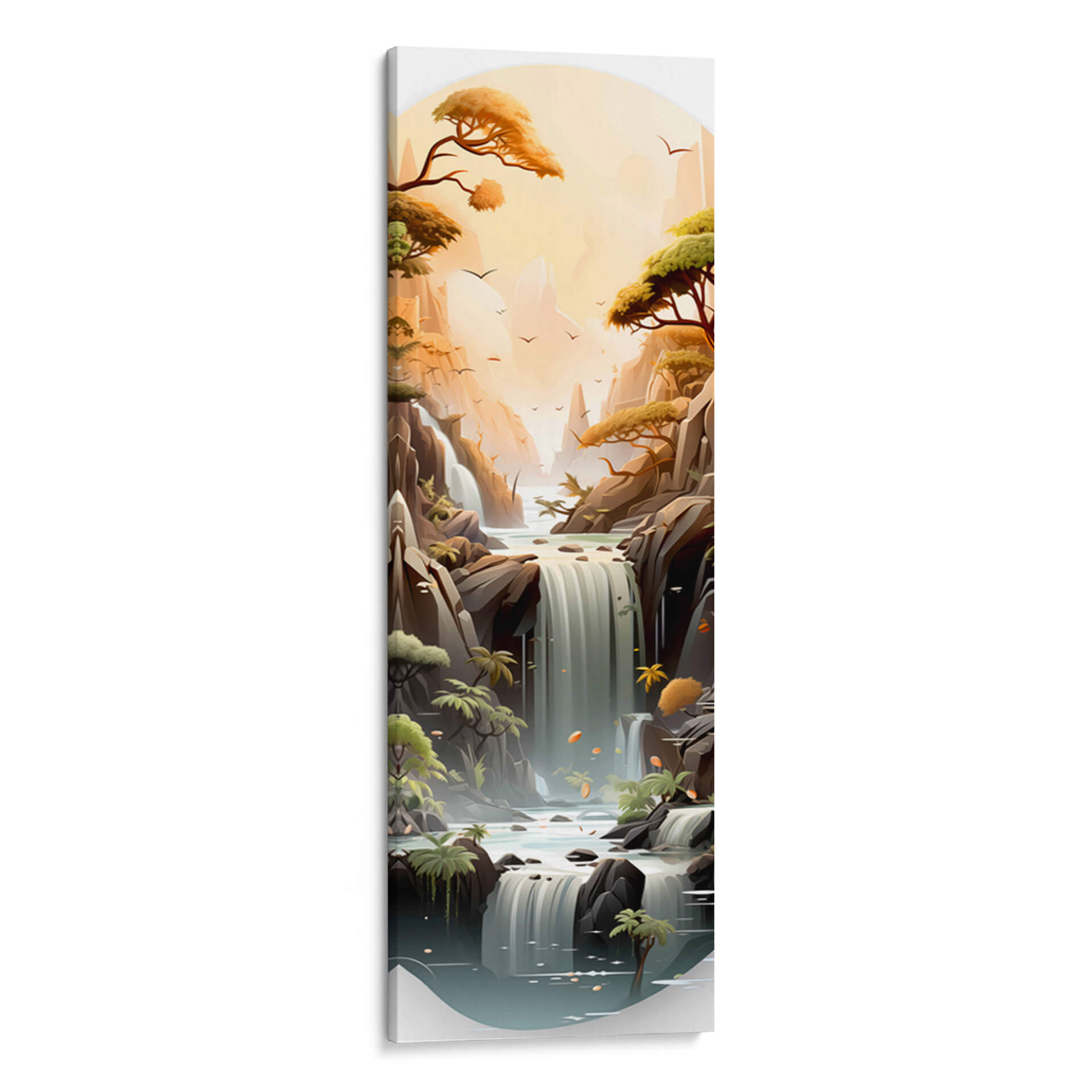 Sumérgete en la serenidad y la majestuosidad de "Cascada de la Vida - 18", una obra de arte digital que captura la esencia de la naturaleza en su máxima expresión. Este cuadro decorativo te transporta a un paisaje idílico donde cascadas de agua cristalina descienden entre imponentes formaciones rocosas, bañadas por la cálida luz de un atardecer etéreo. Los árboles frondosos, con sus ramas extendiéndose hacia el cielo, añaden un toque de vida y vitalidad a la escena, mientras que las suaves tonalidades ocres, verdes y azules crean una atmósfera de paz y contemplación. La composición vertical, con un enfoque en la profundidad y la perspectiva, invita a perderse en sus detalles, desde las aves que surcan el cielo hasta las sutiles texturas de las rocas y el agua. "Cascada de la Vida - 18" es más que una simple decoración; es una ventana a un mundo de tranquilidad y belleza natural, ideal para infundir calma y sofisticación en tu hogar u oficina. Este cuadro decorativo contemporáneo es perfecto para quienes buscan un punto focal que combine la serenidad del paisaje con un toque artístico moderno, transformando cualquier espacio en un oasis de paz y inspiración.