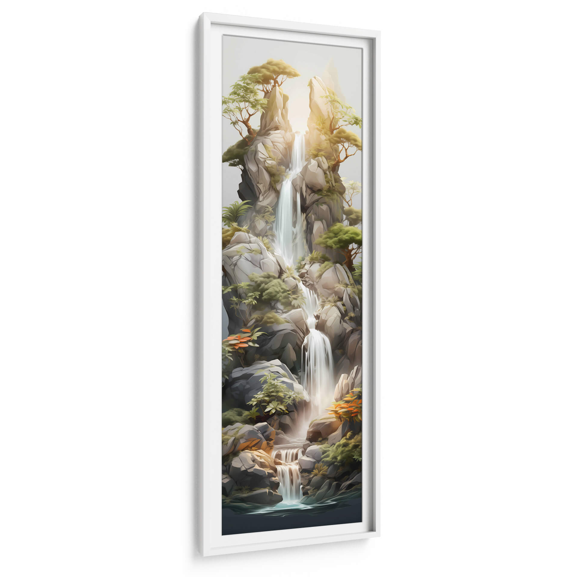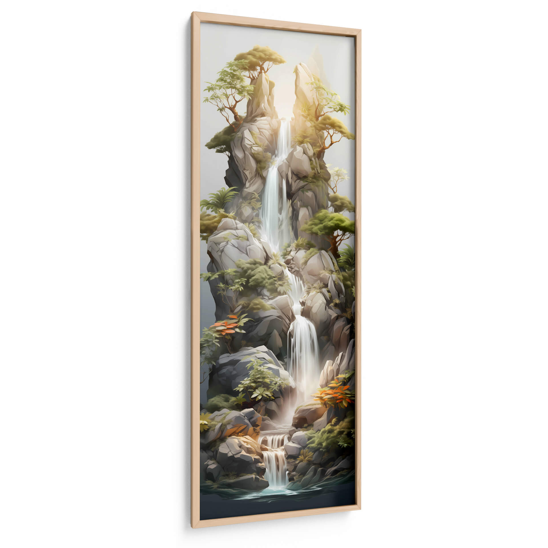 Sumérgete en la serenidad de 'Cascada de la Vida - 19', una obra de arte digital que captura la majestuosidad de la naturaleza en su máxima expresión. Esta pieza vertical presenta una cascada serena descendiendo entre imponentes rocas, rodeada de exuberante vegetación y árboles que se aferran a los acantilados. La paleta de colores, dominada por tonos tierra, verdes y acentos anaranjados, crea una atmósfera de paz y armonía, mientras que la luz dorada que se filtra entre las rocas añade un toque de calidez y esperanza. El estilo semi-realista, con pinceladas digitales que evocan la textura de la roca y la fluidez del agua, invita a la contemplación. Ideal para espacios que buscan un oasis de tranquilidad, como dormitorios, salas de estar o estudios, este cuadro decorativo es una ventana a un paraíso natural, un recordatorio constante de la belleza y la fuerza vital que nos rodea. Añade un toque de naturaleza y calma a tu hogar con esta impresionante representación de la vida fluyendo. Es el regalo perfecto para amantes de la naturaleza y el arte contemplativo.
