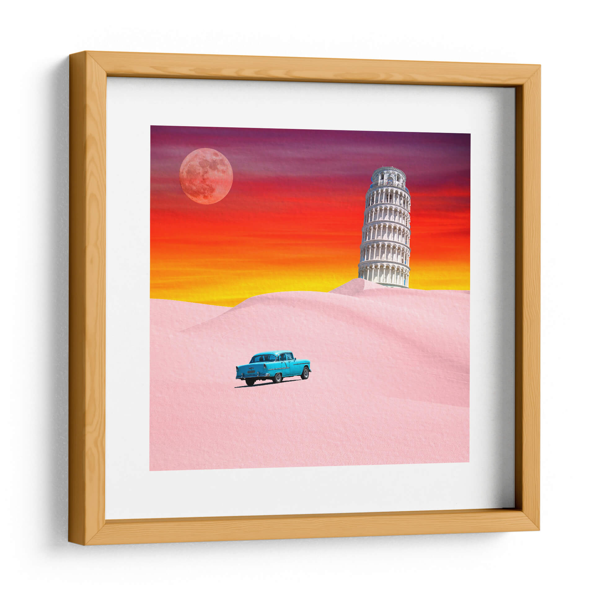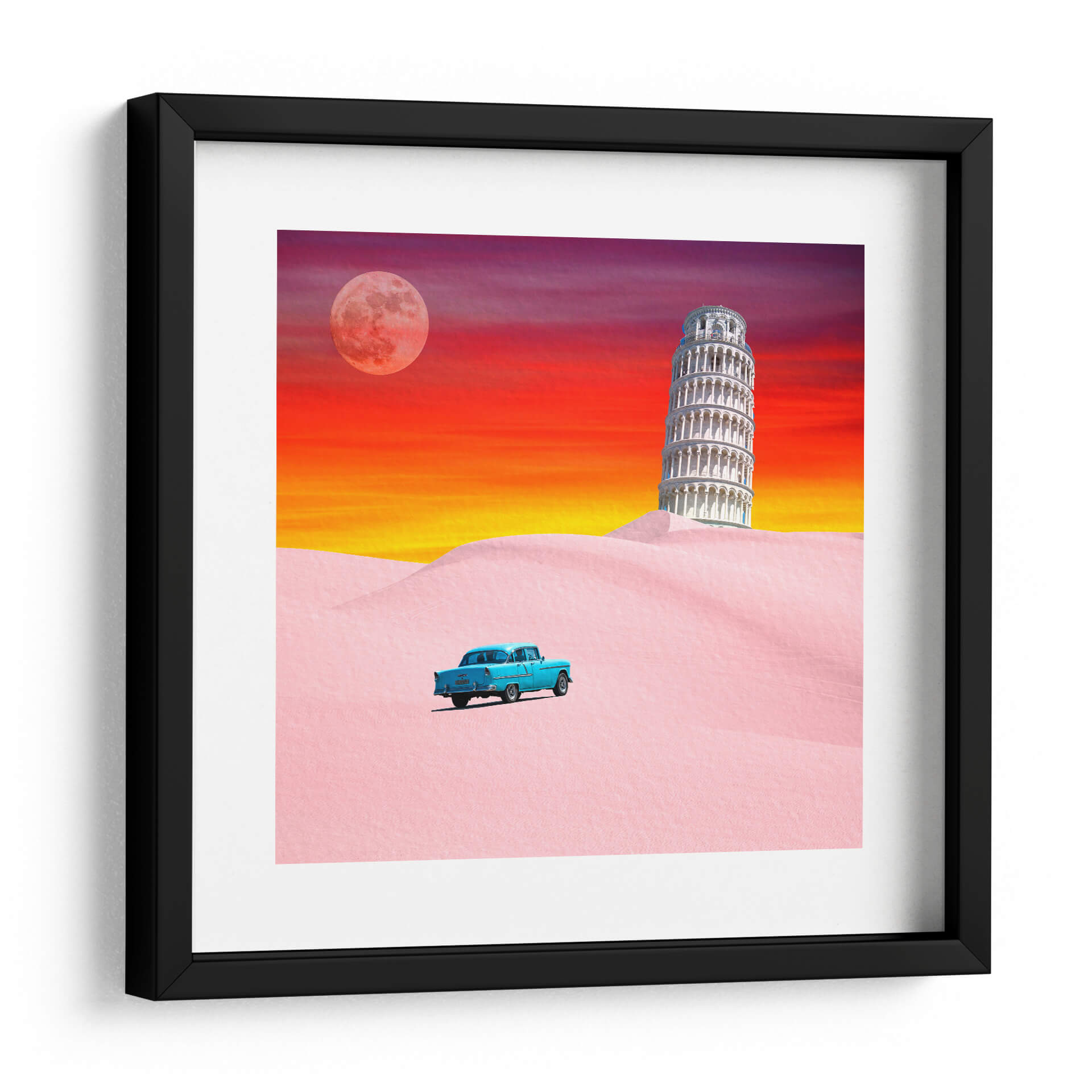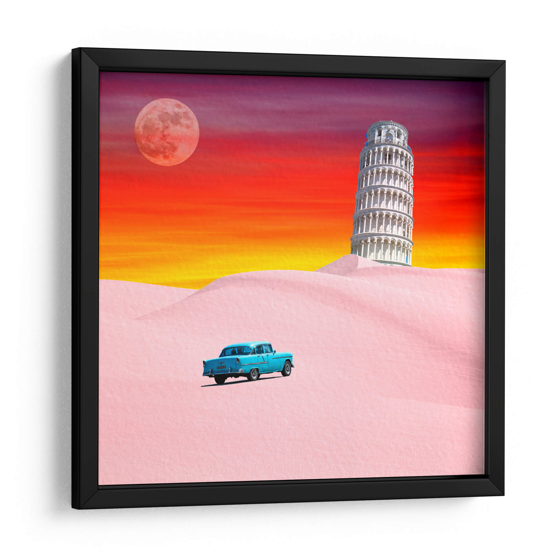 Sumérgete en un viaje onírico con 'Después del tiempo', una obra de arte digital que desafía las convenciones. Esta pieza evoca una sensación de ensueño surrealista, transportándote a un paisaje desértico teñido de rosas pálidos bajo un cielo ardiente de naranjas y púrpuras intensos. Una imponente luna roja flota en el horizonte, añadiendo un toque de misterio cósmico, mientras que la icónica Torre de Pisa se alza inesperadamente entre las dunas, creando una yuxtaposición fascinante. Un clásico coche azul recorre el terreno, sugiriendo una aventura atemporal o una reflexión sobre el paso del tiempo y la memoria. El estilo visual, con sus colores vibrantes y elementos inesperados, lo convierte en un cuadro decorativo ideal para espacios que buscan un toque de originalidad y conversación. Perfecta para salones modernos, oficinas creativas o cualquier lugar donde se desee infundir imaginación y un toque de lo inesperado. Añade un aire de fantasía y escape a tu decoración con este lienzo único que invita a la contemplación y la intriga.
