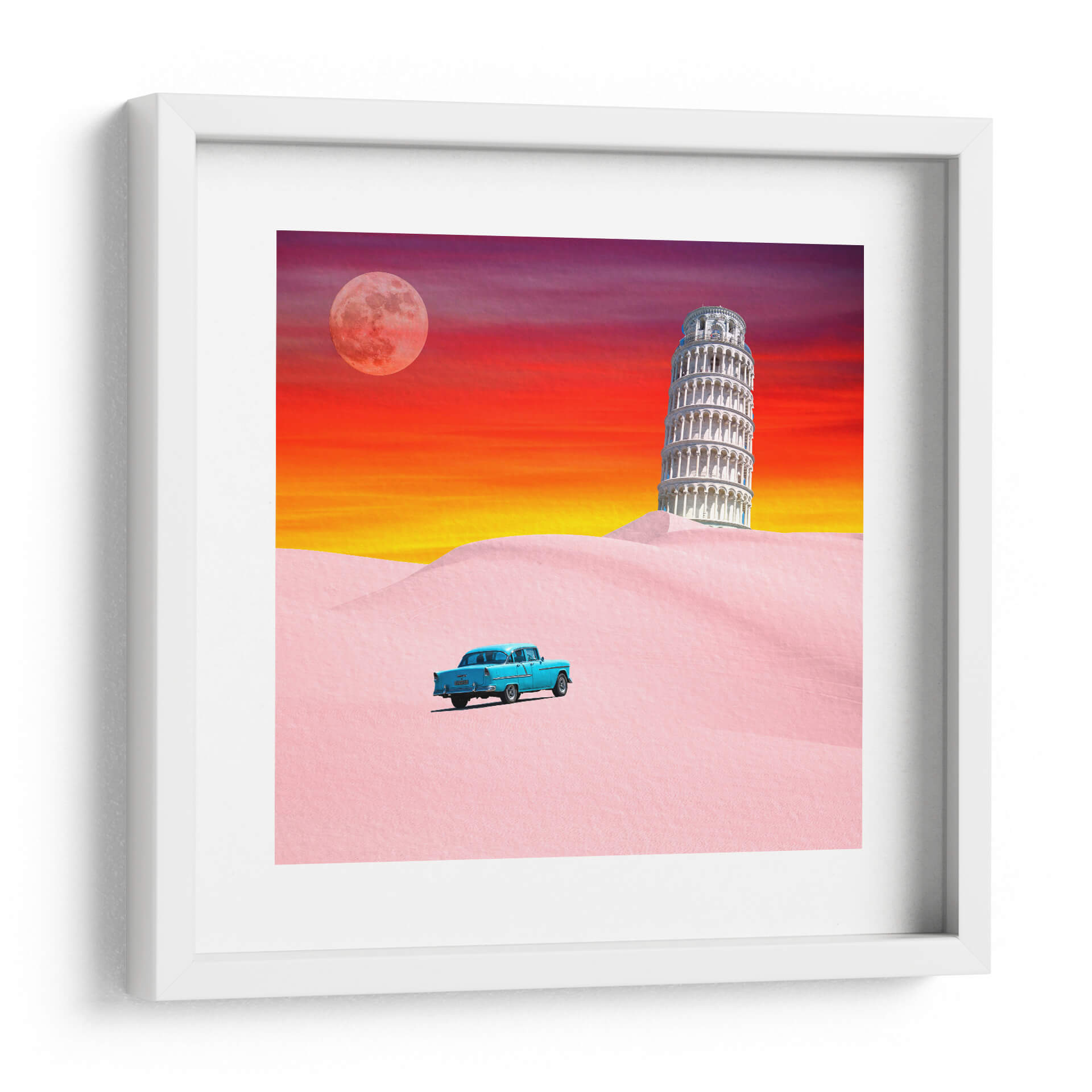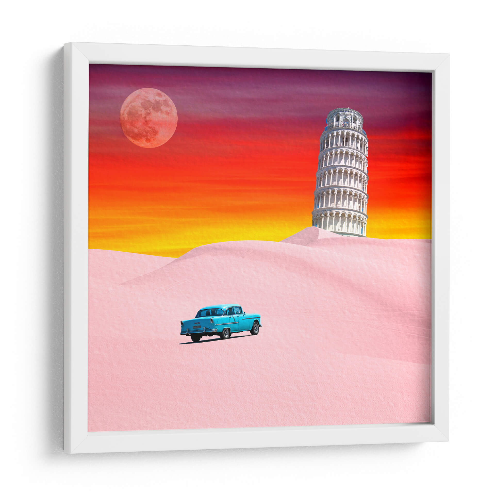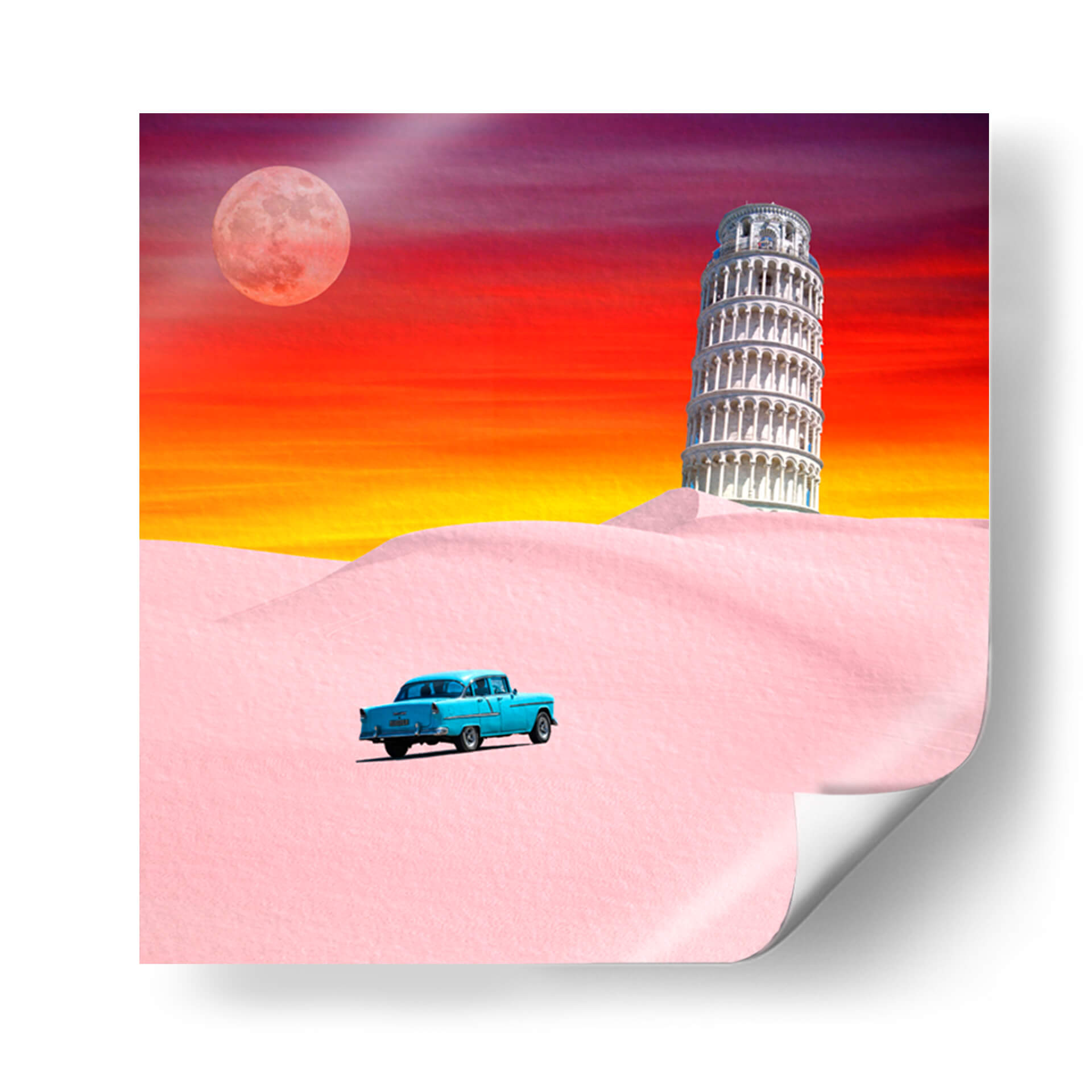Sumérgete en un viaje onírico con 'Después del tiempo', una obra de arte digital que desafía las convenciones. Esta pieza evoca una sensación de ensueño surrealista, transportándote a un paisaje desértico teñido de rosas pálidos bajo un cielo ardiente de naranjas y púrpuras intensos. Una imponente luna roja flota en el horizonte, añadiendo un toque de misterio cósmico, mientras que la icónica Torre de Pisa se alza inesperadamente entre las dunas, creando una yuxtaposición fascinante. Un clásico coche azul recorre el terreno, sugiriendo una aventura atemporal o una reflexión sobre el paso del tiempo y la memoria. El estilo visual, con sus colores vibrantes y elementos inesperados, lo convierte en un cuadro decorativo ideal para espacios que buscan un toque de originalidad y conversación. Perfecta para salones modernos, oficinas creativas o cualquier lugar donde se desee infundir imaginación y un toque de lo inesperado. Añade un aire de fantasía y escape a tu decoración con este lienzo único que invita a la contemplación y la intriga.