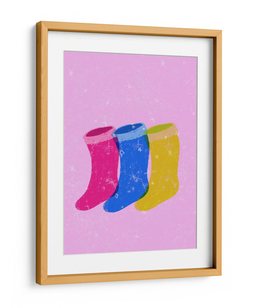 Sumérgete en la alegría festiva y la calidez con el cuadro decorativo 'Felices Fiestas de Invierno' de Aliya Putrus. Esta obra vibrante captura la esencia acogedora de la temporada invernal a través de una paleta de colores audaces y un diseño encantador. Tres pares de medias, cada uno en un tono distinto y alegre (fucsia, azul eléctrico y amarillo sol), se presentan de forma estilizada sobre un fondo rosa pastel salpicado de sutiles destellos que evocan la magia de la nieve o las estrellas. La composición, con un ligero solapamiento entre las medias, añade profundidad y dinamismo a la pieza. El estilo artístico, con texturas sutiles y un acabado que recuerda a la acuarela digital, confiere a la obra un aire moderno y juguetón. 'Felices Fiestas de Invierno' es ideal para añadir un toque de color y optimismo a cualquier espacio, desde una sala de estar moderna hasta una habitación infantil o un rincón acogedor. Transmite una sensación de anticipación, celebración y confort, perfecta para infundir espíritu festivo en tu hogar u oficina durante los meses más fríos. Este cuadro decorativo es una invitación a la diversión y al confort invernal.
