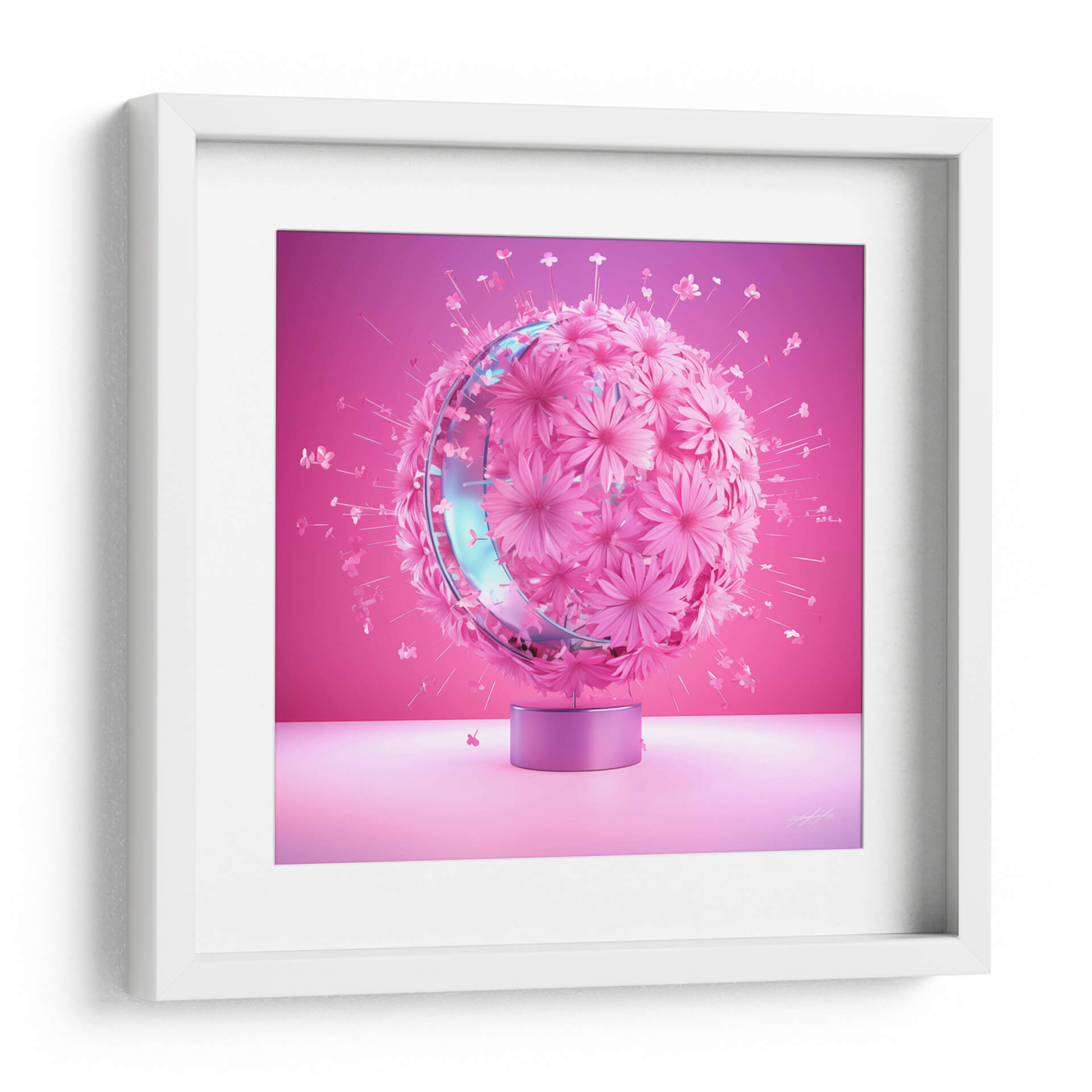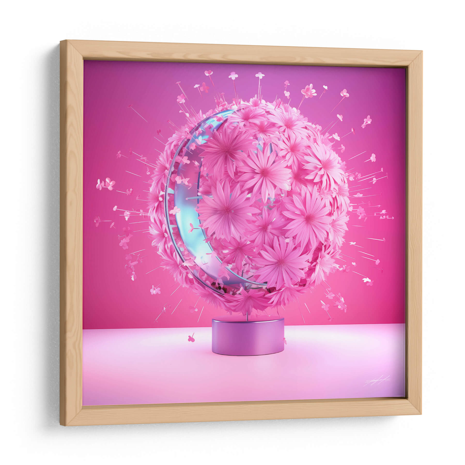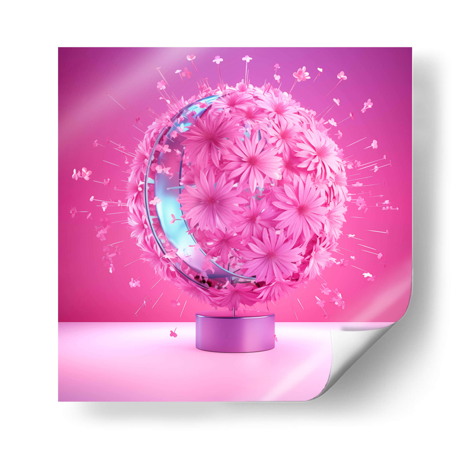 Sumérgete en la delicadeza y el vibrante encanto de "Florece - 10", una obra de arte digital que captura la esencia de la primavera y la renovación. Esta pieza presenta una esfera exuberante, cubierta por una multitud de flores en tonos rosados y fucsias, que parece emanar una energía vital y alegre. Un anillo translúcido y brillante, con reflejos azulados, envuelve el centro de la esfera, añadiendo un toque de modernidad y sofisticación a la composición. Pequeñas flores y pétalos revolotean alrededor, creando una sensación de movimiento y ligereza, como si la propia naturaleza estuviera en plena efervescencia. El fondo, un degradado suave de color rosa intenso a un tono más suave, realza la tridimensionalidad y el protagonismo de la esfera floral. "Florece - 10" es ideal para quienes buscan infundir alegría y un toque contemporáneo en sus espacios, ya sea en una sala de estar moderna, un dormitorio acogedor o una oficina creativa. Este cuadro decorativo es una invitación a celebrar la belleza efímera y la explosión de vida, transformando cualquier pared en un jardín de ensueño lleno de color y optimismo. Una pieza que inspira y embellece, perfecta para añadir un acento visual cautivador a tu decoración.