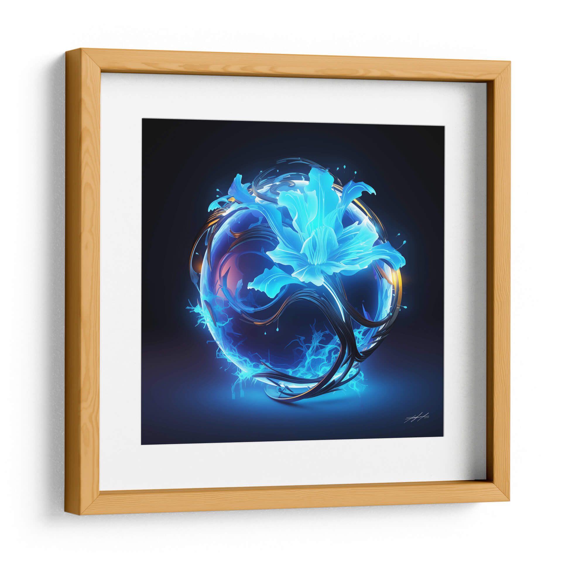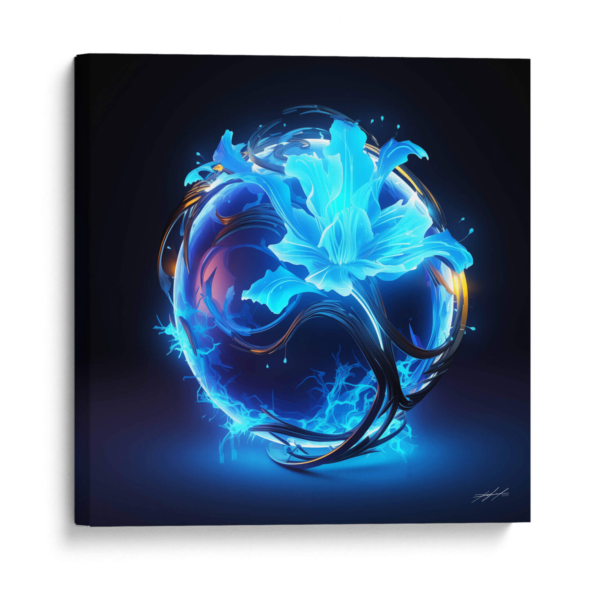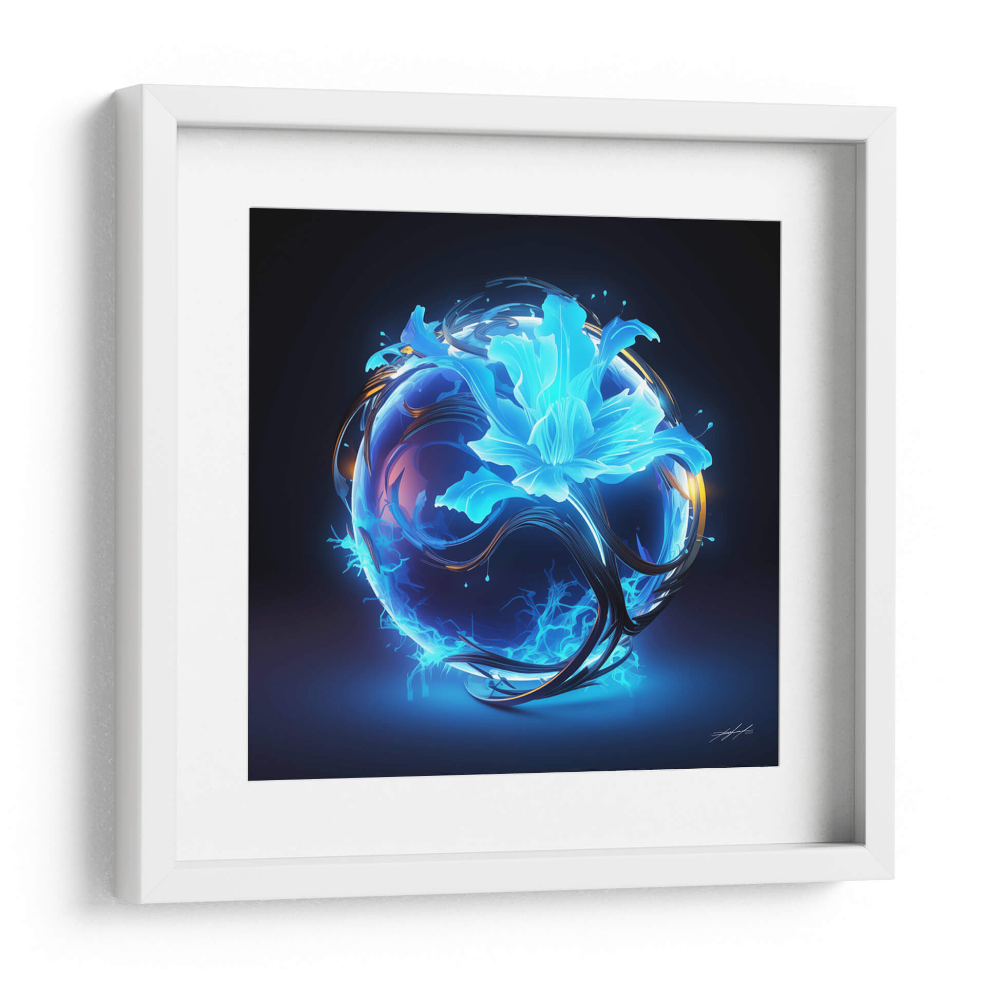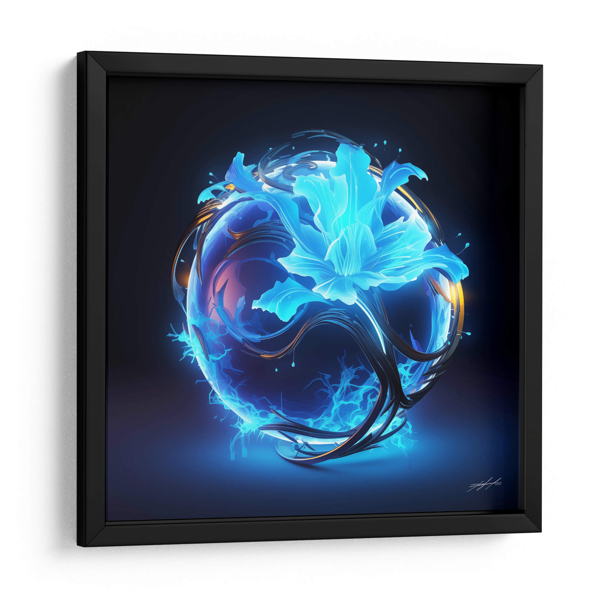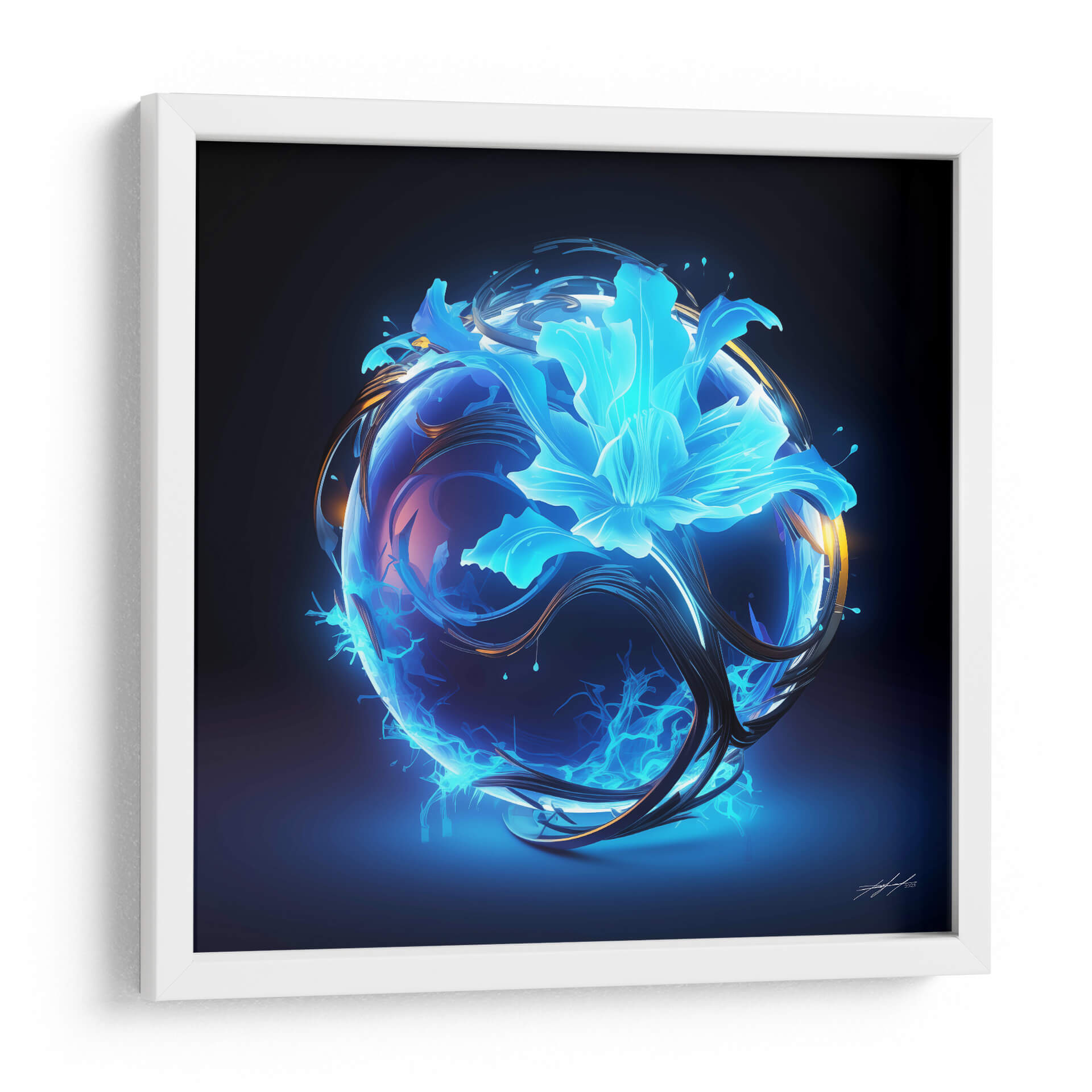 Sumérgete en la enigmática belleza de "Florece - 11", una obra de arte digital que evoca la energía primordial y la delicadeza de la naturaleza renaciendo. Esta cautivadora pieza presenta una esfera translúcida y vibrante, envuelta en remolinos de energía eléctrica azul y filamentos oscuros y orgánicos. En su centro, una flor etérea y luminosa, bañada en tonos cian y turquesa, parece florecer desde el núcleo mismo de la esfera, transmitiendo una sensación de misterio y vitalidad. La paleta de colores, dominada por intensos azules eléctricos y contrastes de dorado y violeta, crea una atmósfera futurista y a la vez orgánica, casi cósmica. "Florece - 11" es más que una simple imagen; es una representación visual de la transformación y el poder latente, ideal para espacios que buscan un toque de vanguardia y misticismo. Este cuadro decorativo de estilo abstracto y surrealista se convertirá en un punto focal fascinante en tu sala de estar moderna, oficina o estudio, inspirando conversaciones y admiración. Transforma tu entorno con esta explosión de luz y forma, una ventana a un universo de energía creativa.