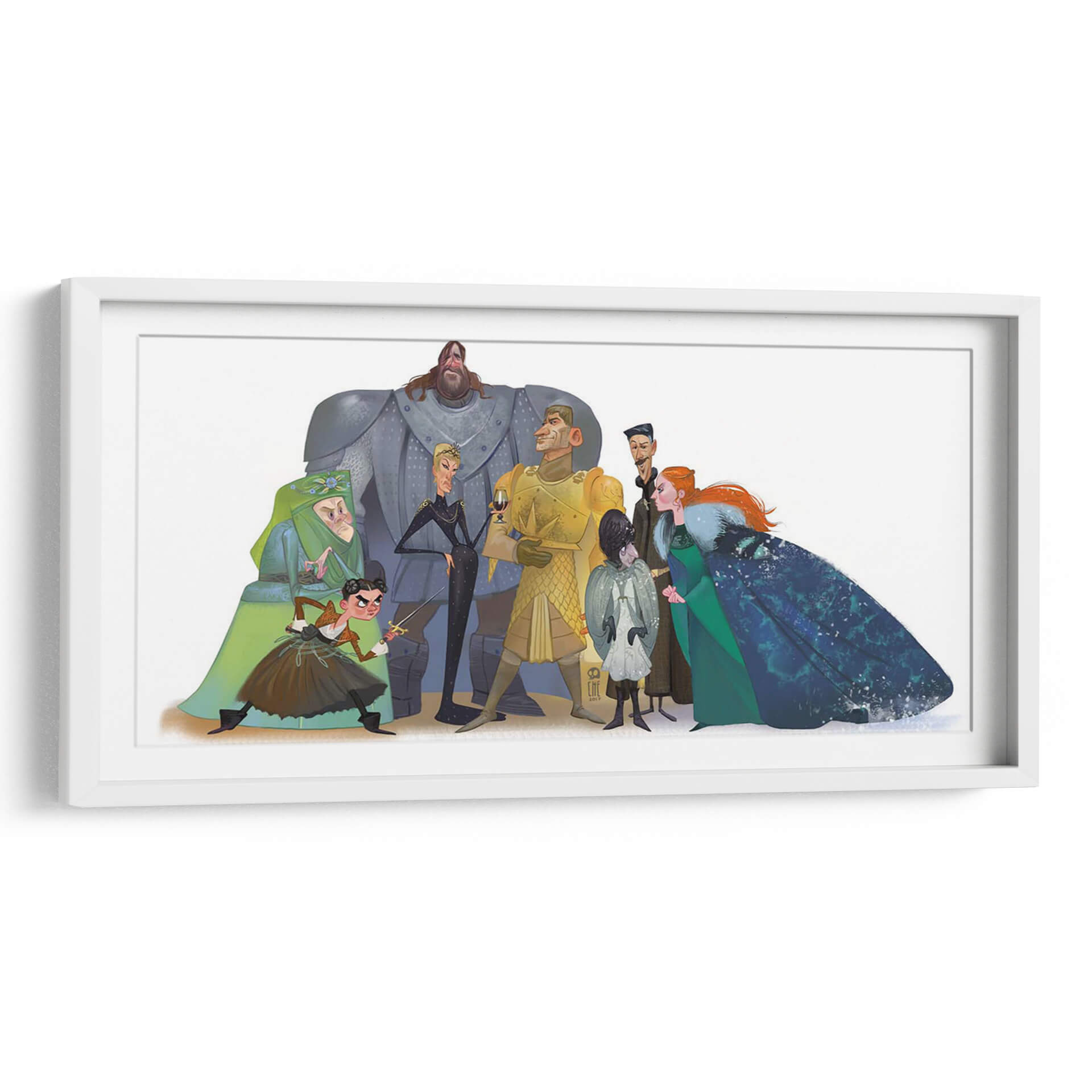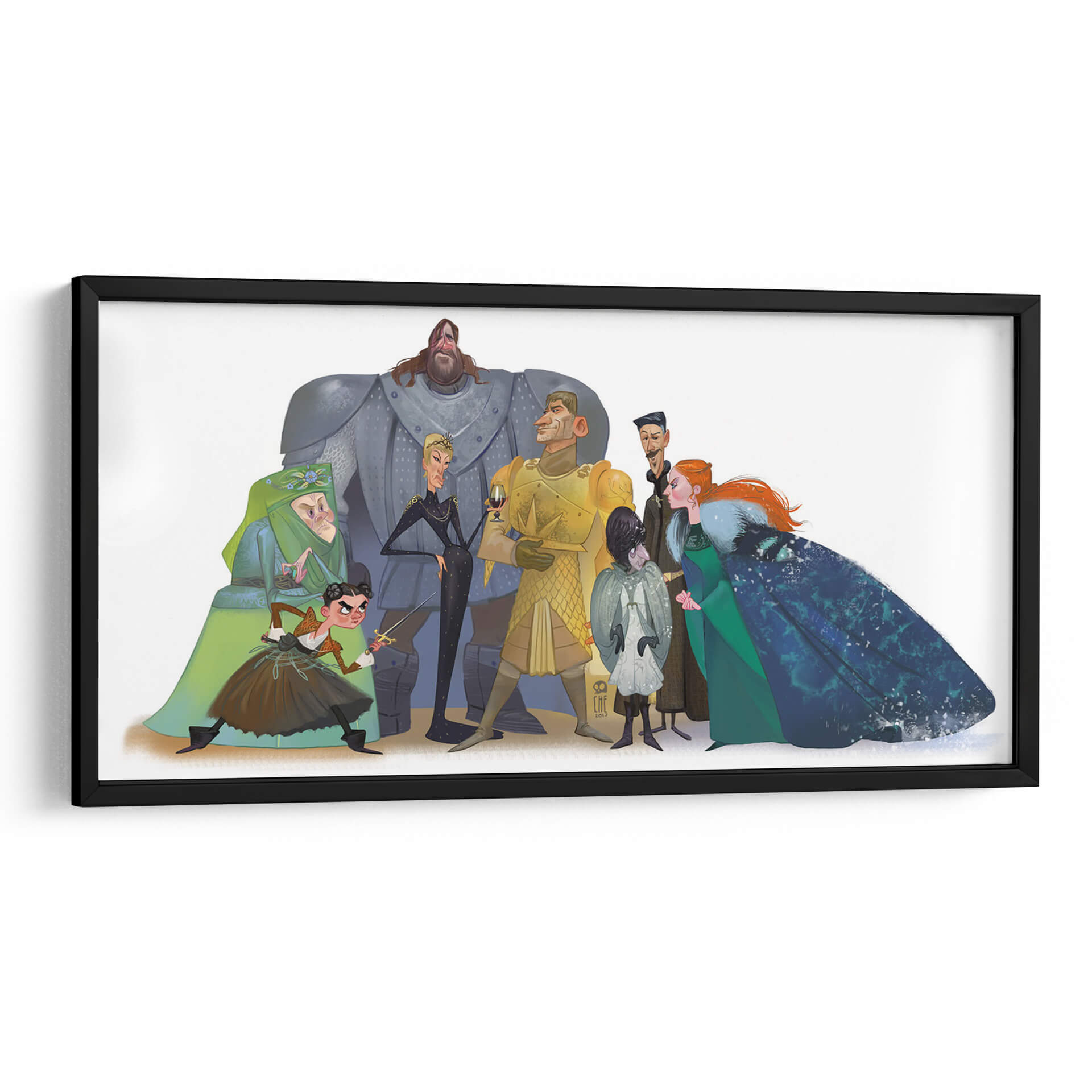 Sumérgete en un mundo de fantasía y poder con este cautivador cuadro decorativo, 'GOT cartoon'. Esta obra de arte digital, con su distintivo estilo de ilustración, reúne a un carismático grupo de personajes que evocan una atmósfera de intriga y drama. La paleta de colores vibrantes, dominada por tonos dorados, verdes intensos y azules profundos, crea un contraste llamativo que capta la atención y añade un toque de realeza a cualquier espacio. La composición, centrada en las expresivas figuras y sus poses dramáticas, invita a la contemplación de sus historias y relaciones. Ideal para salones, estudios o incluso habitaciones temáticas, este cuadro es perfecto para quienes aprecian el arte con narrativa y un toque de humor irreverente. Transforma tu pared en un portal a un universo de historias épicas y personajes memorables, aportando carácter y conversación a tu decoración.