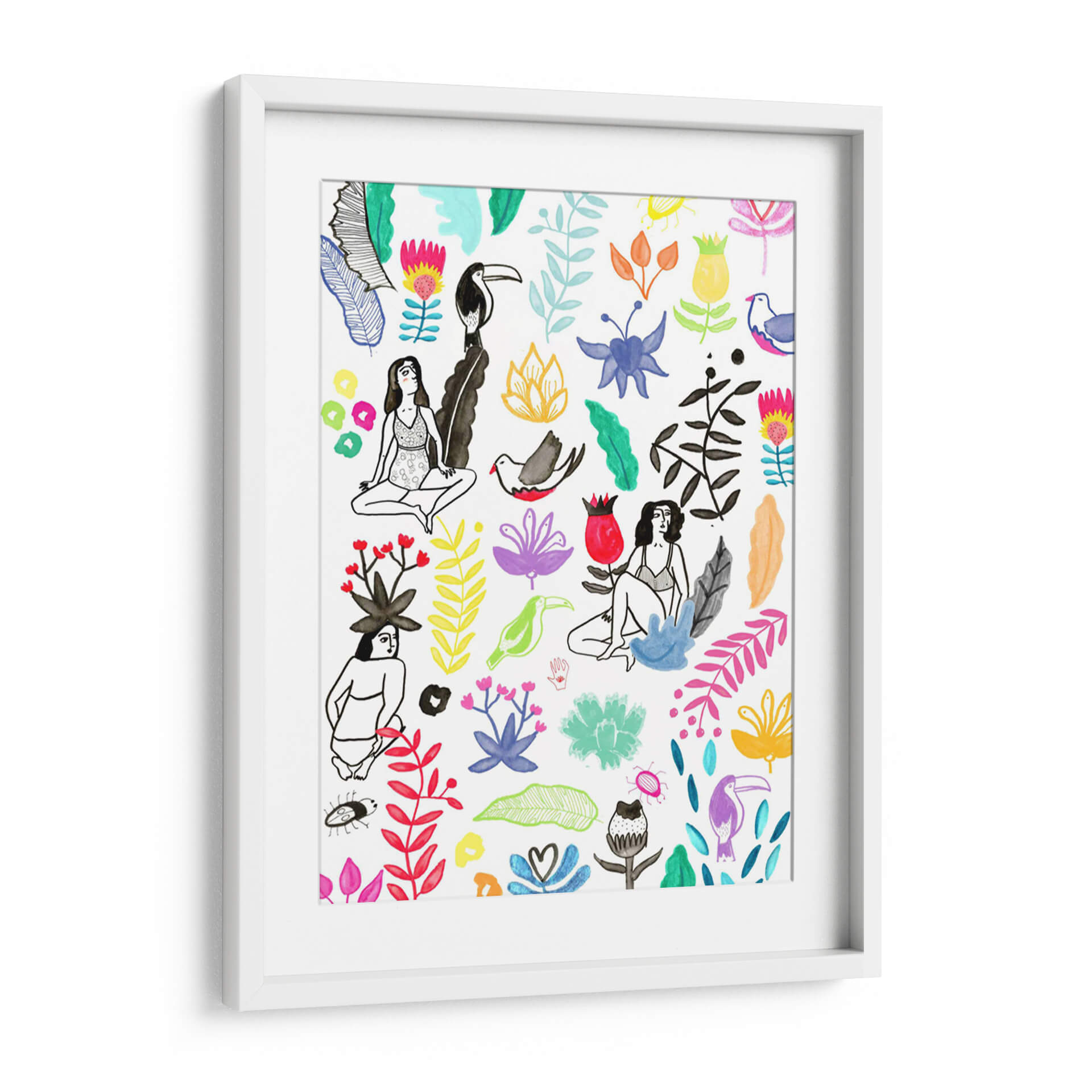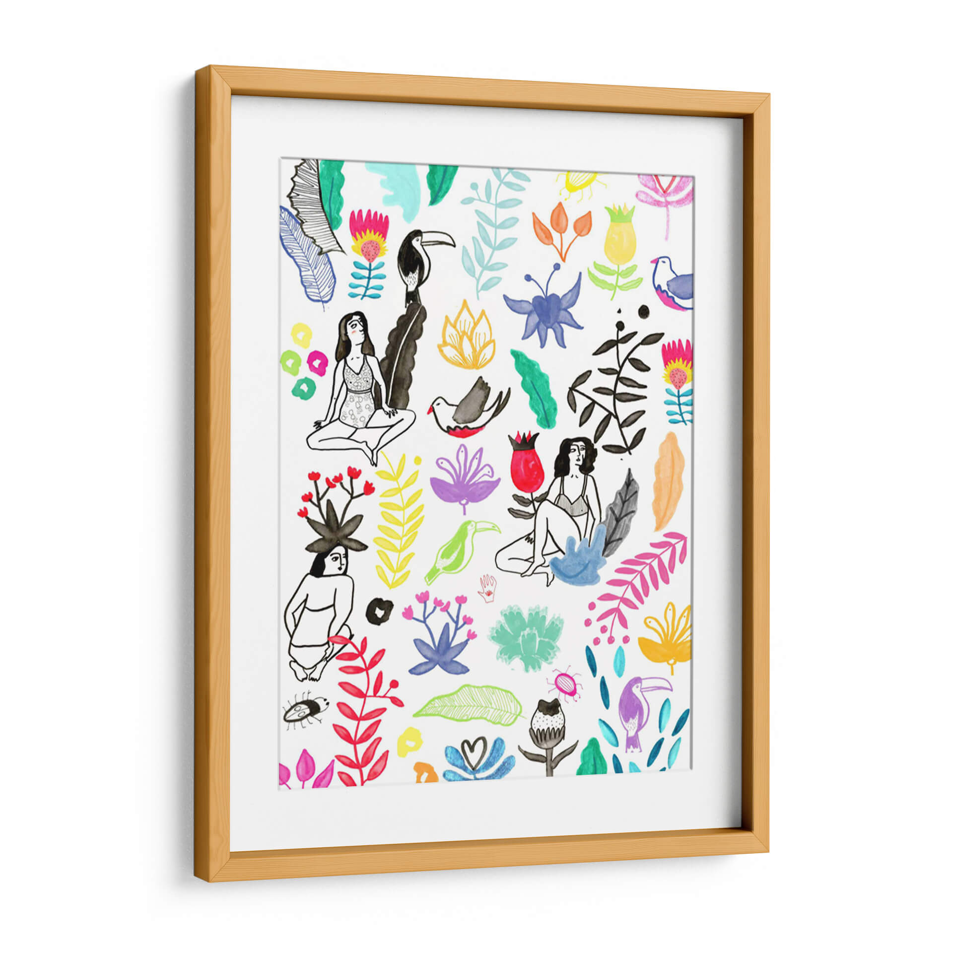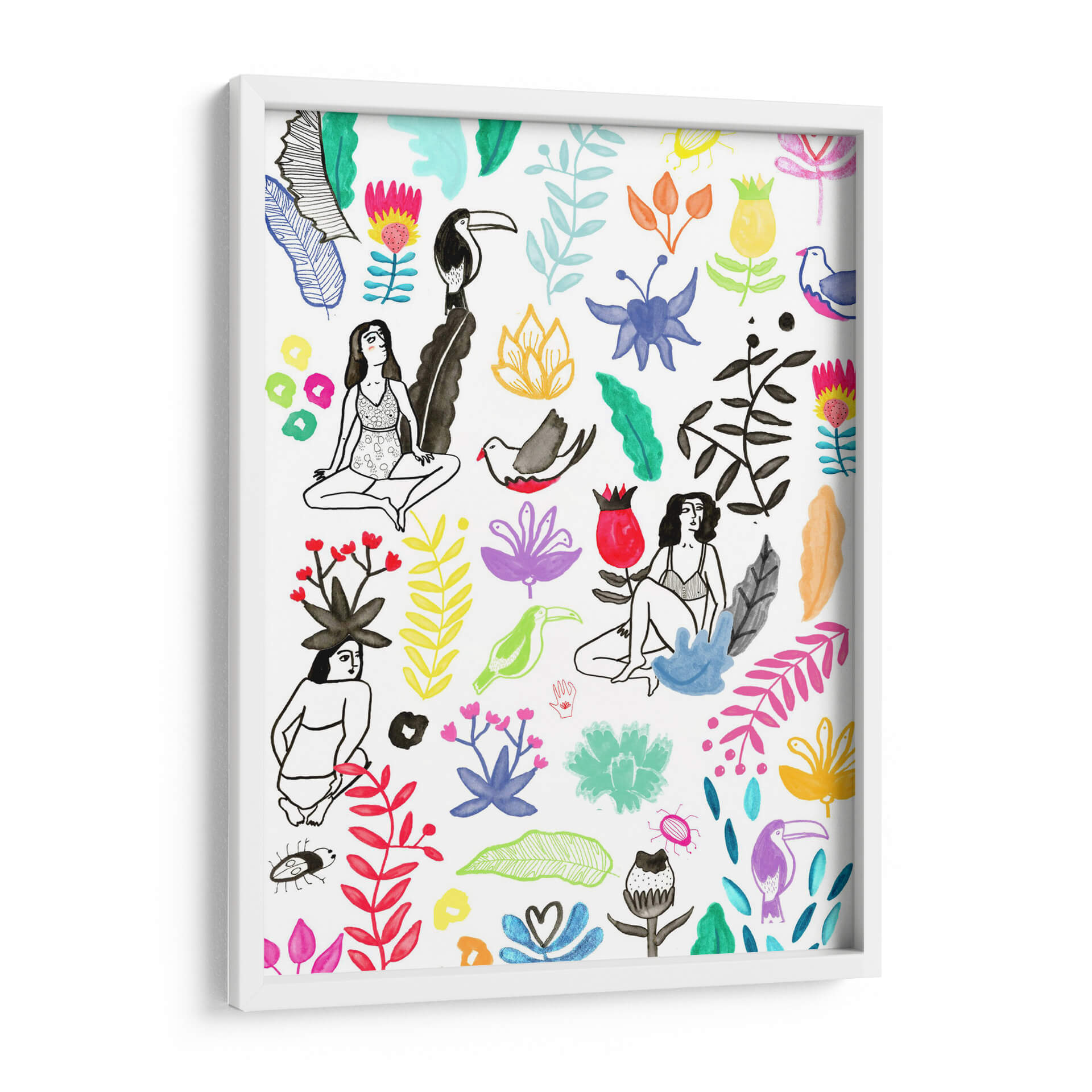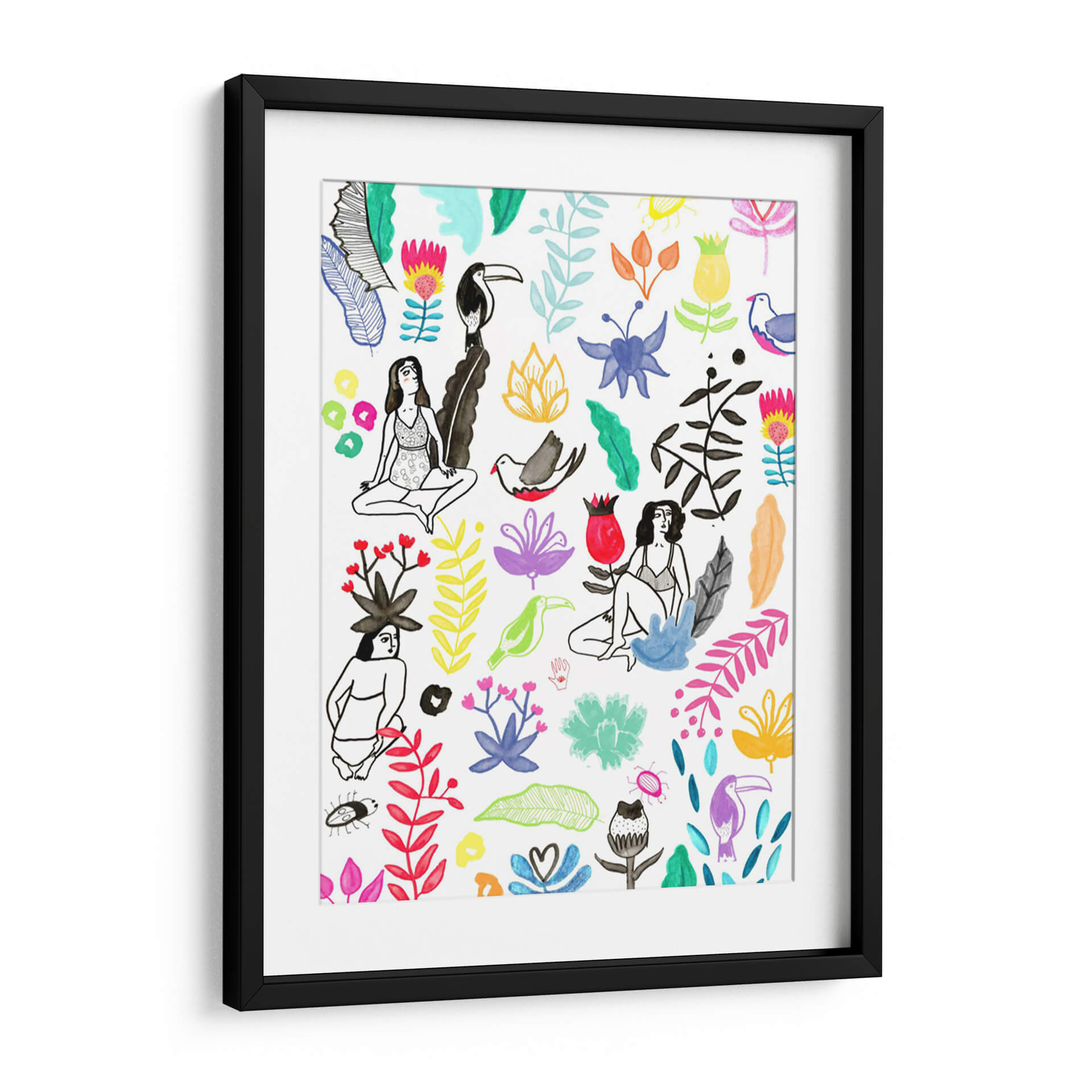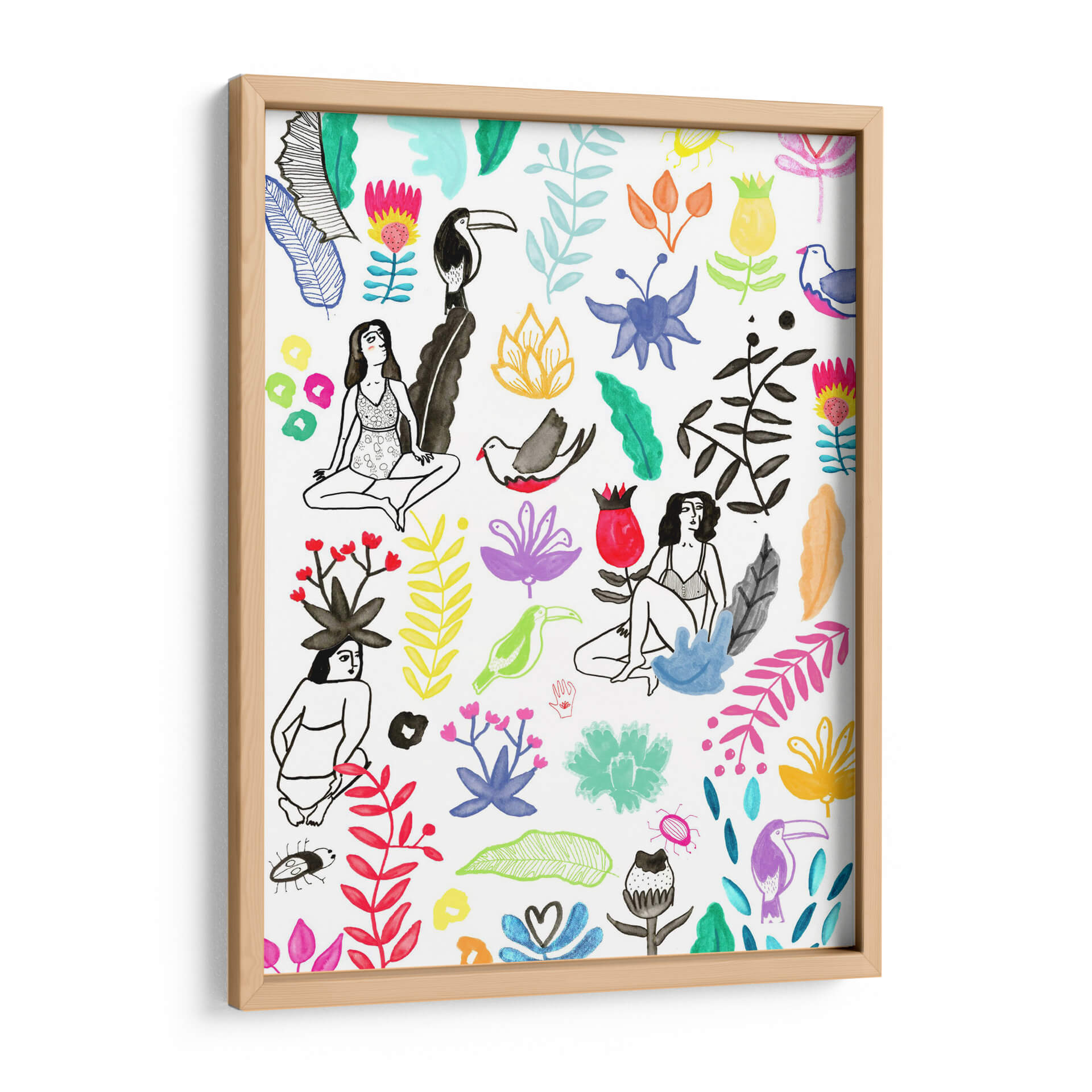 Sumérgete en un universo vibrante y juguetón con este cuadro decorativo que celebra la exuberancia de la naturaleza y la figura femenina. La obra, titulada 'Ilustración botánica', presenta un derroche de color con una paleta que incluye tonos intensos de rosa, verde, amarillo, azul y morado, creando una atmósfera alegre y llena de vida. Se aprecia un estilo de ilustración moderno y espontáneo, con trazos que evocan acuarelas y un acabado que parece casi artesanal. La composición está repleta de elementos botánicos diversos, como hojas estilizadas, flores exóticas y capullos, intercalados con representaciones de aves tropicales, como tucanes, y figuras femeninas serenas en poses meditativas o contemplativas. La repetición de formas y la profusión de detalles invitan a una exploración visual continua, descubriendo nuevas interpretaciones en cada mirada. Este cuadro decorativo es perfecto para añadir un toque de frescura, creatividad y personalidad a cualquier espacio, desde una sala de estar contemporánea hasta un rincón de lectura acogedor en un dormitorio o un despacho que necesite una inyección de optimismo. Transmite una sensación de conexión con la naturaleza y un espíritu libre, ideal para quienes buscan arte que inspire y eleve el ánimo.