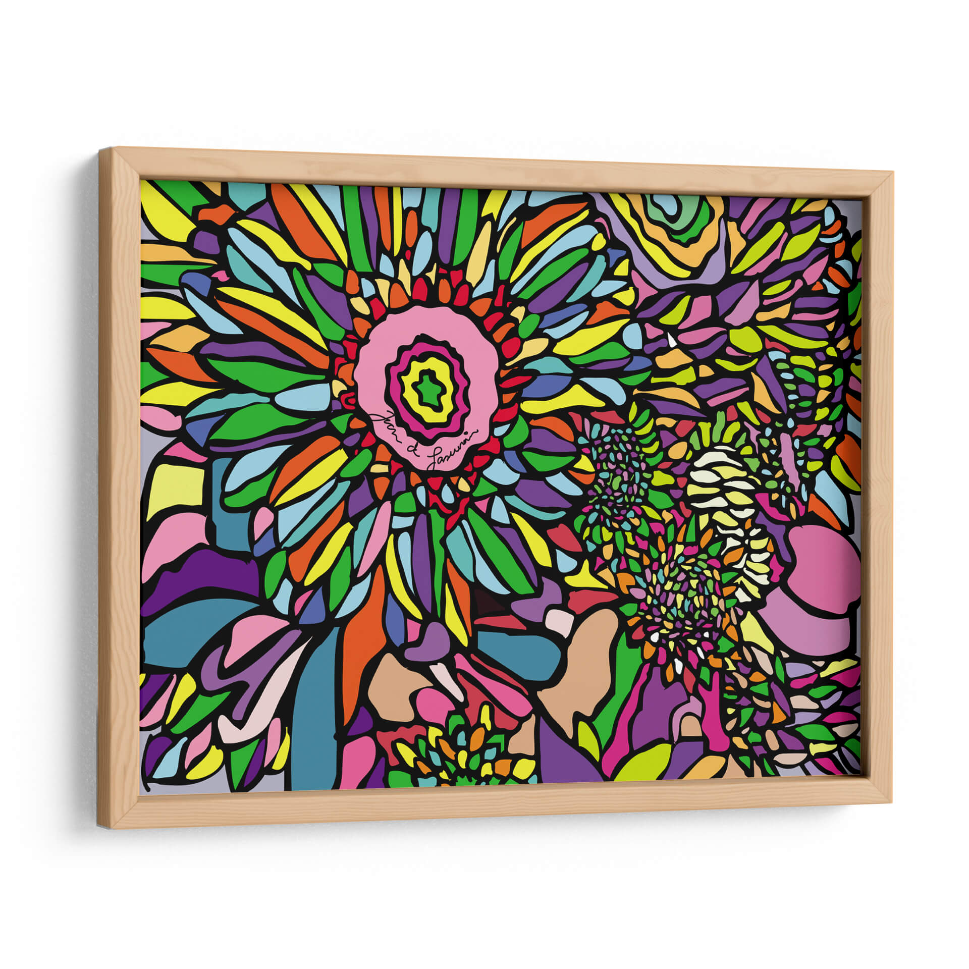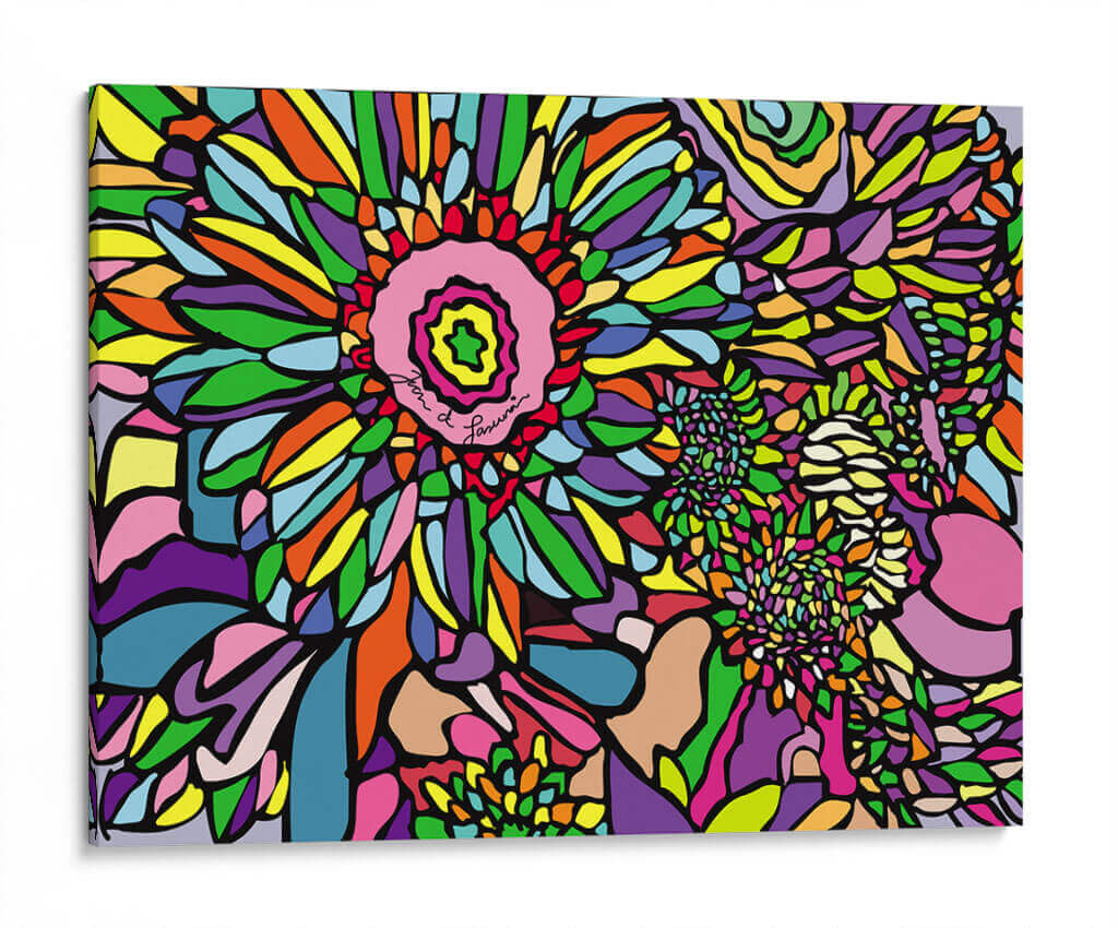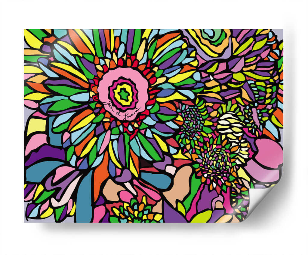Sumérgete en la explosión de color y vida que ofrece el cuadro "Jardín de Flores" de Juan de Lascurain. Esta obra de arte contemporáneo es una celebración vibrante de la naturaleza, representada a través de formas orgánicas y una paleta de colores audaz y alegre. Cada pétalo, hoja y pétalo secundario se ha delineado con precisión, creando un efecto de vitral moderno que atrapa la mirada. Los tonos vibrantes como el fucsia, el naranja, el amarillo y el verde se entrelazan con azules profundos y morados intensos, generando una energía visual estimulante que transforma cualquier espacio. El estilo, que recuerda a una interpretación moderna del fauvismo o el arte pop, se caracteriza por sus contornos definidos y la ausencia de sombreados, lo que otorga a la composición una cualidad gráfica y atemporal. Este cuadro decorativo es ideal para añadir un toque de vitalidad y optimismo a salones modernos, oficinas creativas o incluso dormitorios que busquen un punto focal dinámico. La firma del artista, integrada sutilmente en el centro de la flor principal, añade un toque de autenticidad a esta pieza única. "Jardín de Flores" no es solo una obra de arte, es una inyección de alegría y estilo para tu hogar.