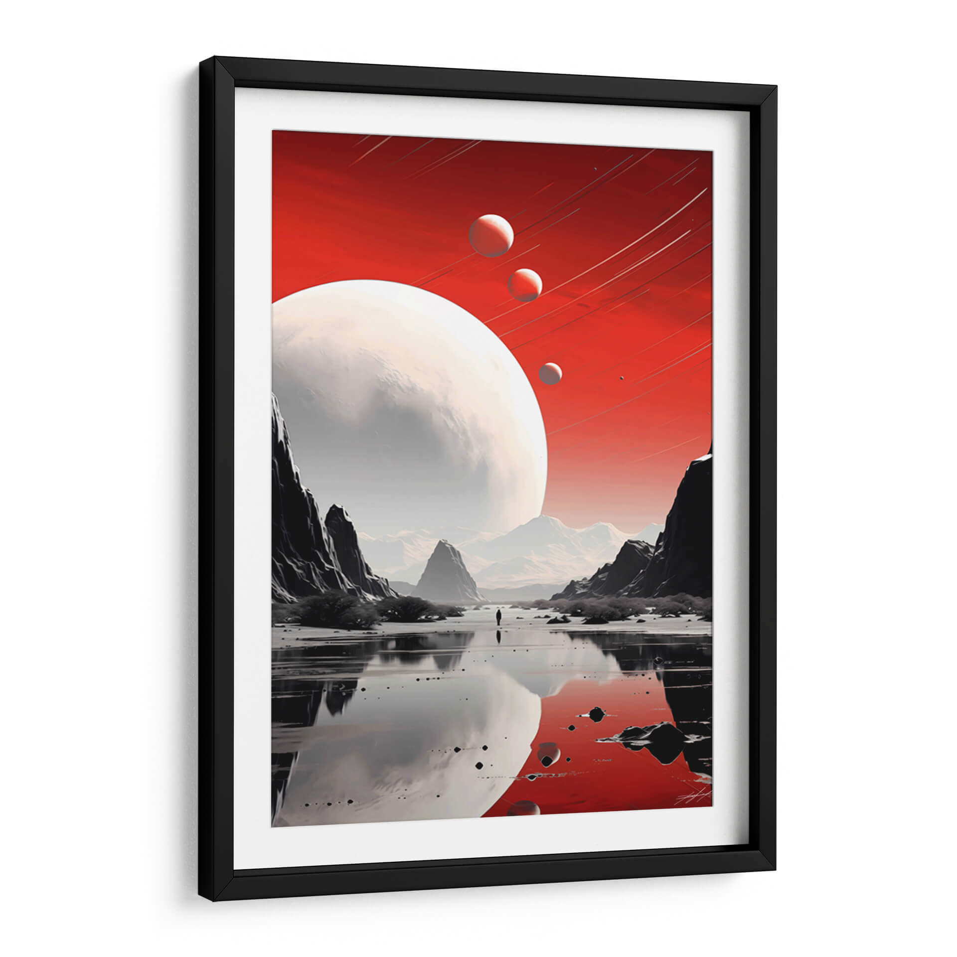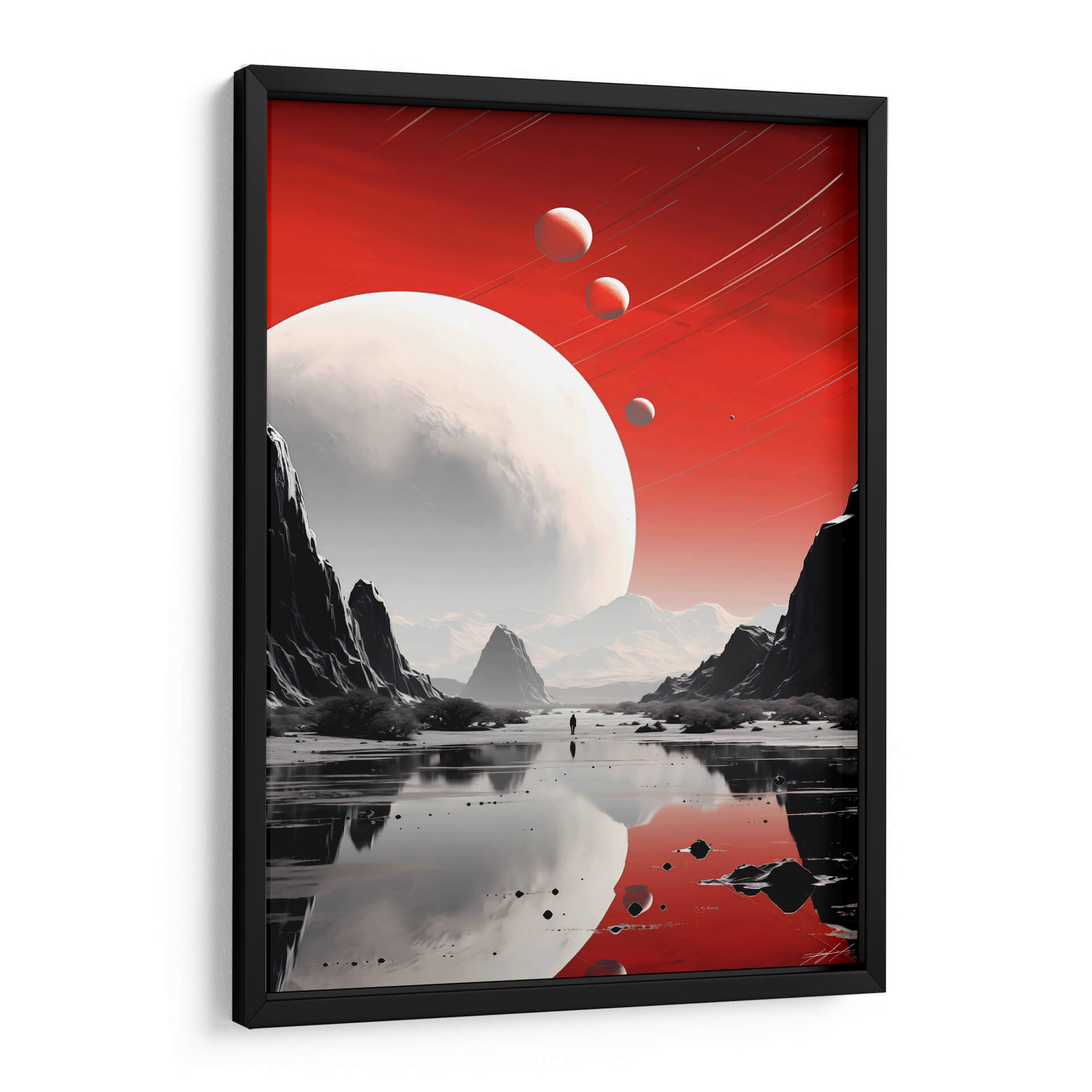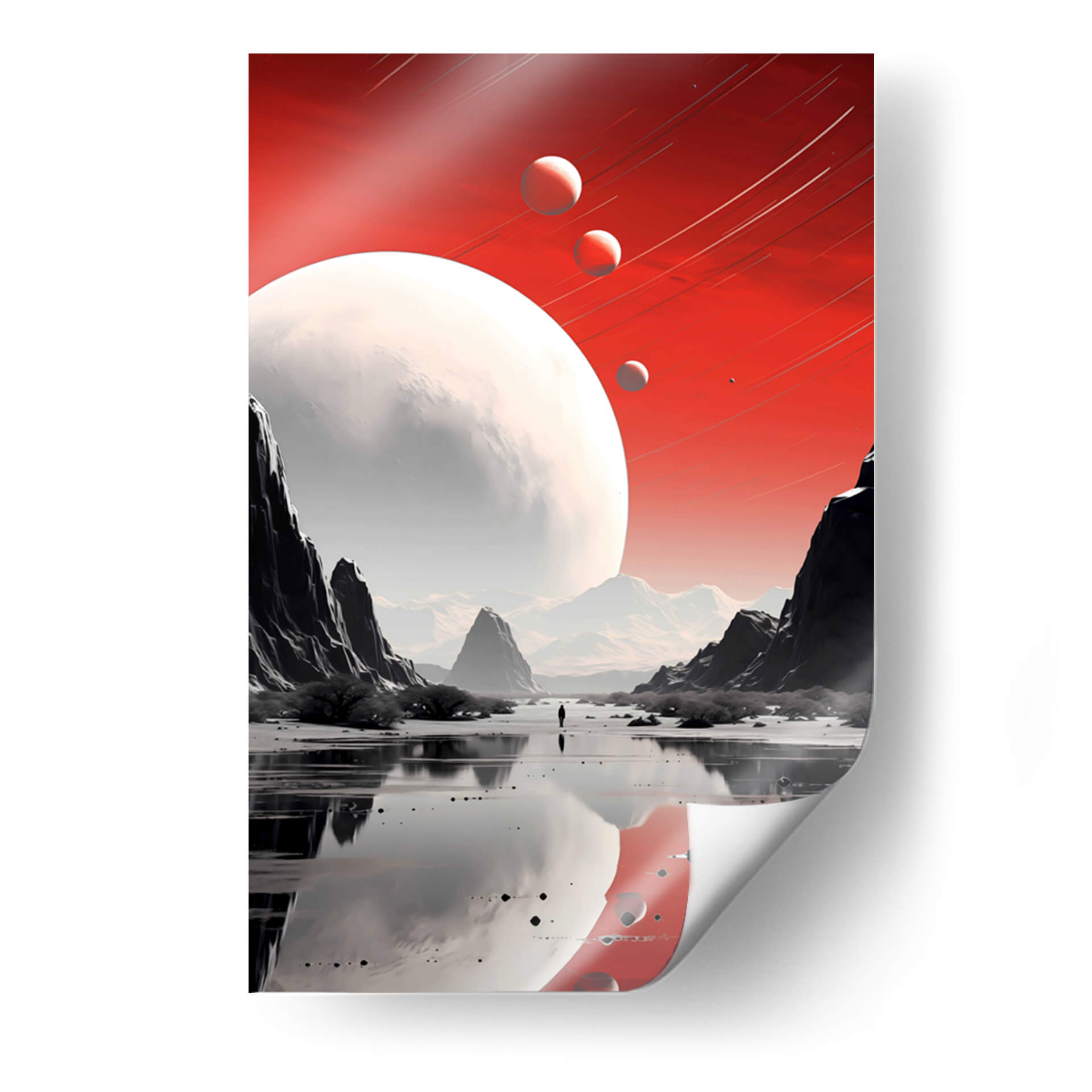 Sumérgete en la vastedad del cosmos con "Mi Espacio - 12", una obra de arte digital que te transporta a un paisaje extraterrestre de ensueño. La pieza presenta un cielo de un vibrante rojo intenso, dominado por un gigantesco planeta blanco o luna que se cierne majestuosamente sobre un terreno rocoso y un espejo de agua sereno. Figuras solitarias en la distancia invitan a la introspección, mientras que las montañas escarpadas y los cuerpos celestes menores añaden profundidad y misterio a la composición. La paleta de colores, aunque marcada por el contraste entre el rojo ardiente y los tonos fríos de grises y blancos, crea una atmósfera de asombro y exploración. Este cuadro decorativo es perfecto para aquellos que buscan infundir a sus espacios un sentido de aventura, soledad contemplativa o una conexión con lo desconocido. Ideal para salas de estar modernas, estudios o cualquier rincón donde desees añadir un toque de ciencia ficción y reflexión existencial. "Mi Espacio - 12" es más que una imagen; es una invitación a contemplar nuestro lugar en el universo y a encontrar belleza en la inmensidad.