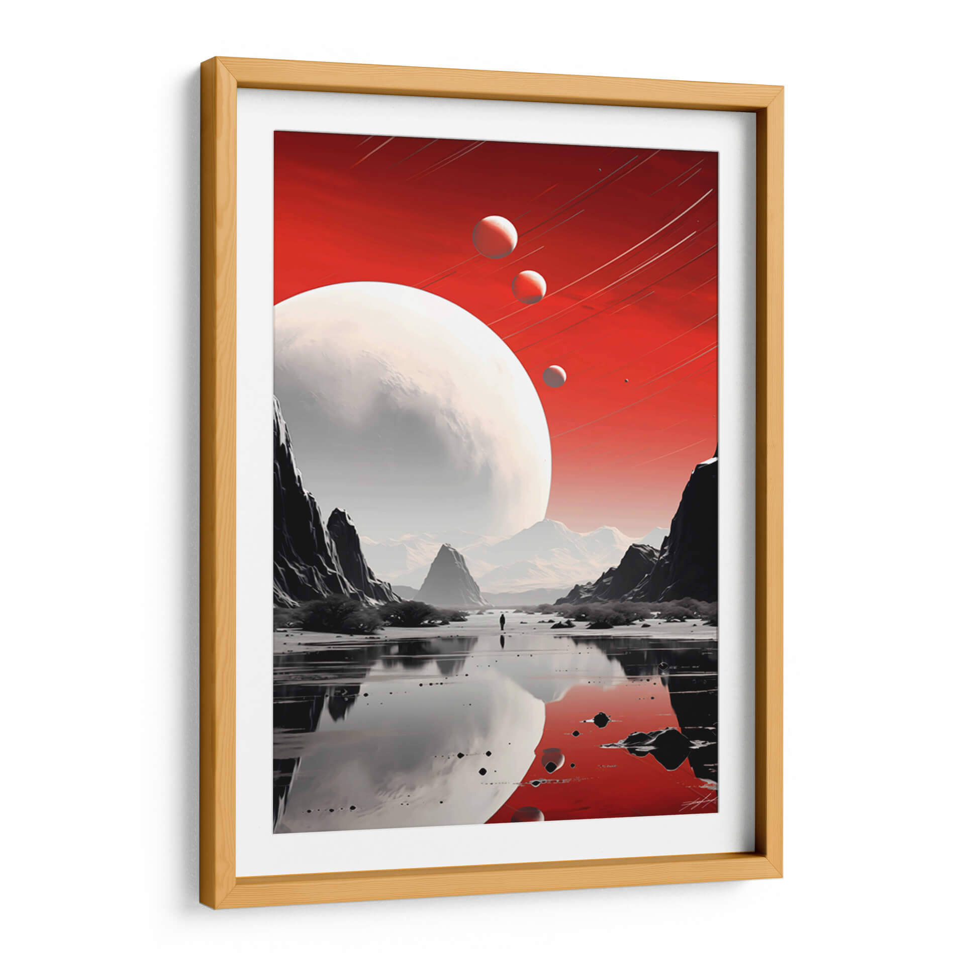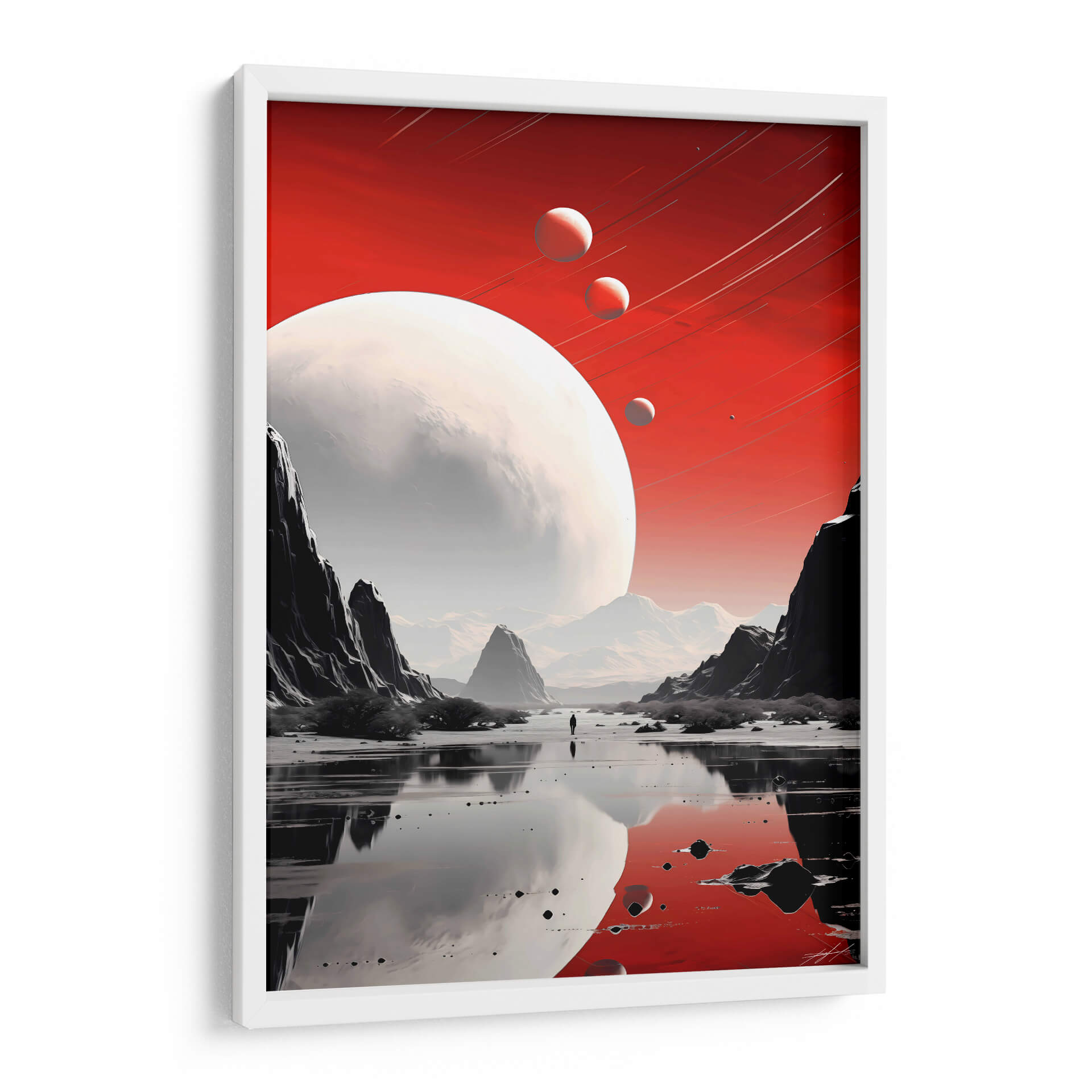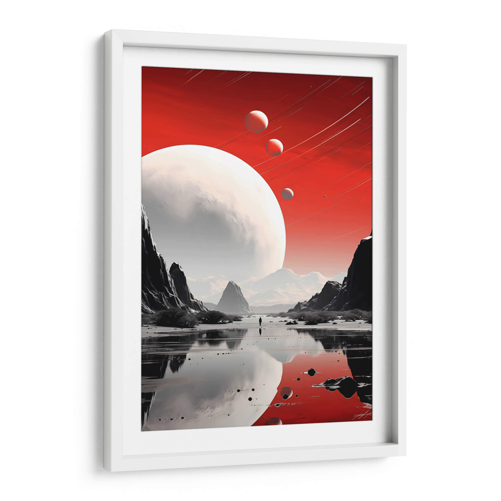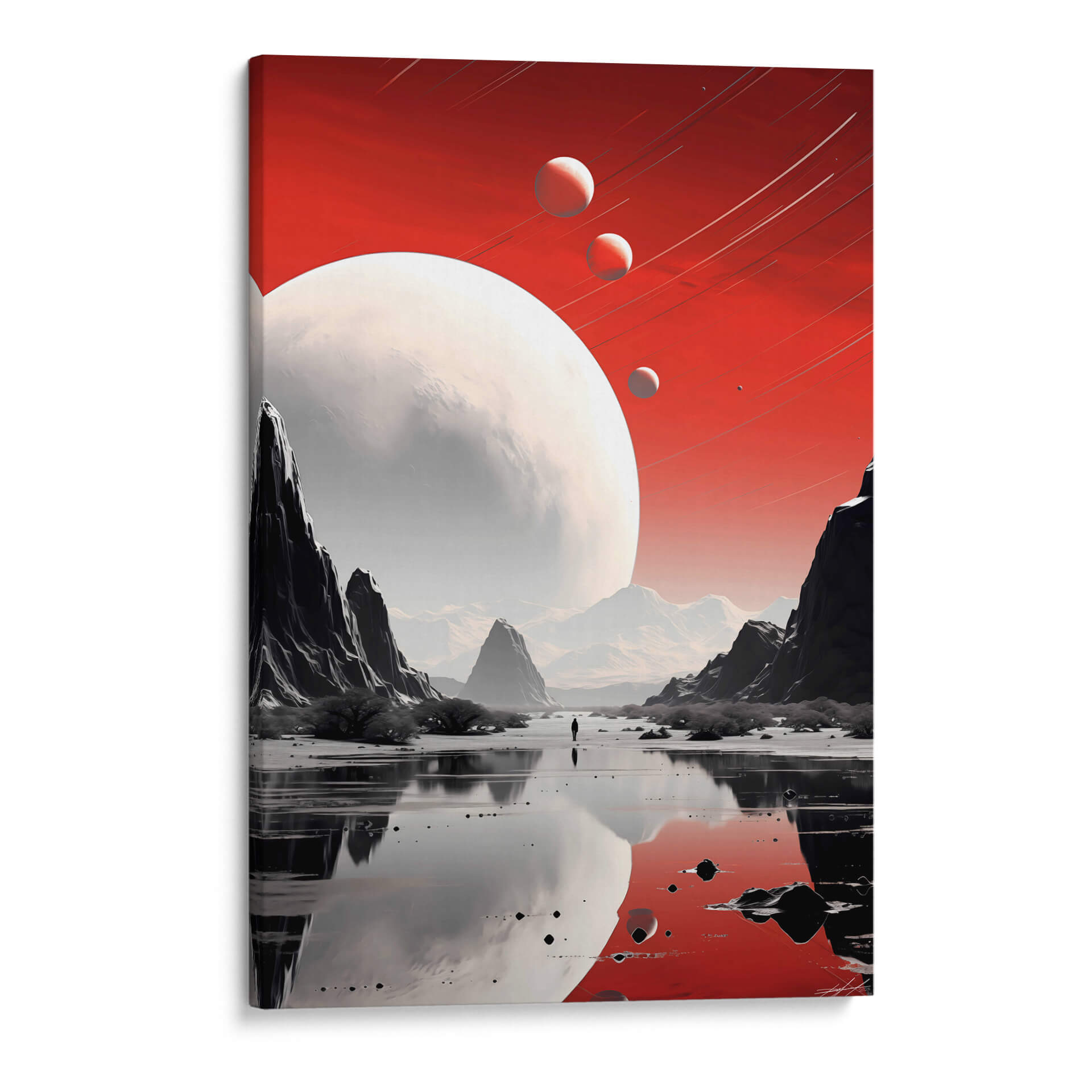 Sumérgete en la vastedad del cosmos con "Mi Espacio - 12", una obra de arte digital que te transporta a un paisaje extraterrestre de ensueño. La pieza presenta un cielo de un vibrante rojo intenso, dominado por un gigantesco planeta blanco o luna que se cierne majestuosamente sobre un terreno rocoso y un espejo de agua sereno. Figuras solitarias en la distancia invitan a la introspección, mientras que las montañas escarpadas y los cuerpos celestes menores añaden profundidad y misterio a la composición. La paleta de colores, aunque marcada por el contraste entre el rojo ardiente y los tonos fríos de grises y blancos, crea una atmósfera de asombro y exploración. Este cuadro decorativo es perfecto para aquellos que buscan infundir a sus espacios un sentido de aventura, soledad contemplativa o una conexión con lo desconocido. Ideal para salas de estar modernas, estudios o cualquier rincón donde desees añadir un toque de ciencia ficción y reflexión existencial. "Mi Espacio - 12" es más que una imagen; es una invitación a contemplar nuestro lugar en el universo y a encontrar belleza en la inmensidad.