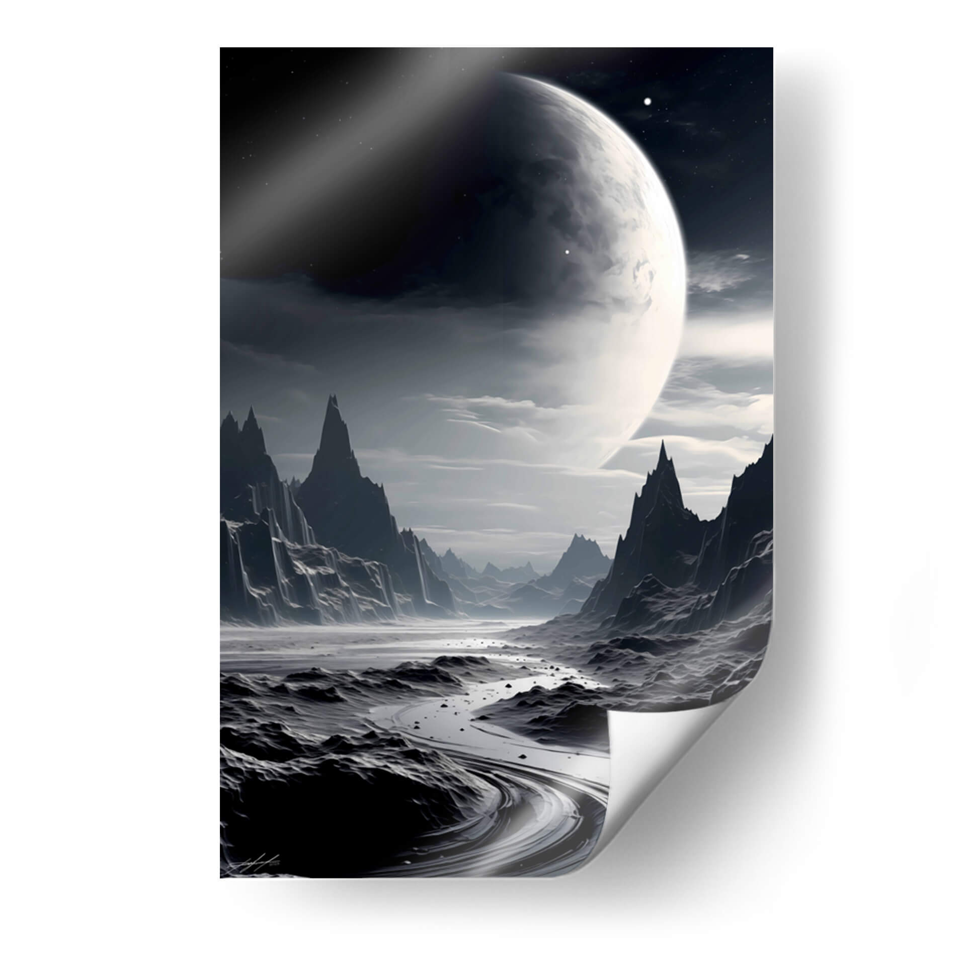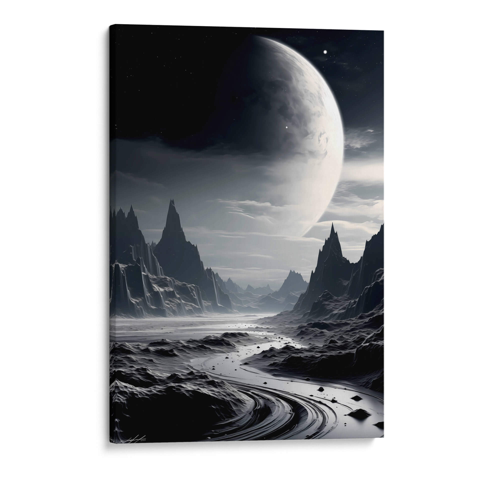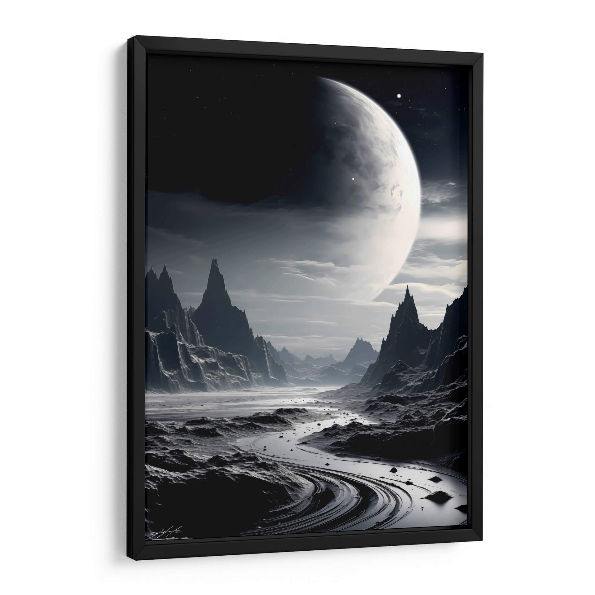 Sumérgete en la inmensidad cósmica con "Mi Espacio - 9", una obra de arte digital que te transporta a paisajes alienígenas y misteriosos. Esta pieza evoca una profunda sensación de asombro y contemplación, presentando un vasto horizonte dominado por una luna gigante o un planeta cercano, envuelto en nubes etéreas. Las imponentes montañas de aspecto rocoso y afilado crean una silueta dramática contra el cielo estrellado y crepuscular, mientras que un río serpenteante fluye a través del terreno desolado, añadiendo un toque de movimiento y misterio. La paleta de colores predominantemente en escala de grises, con sutiles contrastes de luz y sombra, genera una atmósfera de calma introspectiva y maravilla. "Mi Espacio - 9" es ideal para quienes buscan un cuadro decorativo que inspire la imaginación y añada un toque de ciencia ficción o fantasía a su hogar u oficina. Este cuadro decorativo abstracto es perfecto para salas de estar modernas, estudios o cualquier espacio donde se desee fomentar la reflexión y la exploración de lo desconocido. Su composición detallada y la atmósfera envolvente lo convierten en un punto focal cautivador que invita a la conversación y a la ensoñación.