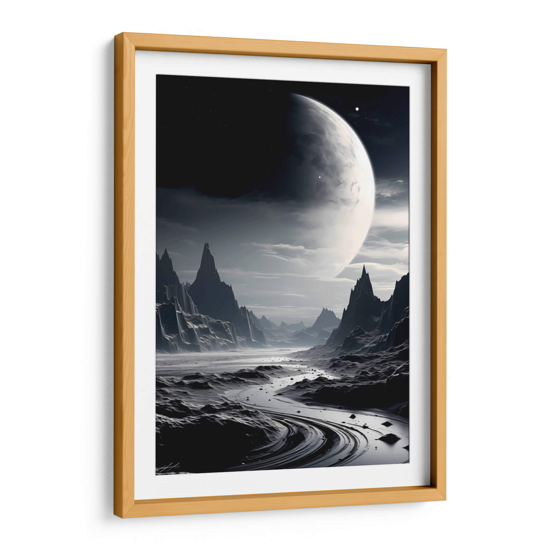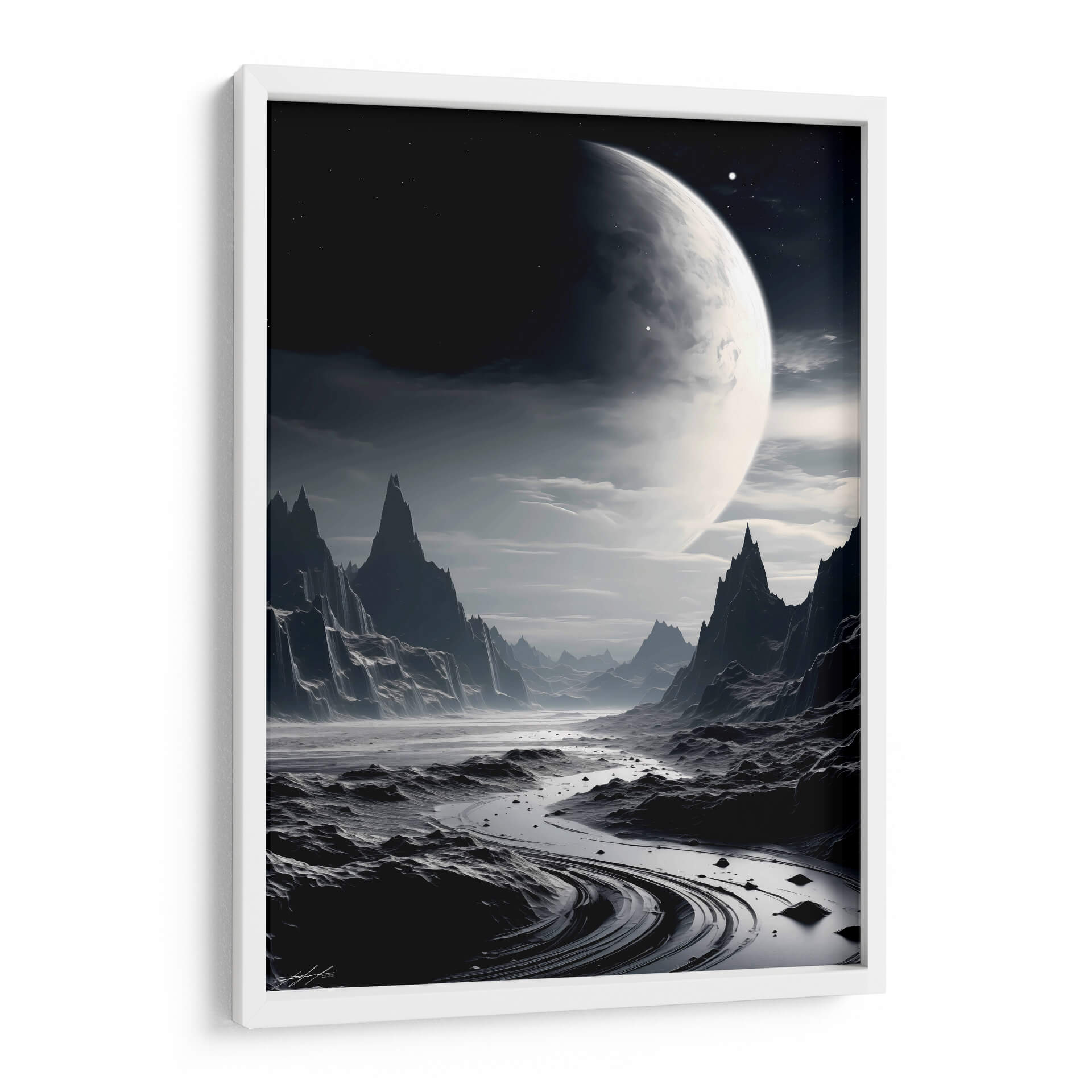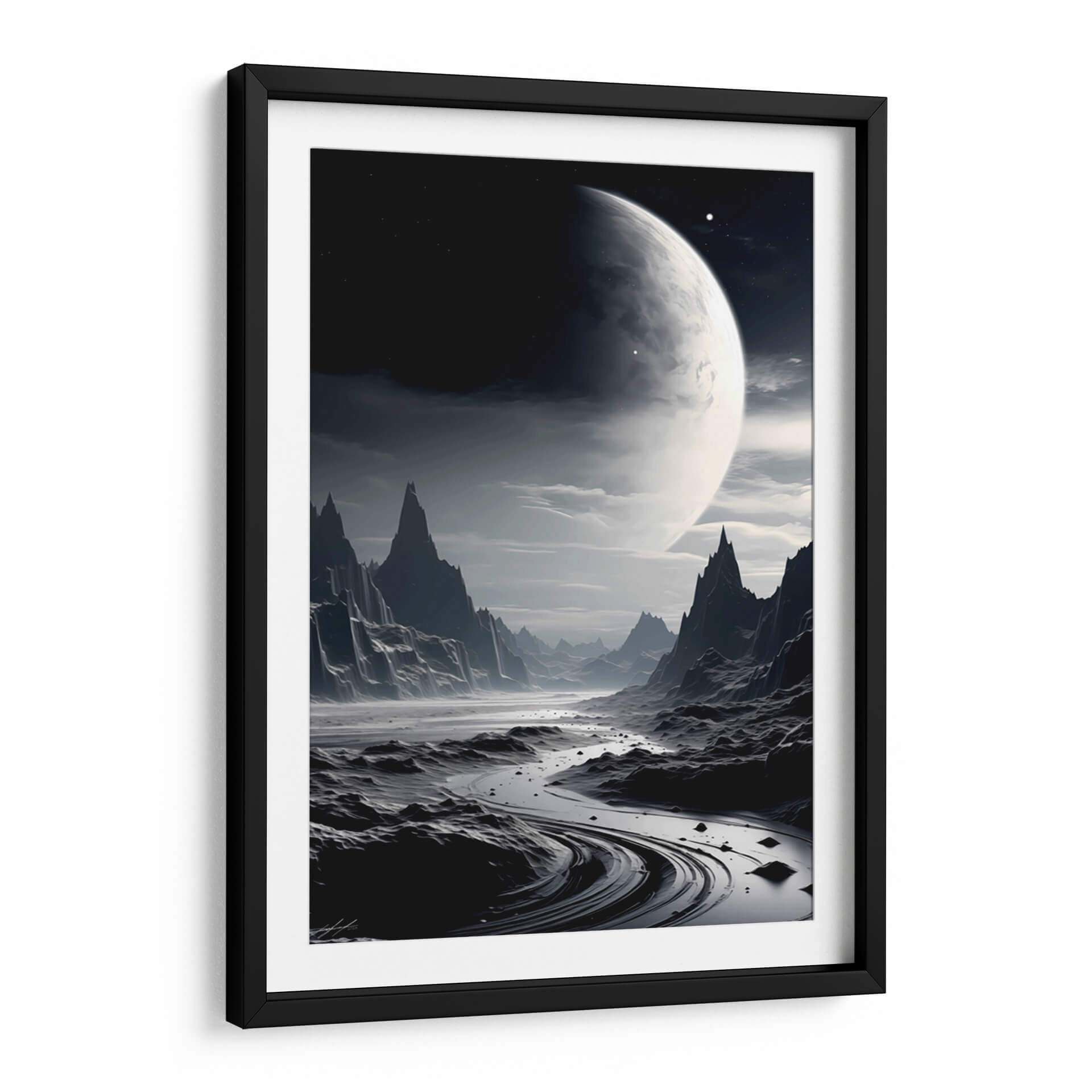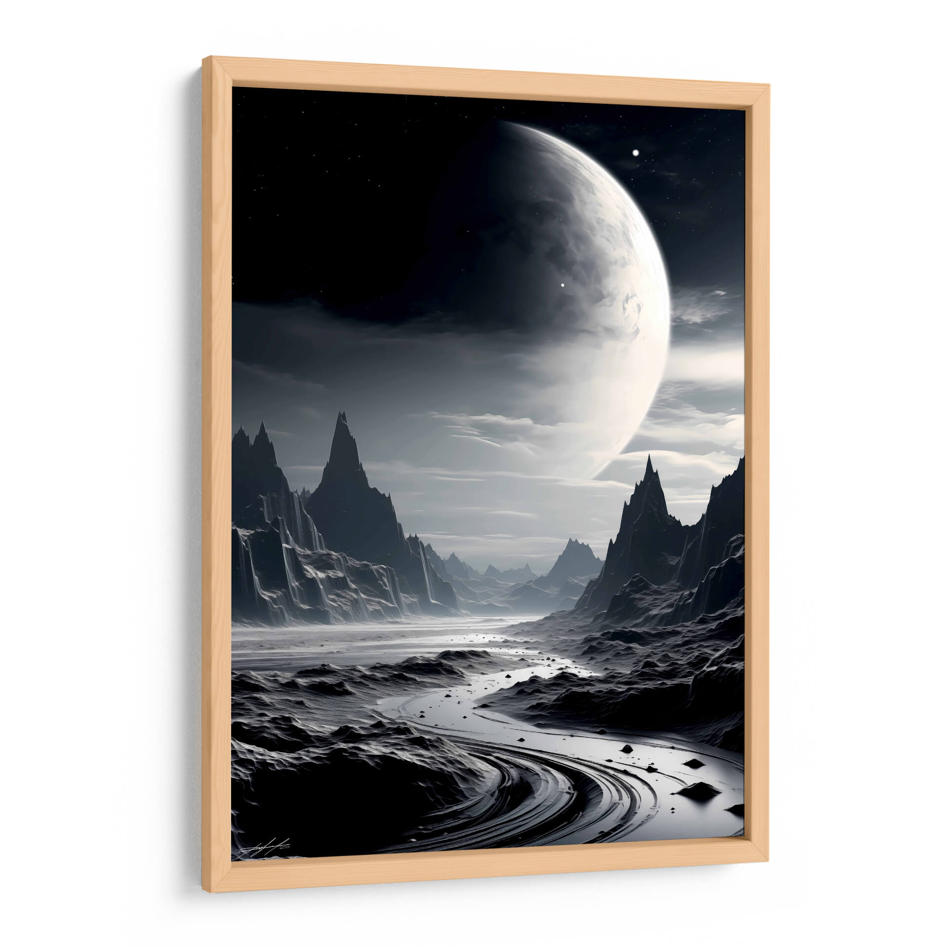 Sumérgete en la inmensidad cósmica con "Mi Espacio - 9", una obra de arte digital que te transporta a paisajes alienígenas y misteriosos. Esta pieza evoca una profunda sensación de asombro y contemplación, presentando un vasto horizonte dominado por una luna gigante o un planeta cercano, envuelto en nubes etéreas. Las imponentes montañas de aspecto rocoso y afilado crean una silueta dramática contra el cielo estrellado y crepuscular, mientras que un río serpenteante fluye a través del terreno desolado, añadiendo un toque de movimiento y misterio. La paleta de colores predominantemente en escala de grises, con sutiles contrastes de luz y sombra, genera una atmósfera de calma introspectiva y maravilla. "Mi Espacio - 9" es ideal para quienes buscan un cuadro decorativo que inspire la imaginación y añada un toque de ciencia ficción o fantasía a su hogar u oficina. Este cuadro decorativo abstracto es perfecto para salas de estar modernas, estudios o cualquier espacio donde se desee fomentar la reflexión y la exploración de lo desconocido. Su composición detallada y la atmósfera envolvente lo convierten en un punto focal cautivador que invita a la conversación y a la ensoñación.