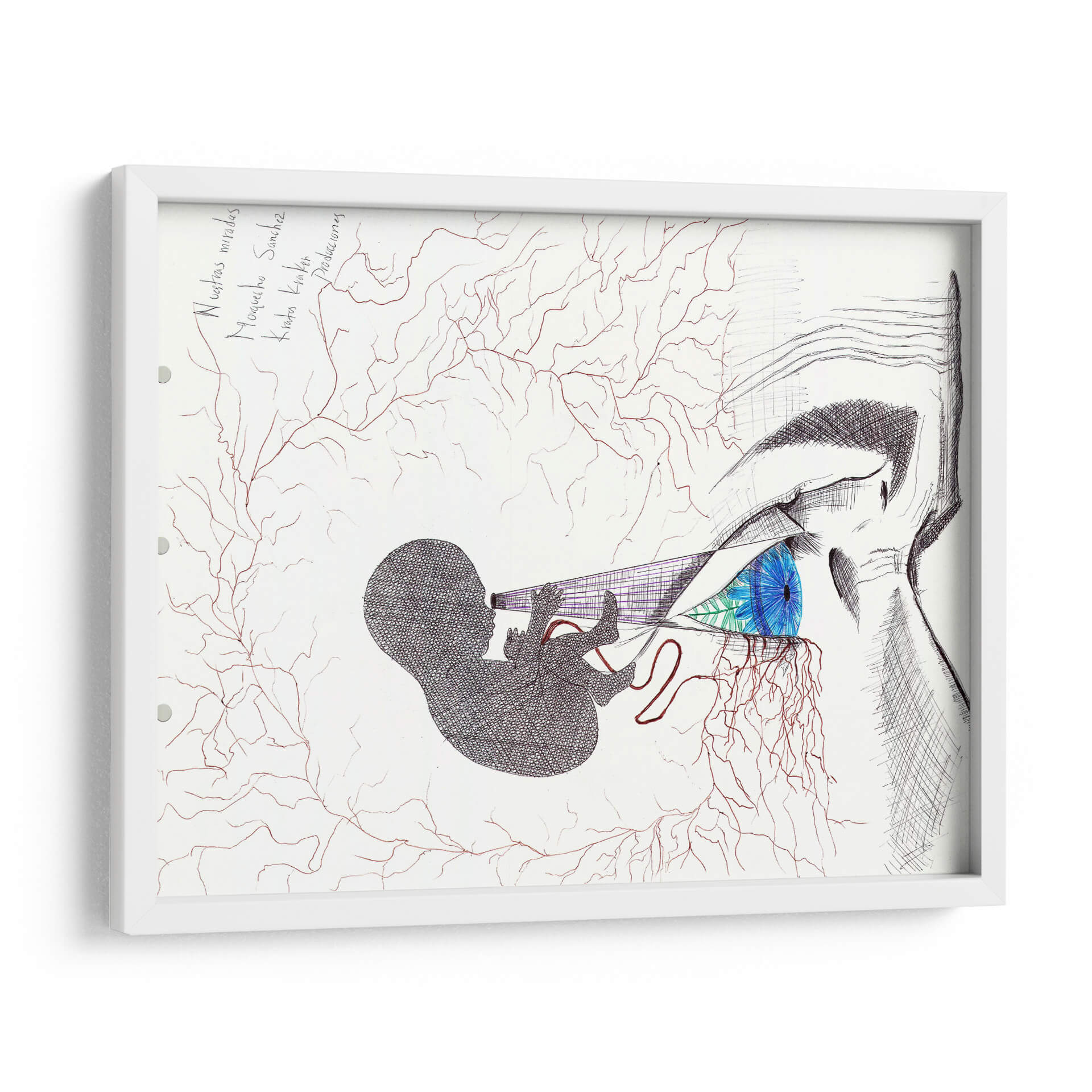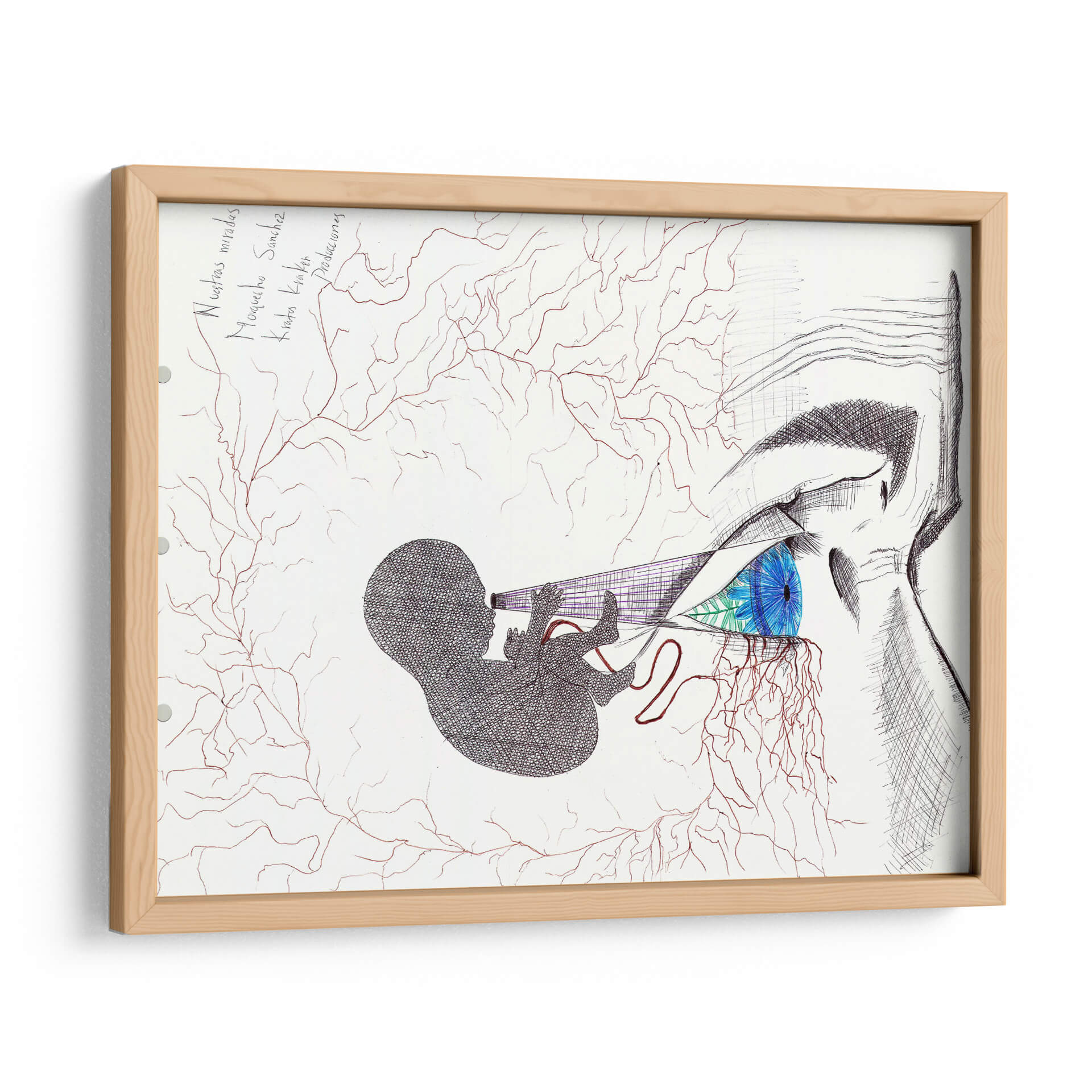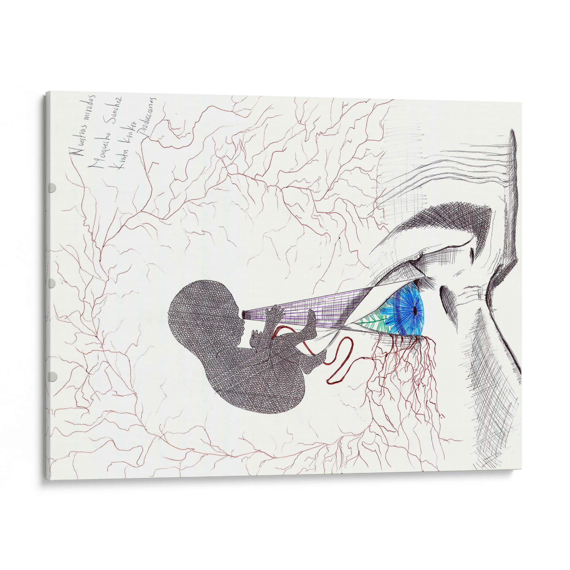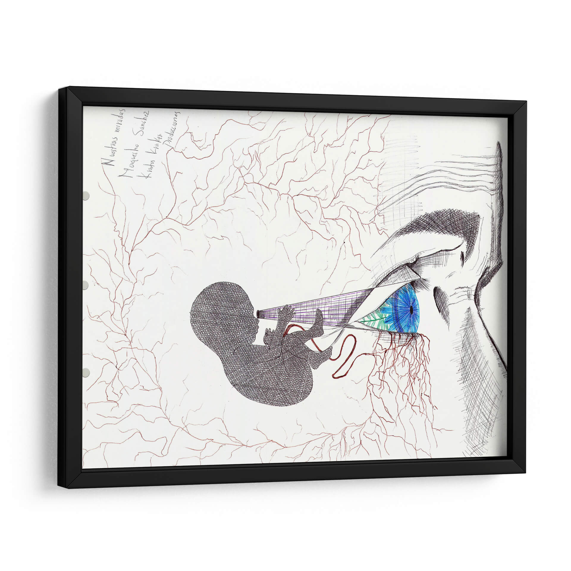 Sumérgete en la profunda conexión humana y la exploración de la identidad con 'Nuestras Miradas', una obra de arte contemporáneo del artista Morquecho Sánchez. Este cuadro decorativo abstracto presenta una composición intrigante que fusiona la silueta de un feto con un ojo humano vibrante, sugiriendo el nacimiento de la conciencia y la interconexión de todas las vidas. La paleta de colores, dominada por el azul eléctrico del iris, contrastado con las sutiles notas verdes y los delicados trazos rojos que evocan un sistema circulatorio o neuronal, crea una atmósfera de misterio y vitalidad. Los detalles en técnica mixta, con sombreados y texturas, aportan profundidad y complejidad visual. Ideal para espacios que buscan un toque de reflexión y originalidad, como un estudio, una oficina o una sala de estar moderna, 'Nuestras Miradas' invita a la contemplación sobre el origen, la percepción y el futuro. Transforma tu pared con esta pieza que no solo decora, sino que también inspira diálogo y pensamiento crítico. Es una adición poderosa a cualquier colección de arte que aprecie lo conceptual y lo visualmente impactante.